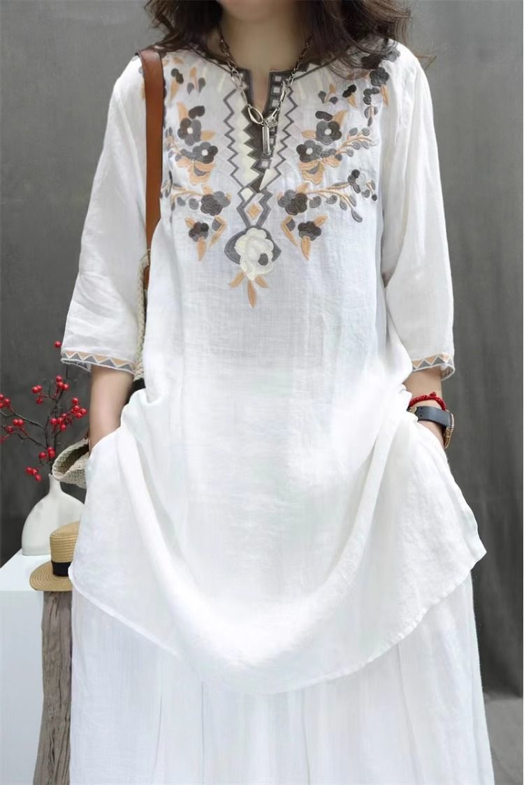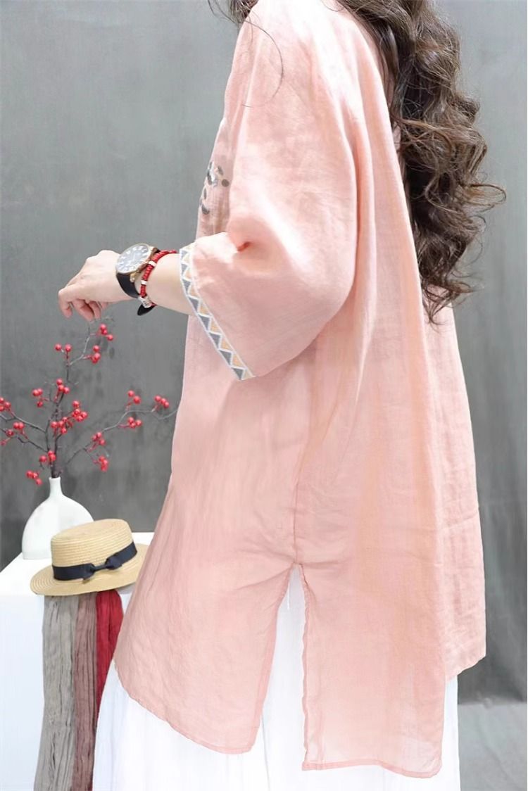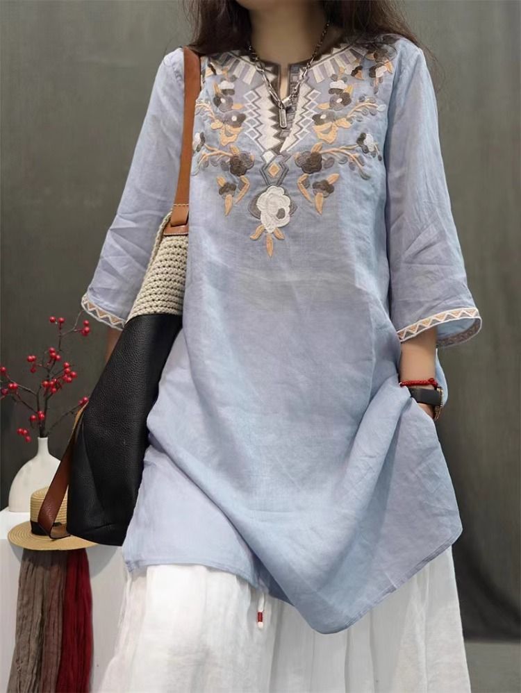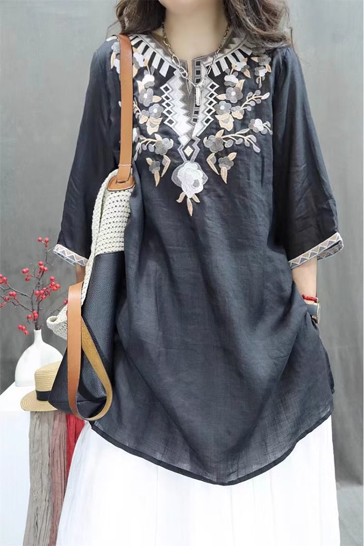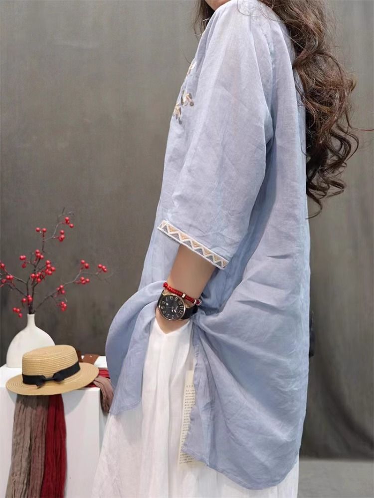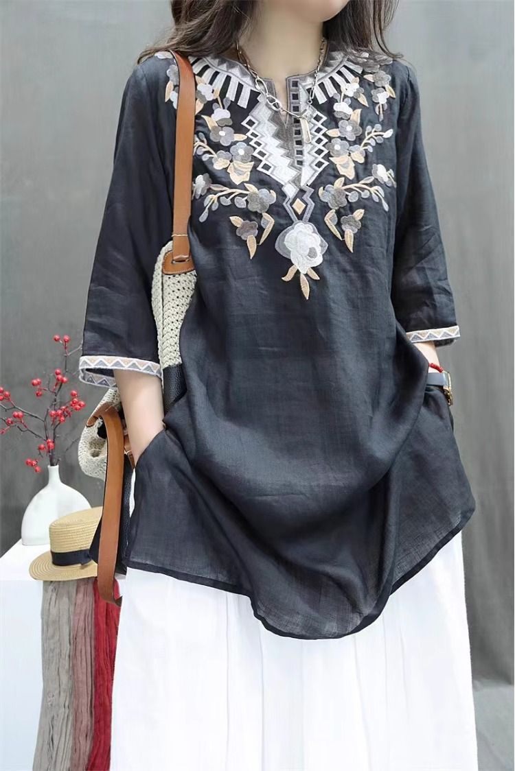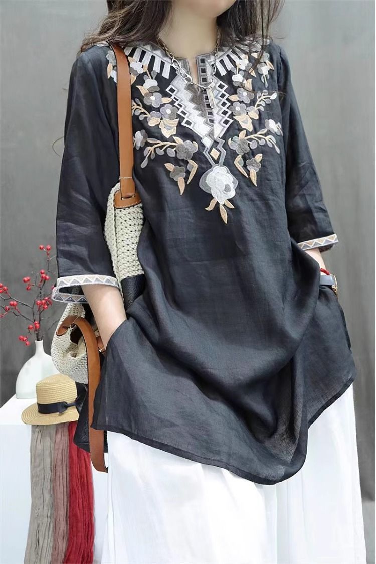 여름 중공업 여성복 복고풍 자수 중간 길이 루즈한 면 및 린넨 스타일 셔츠 캐주얼 예술적 풀오버 탑스토어 가기