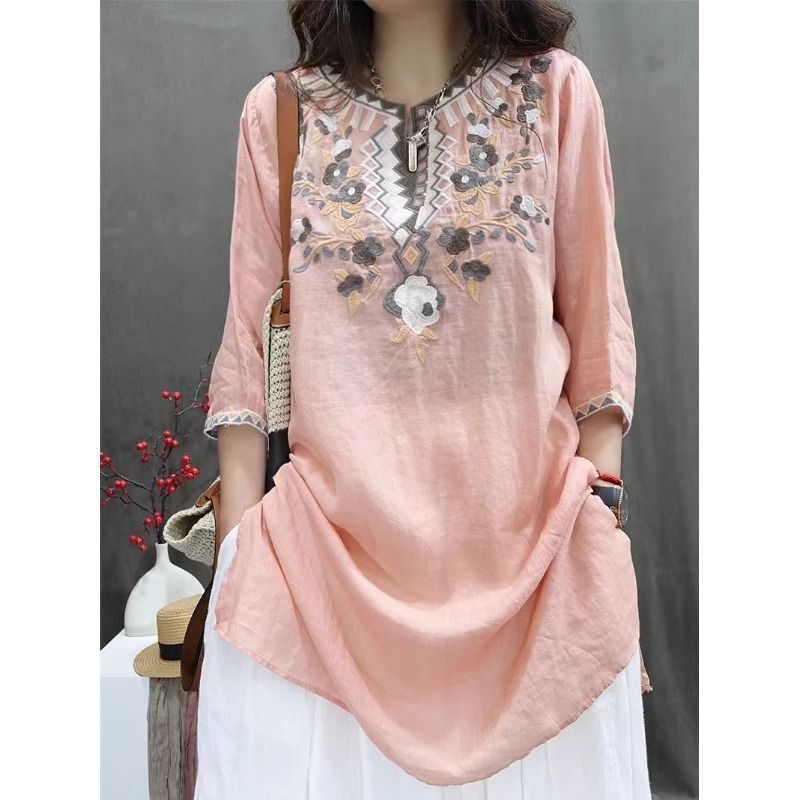 여름 중공업 여성복 복고풍 자수 중간 길이 루즈한 면 및 린넨 스타일 셔츠 캐주얼 예술적 풀오버 탑
