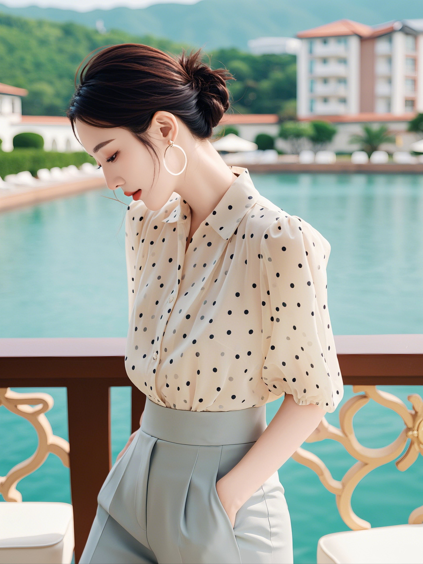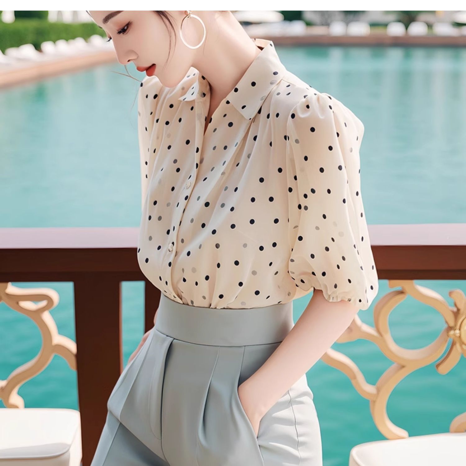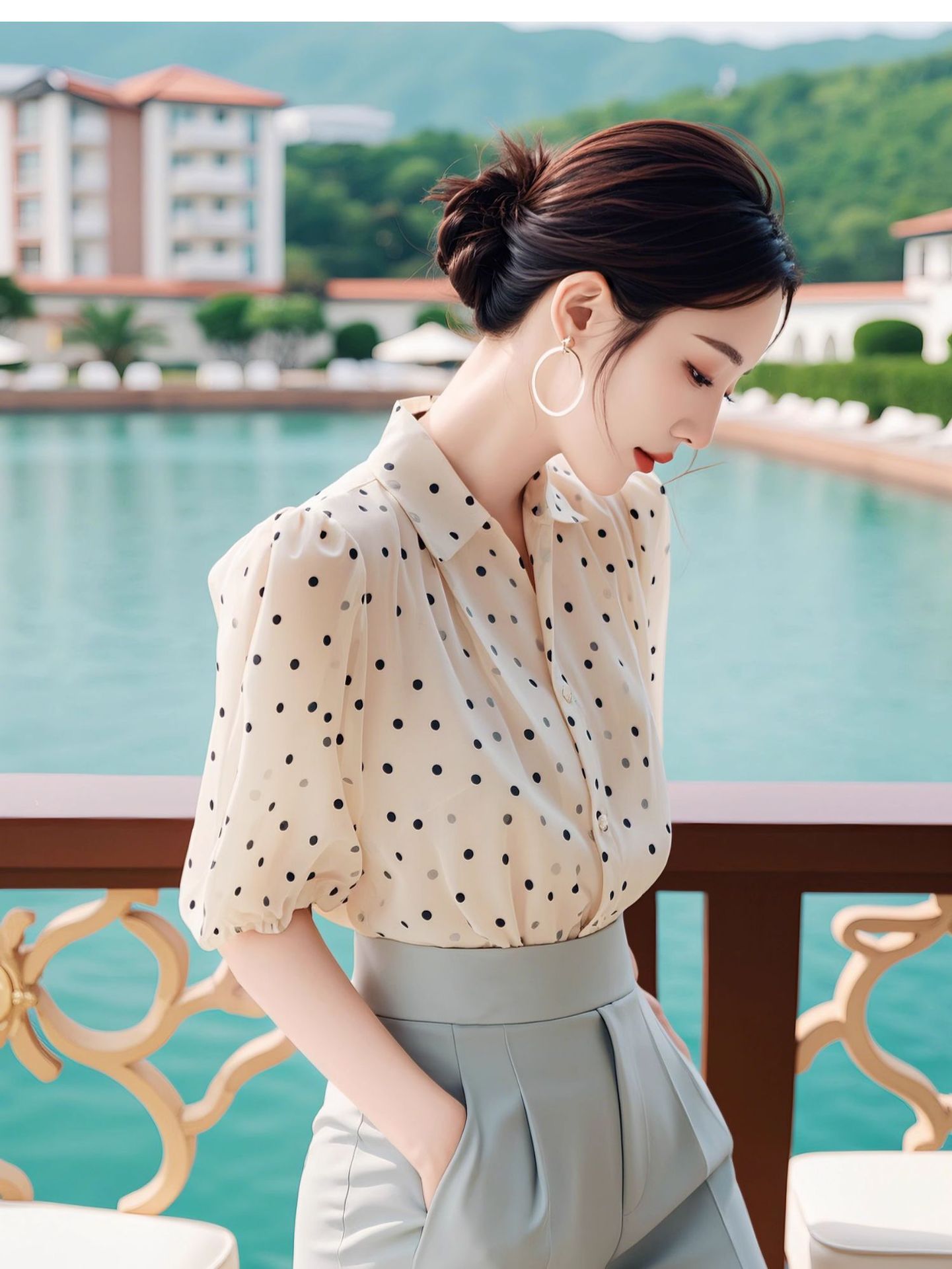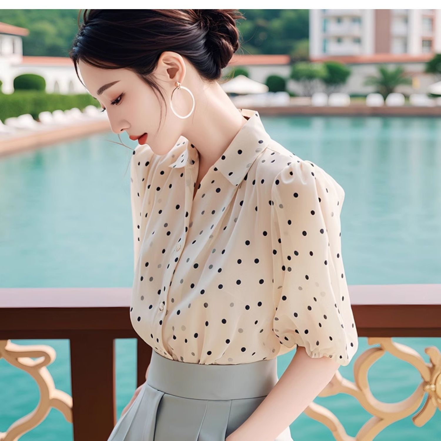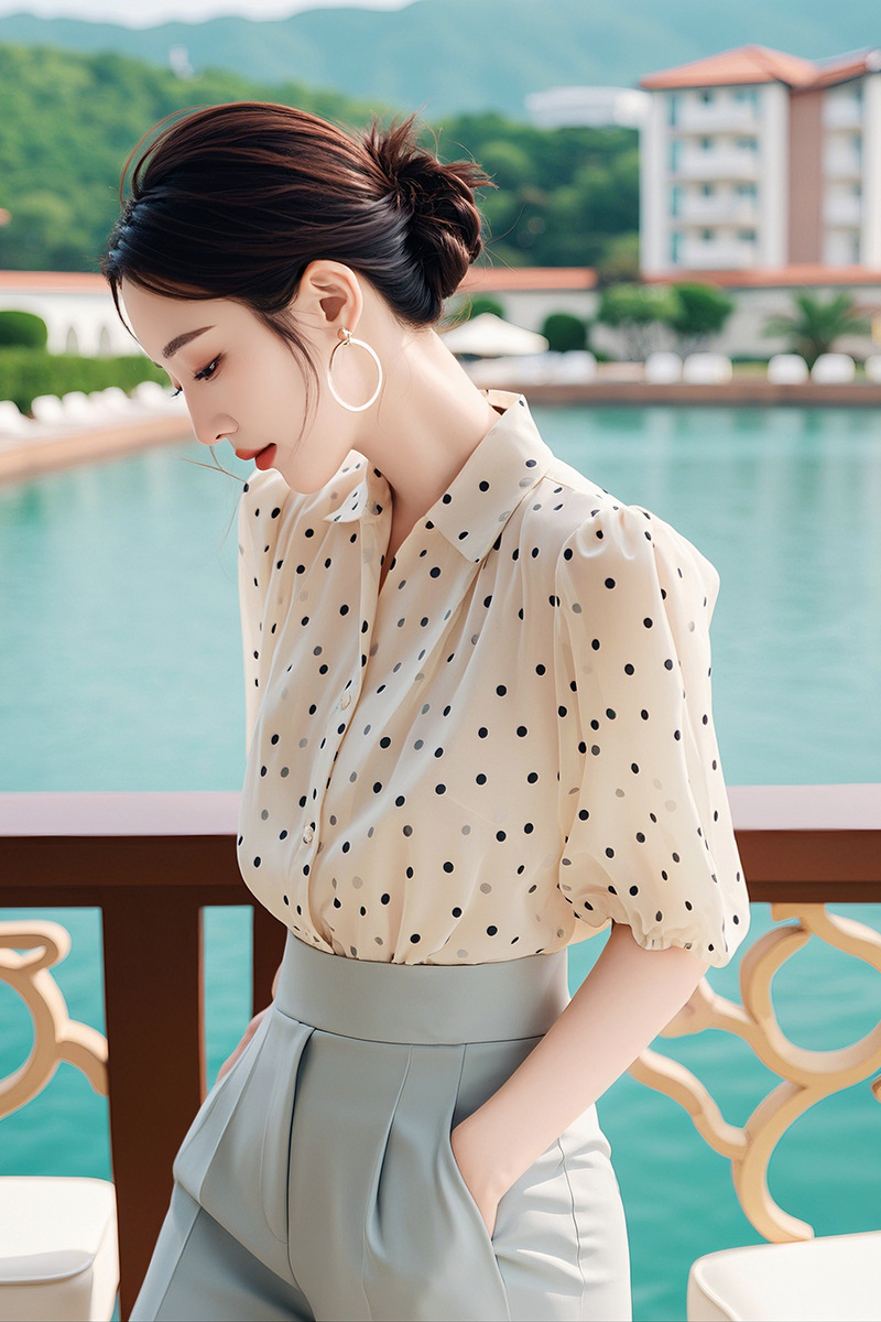 독특하고 세련된 웨이브 도트 쉬폰 셔츠 여성의 2024 여름 새로운 프랑스 젠틀 우아한 탑 아름다운 작은 셔츠스토어 가기