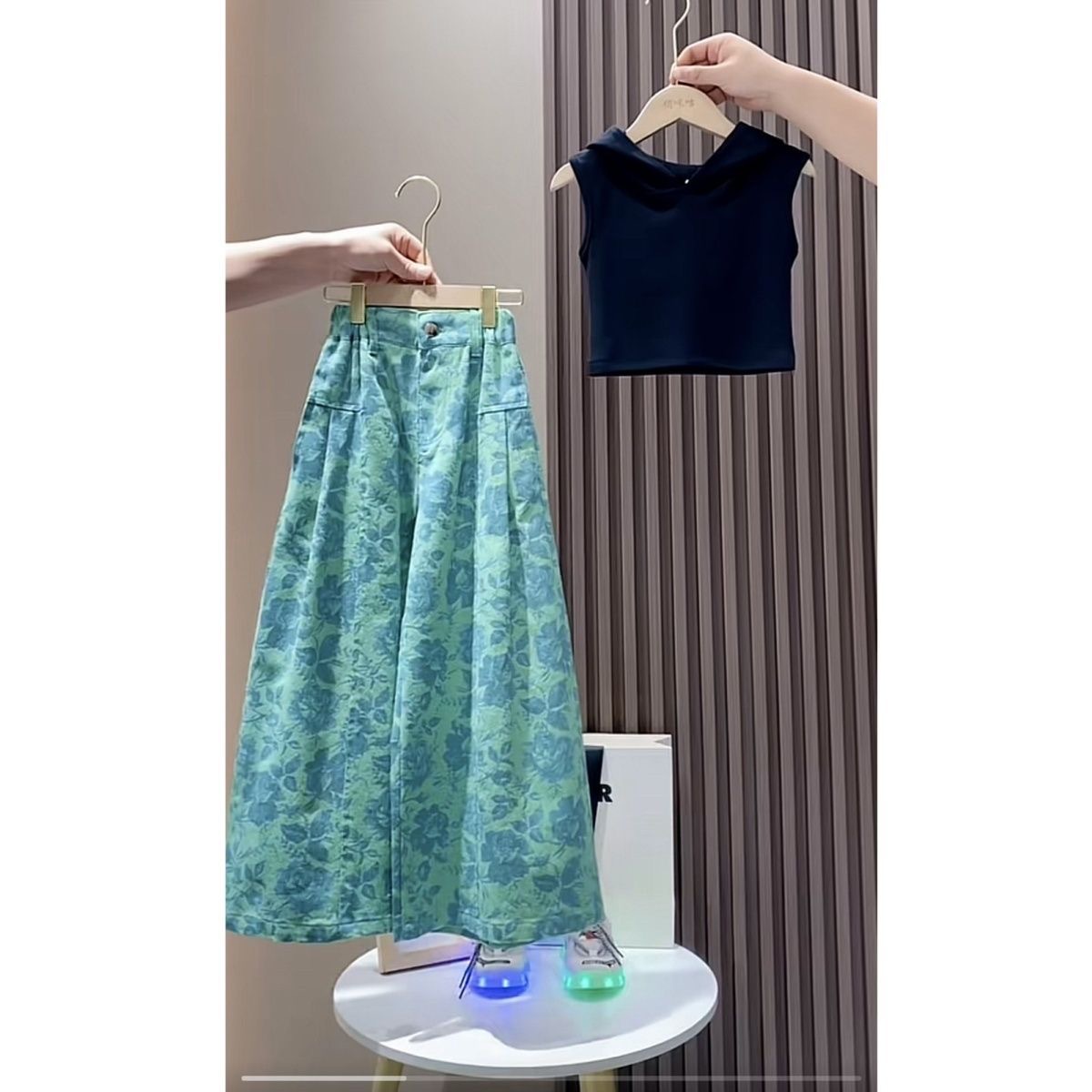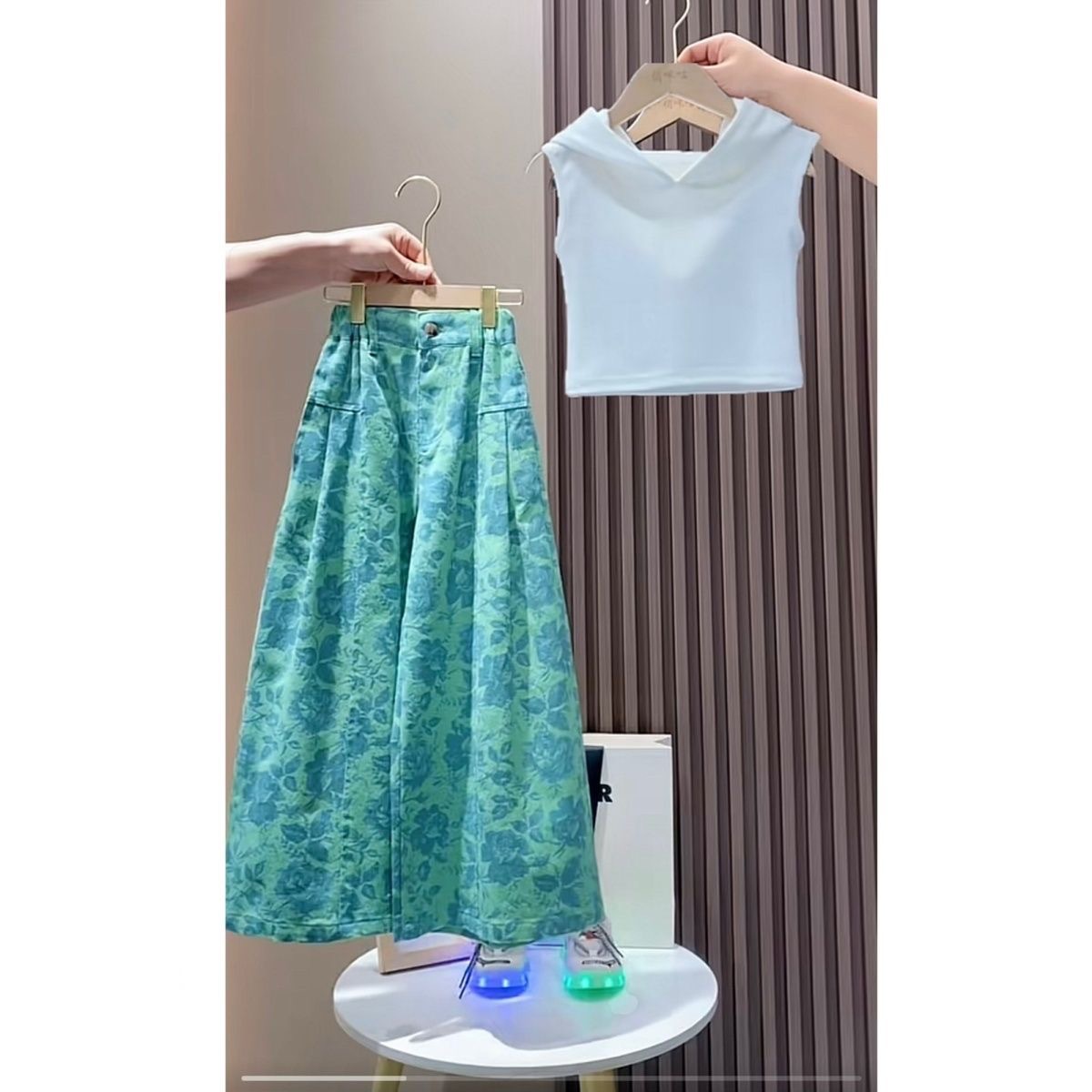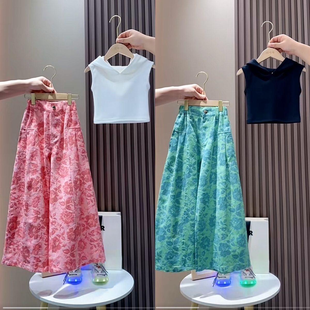 소녀의 여름 세트 패션 2025 새로운 달콤한 멋진 소녀의 패션 탑 큰 어린이 꽃 넓은 다리 바지 투피스 세트