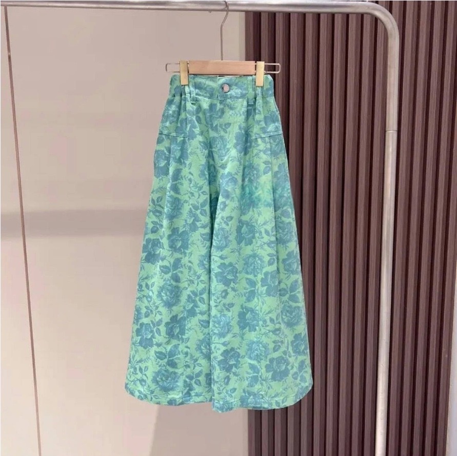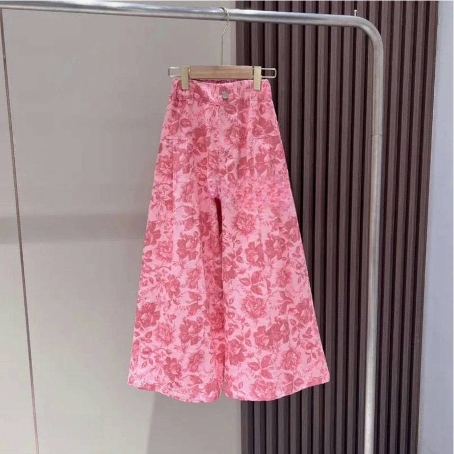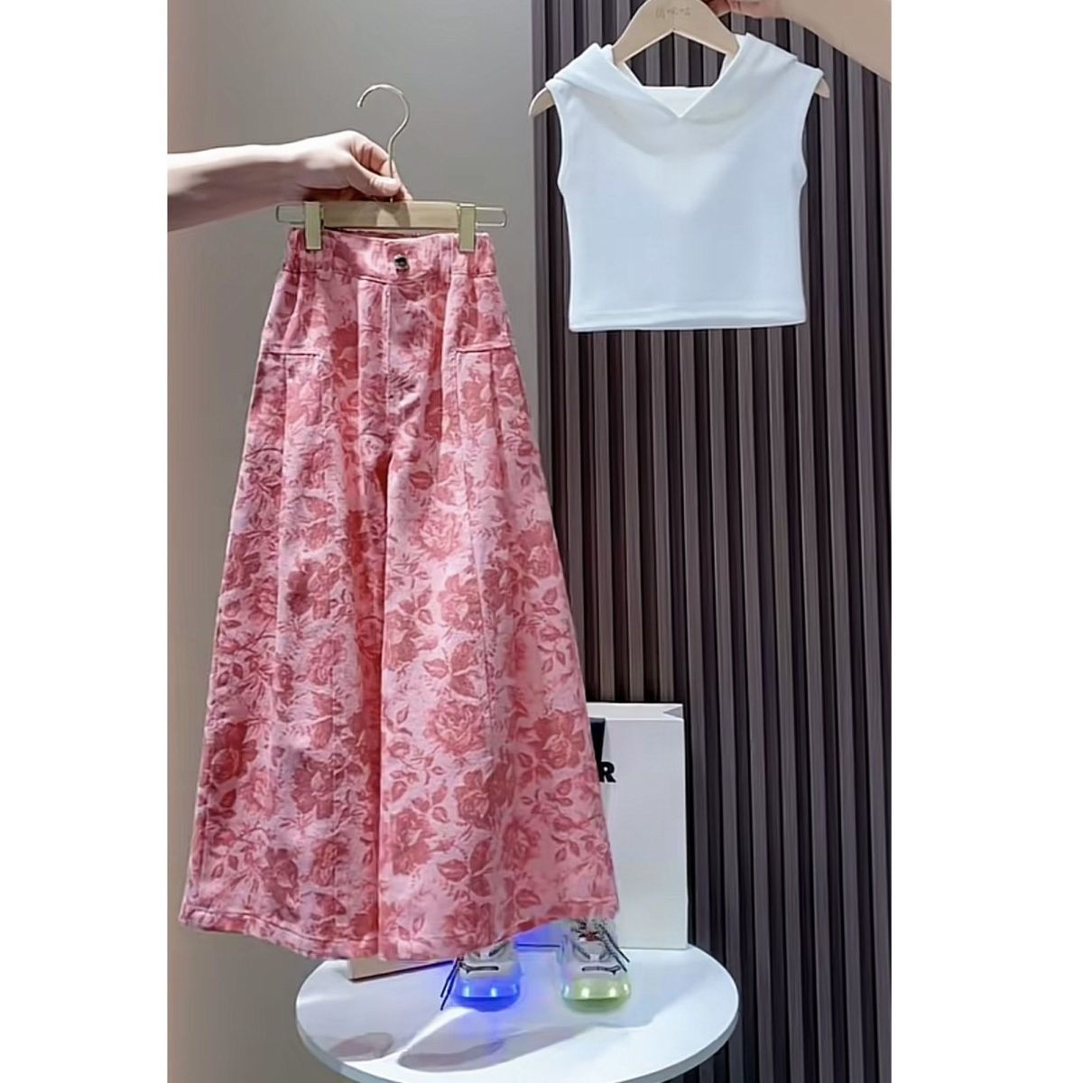 소녀의 여름 세트 패션 2025 새로운 달콤한 멋진 소녀의 패션 탑 큰 어린이 꽃 넓은 다리 바지 투피스 세트