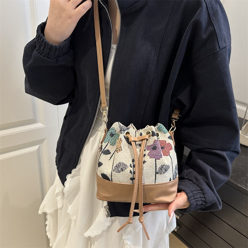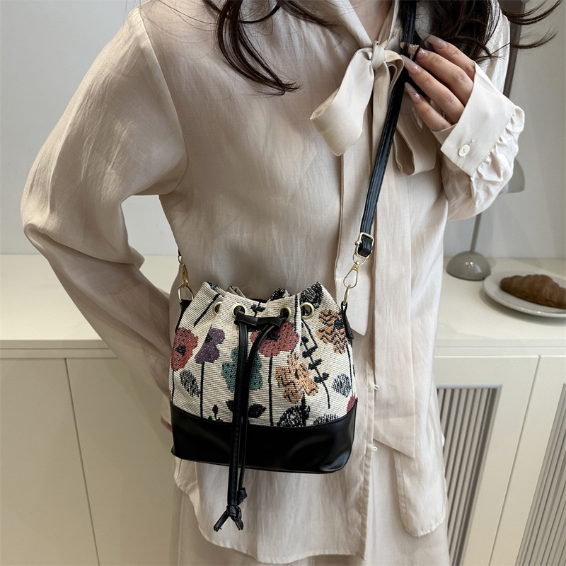 봄 새로운 패션 개성 버킷 가방 여성 캐주얼 꽃 인쇄 다목적 민족 스타일 대비 색상 메신저 가방