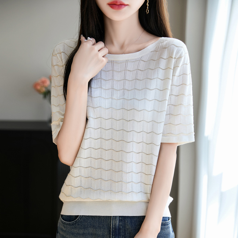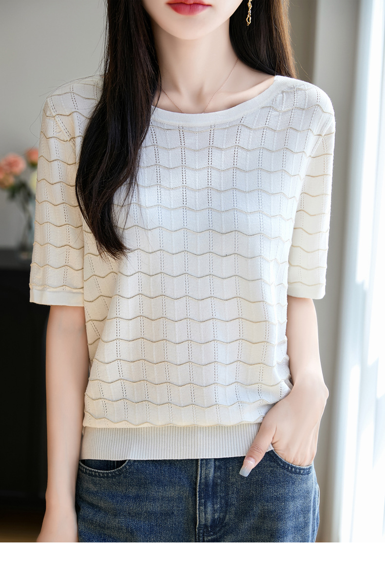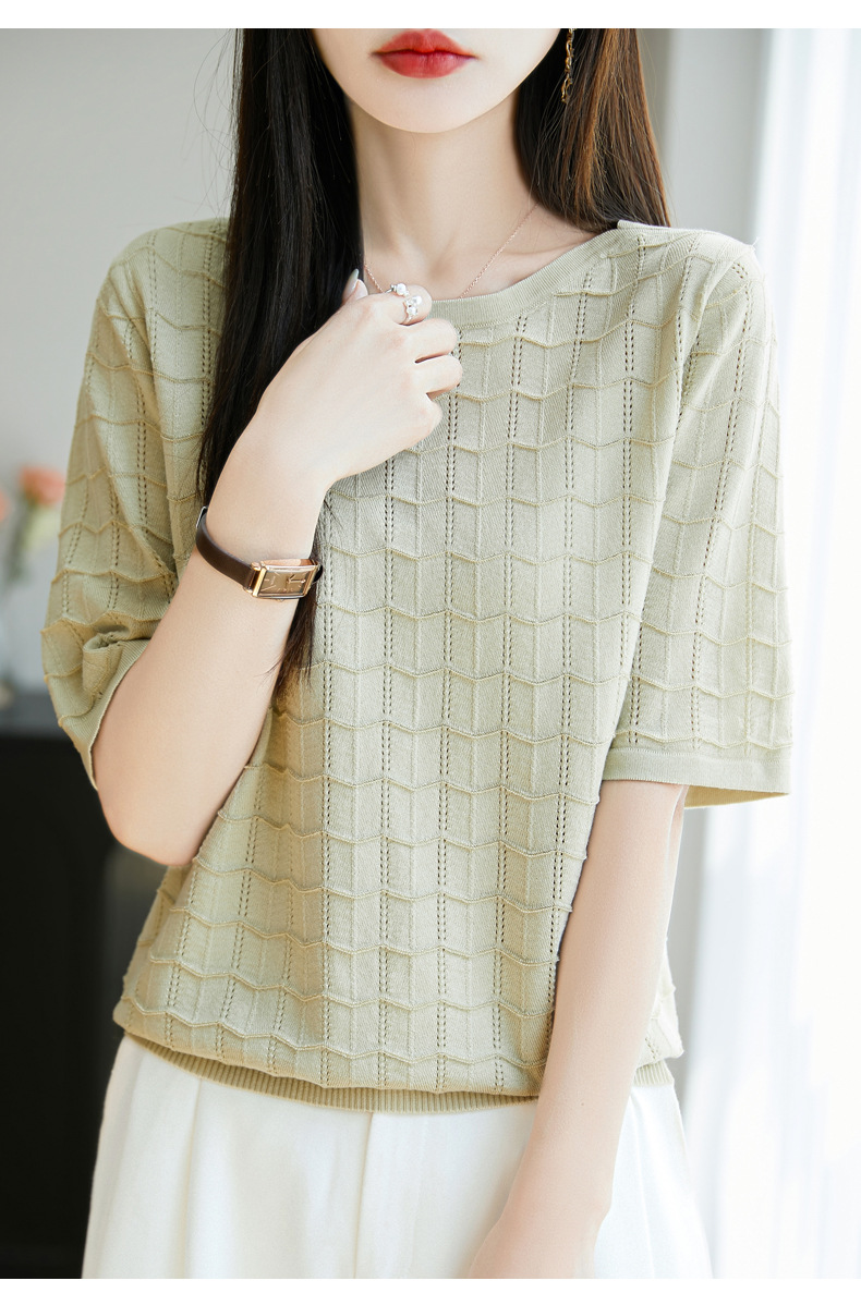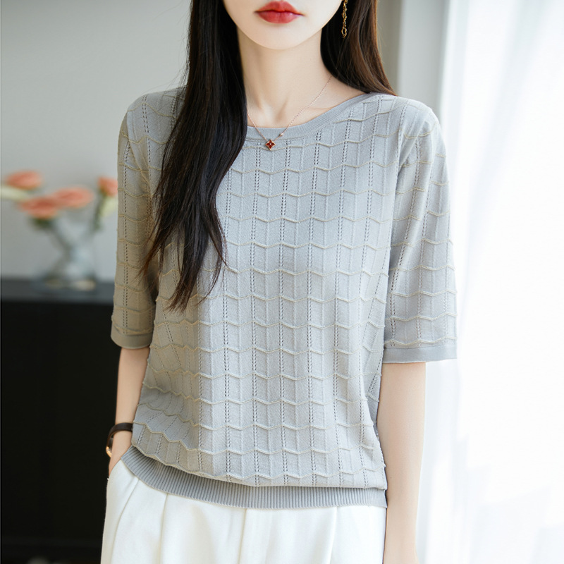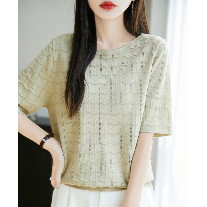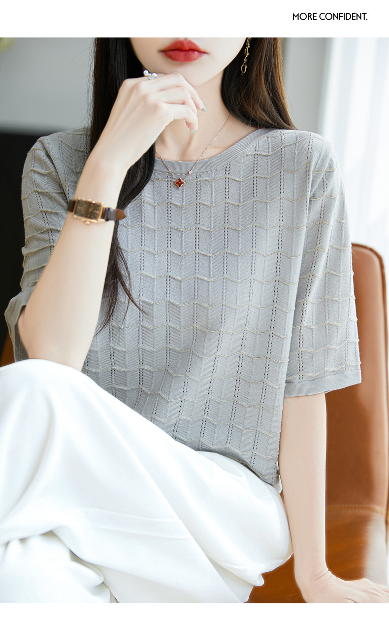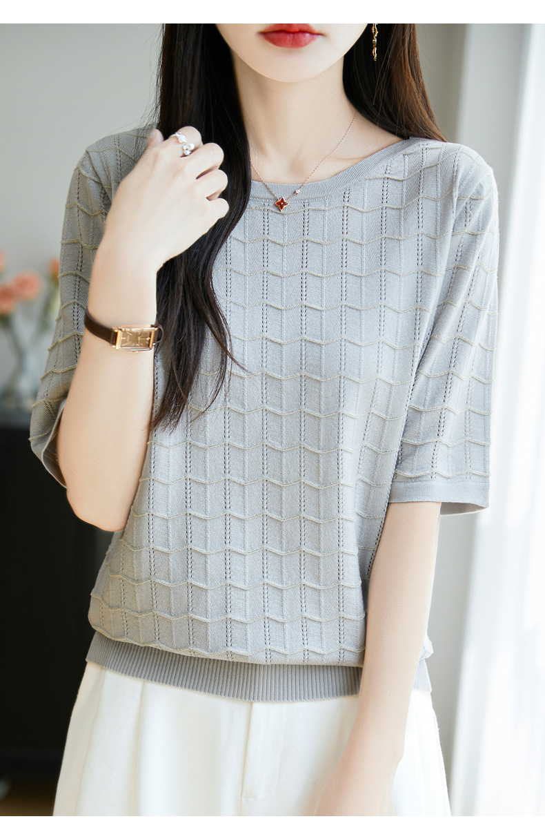 여름 쿨 텐셀 Lyocell 웨이브 우아한 캐주얼 반팔 여성용 솔리드 컬러 라운드 넥 느슨한 슬리밍 올 매치 탑