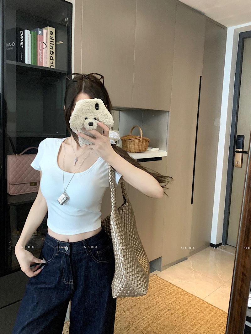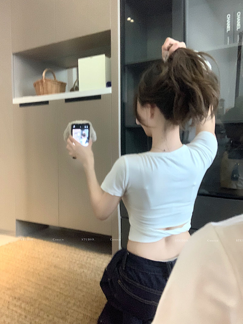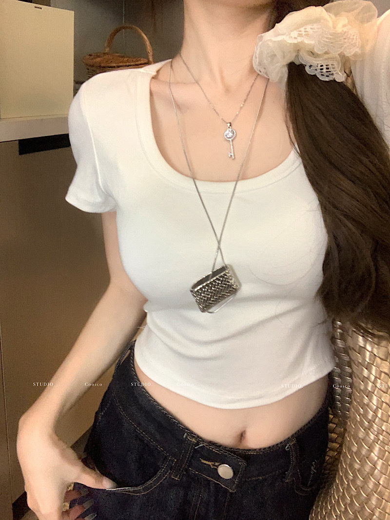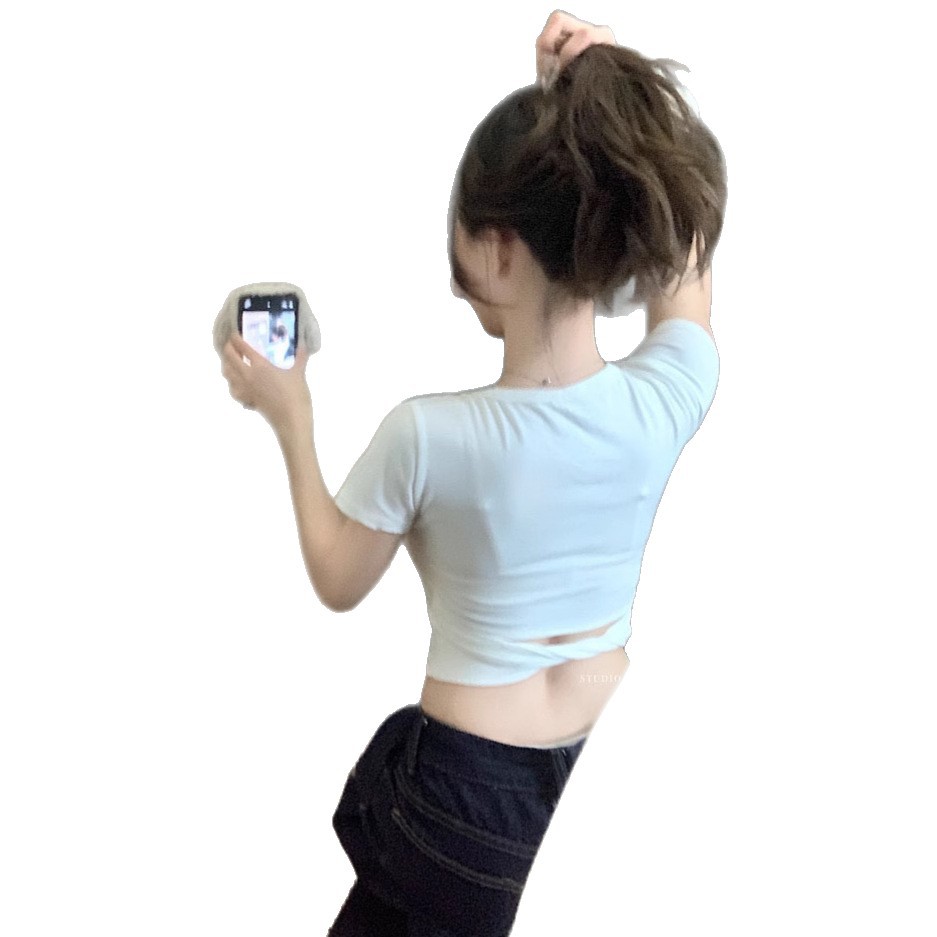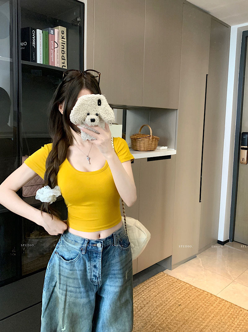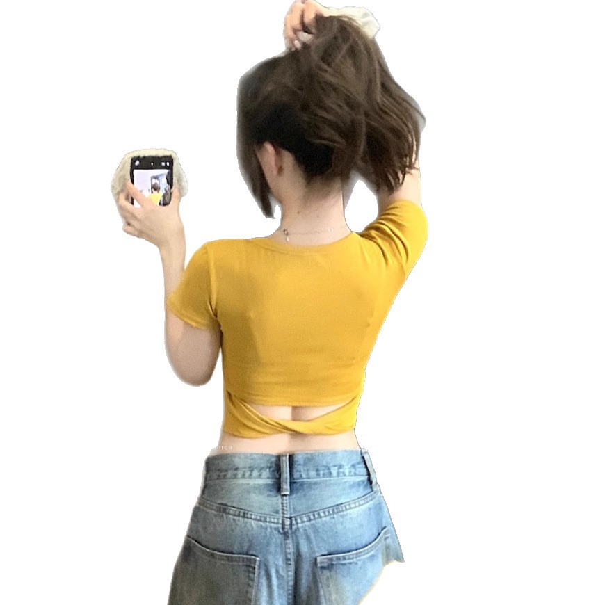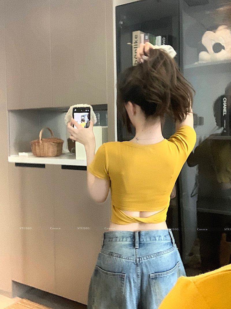 순수한 욕망 노란색 U-넥 반팔 티셔츠 여성용 등 틈새 디자인 센스 배꼽 노출 슬림 핏 슬림 핏 짧은 핫 걸 탑 트렌디스토어 가기