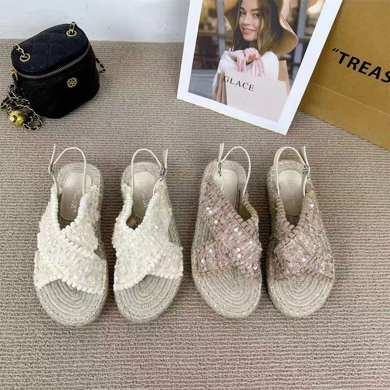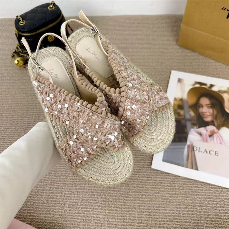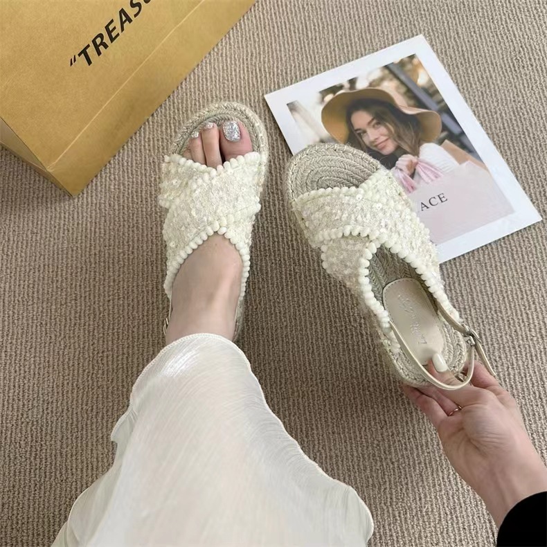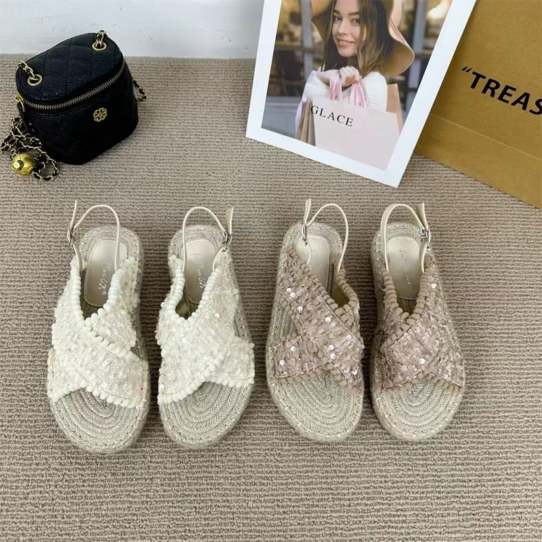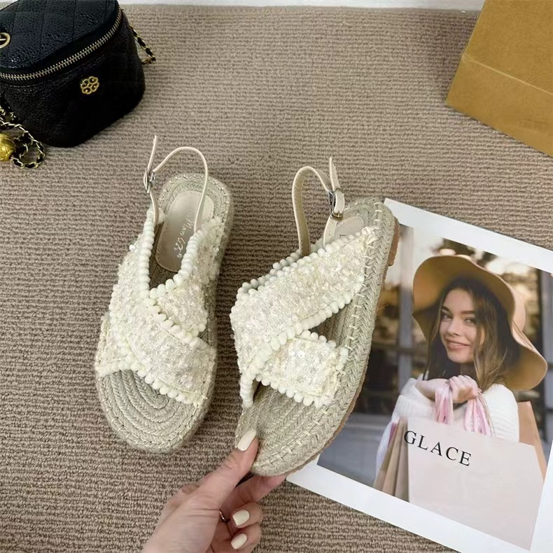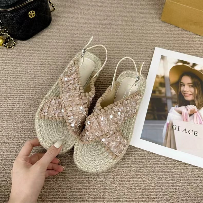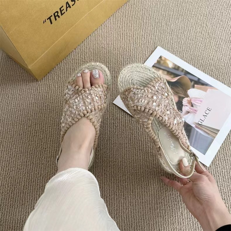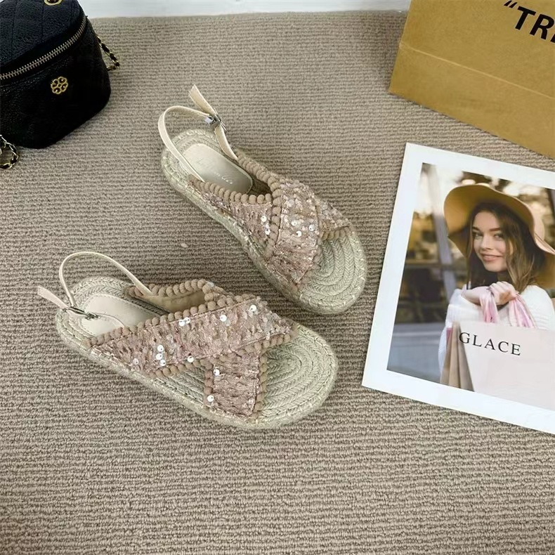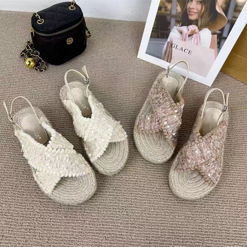 여성을위한 대외 무역 샌들 2025 여름 겉옷 새로운 복고풍 요정 스타일 전체 대마 로프 바닥 로마 비치 샌들스토어 가기