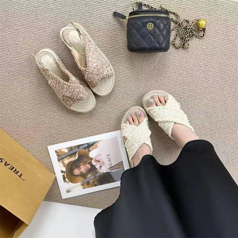 여성을위한 대외 무역 샌들 2025 여름 겉옷 새로운 복고풍 요정 스타일 전체 대마 로프 바닥 로마 비치 샌들