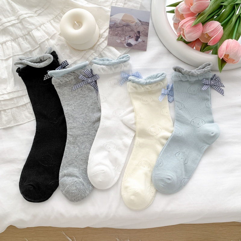 봄 여름 어린이를위한 힐 활 중간 튜브 스택 양말 얇은 어두운 패턴 강아지 한국 스타일 Ins 스타일 더블 레이스 양말