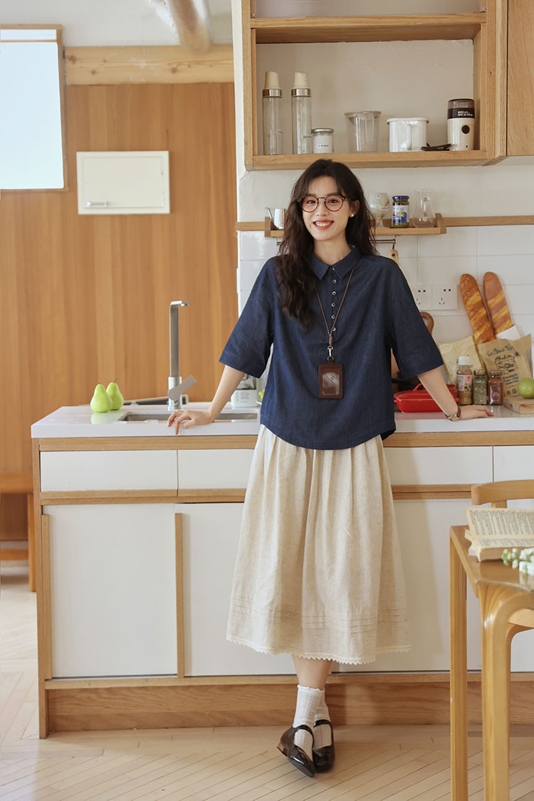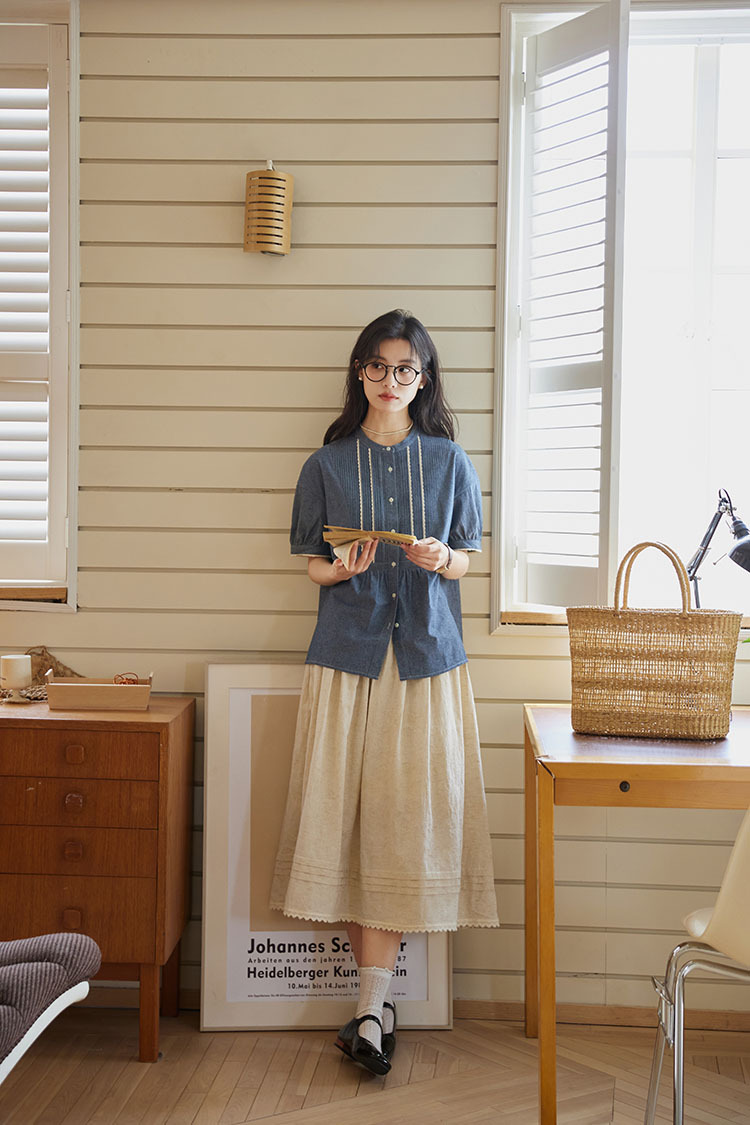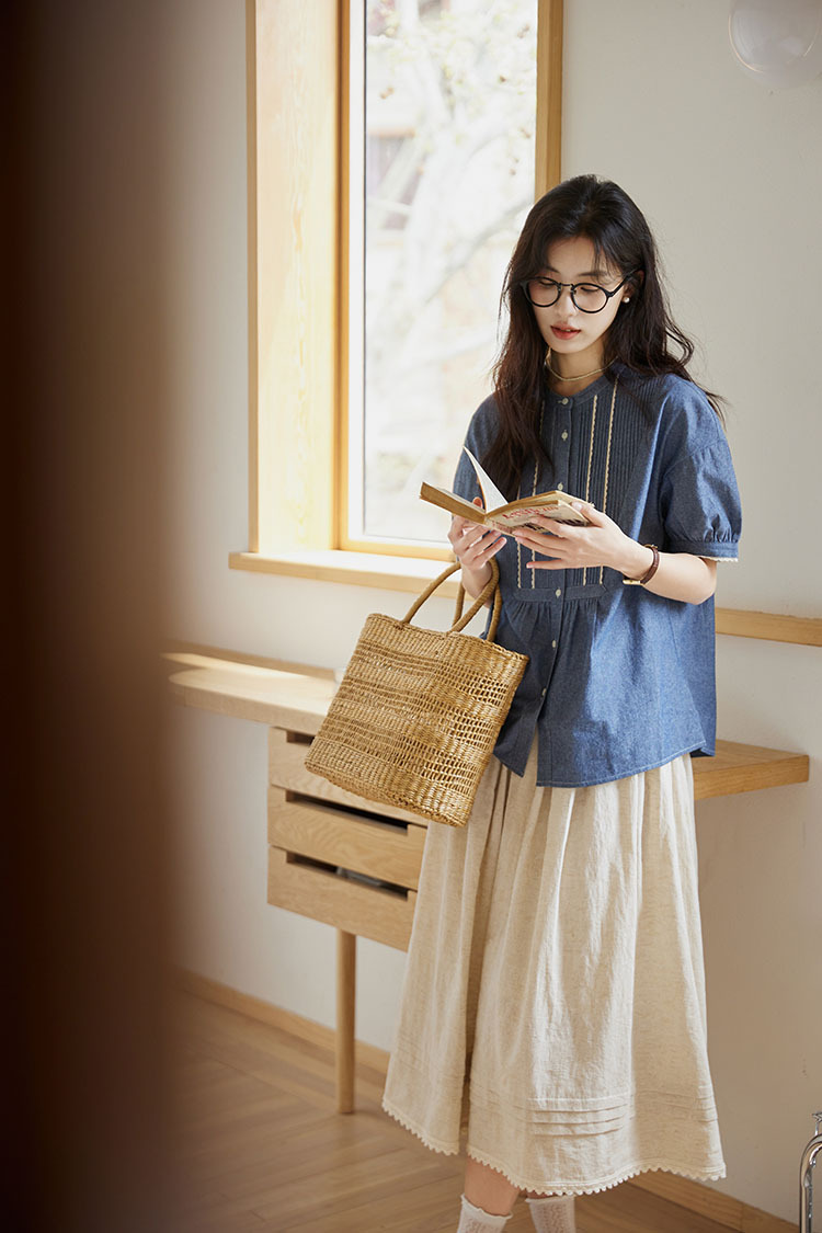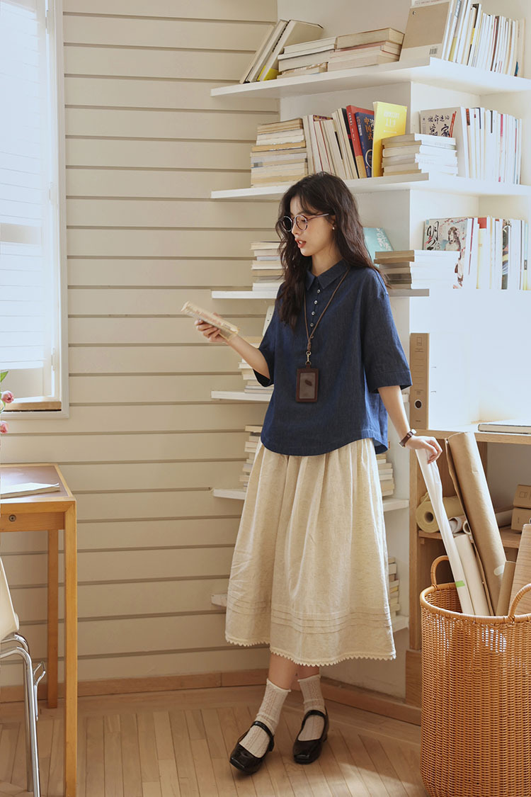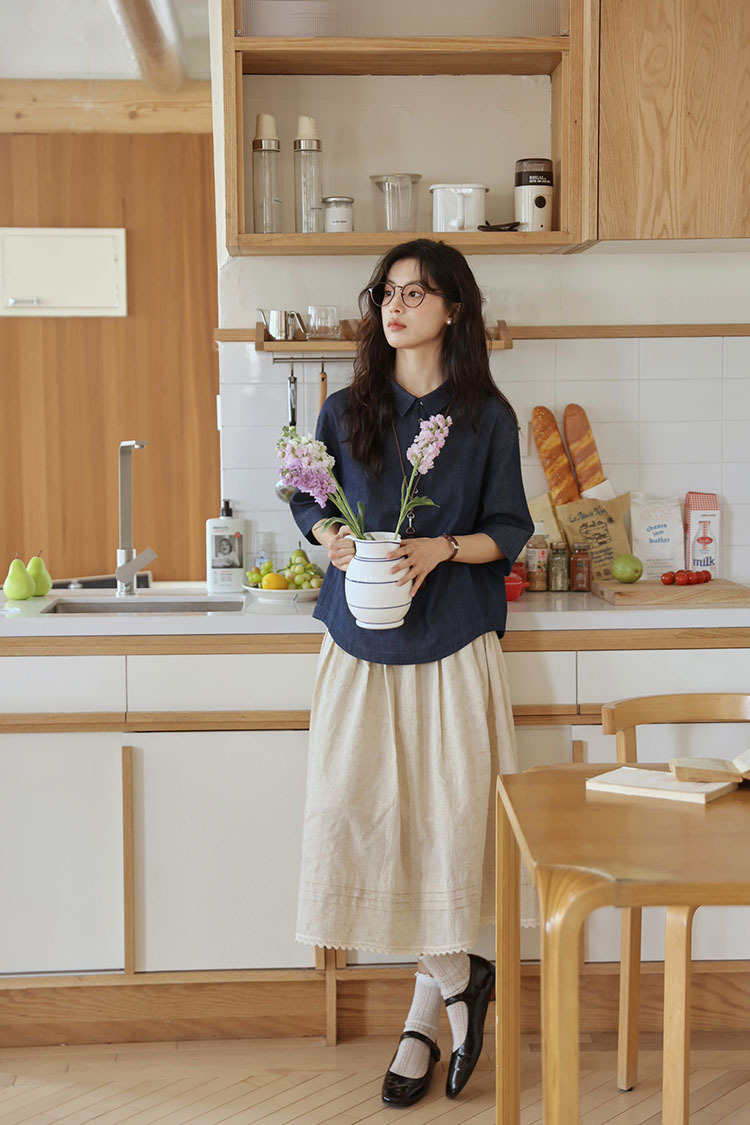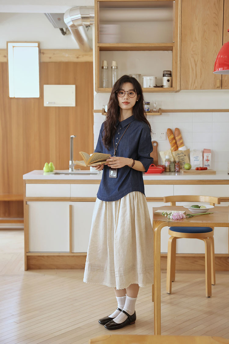 리얼 샷 2025 여름 일본 문학 및 예술적 작은 신선한 살구색 코드와 린넨 스커트 여성의 긴 A 라인 스커트