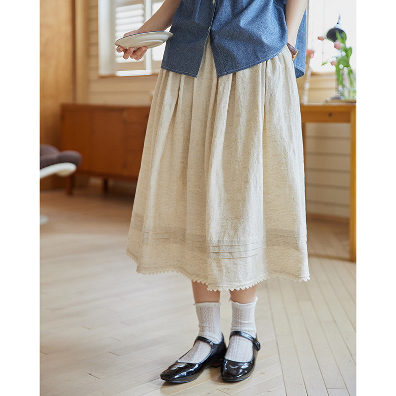리얼 샷 2025 여름 일본 문학 및 예술적 작은 신선한 살구색 코드와 린넨 스커트 여성의 긴 A 라인 스커트스토어 가기