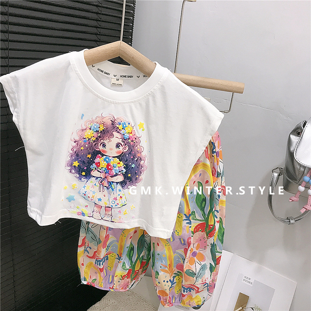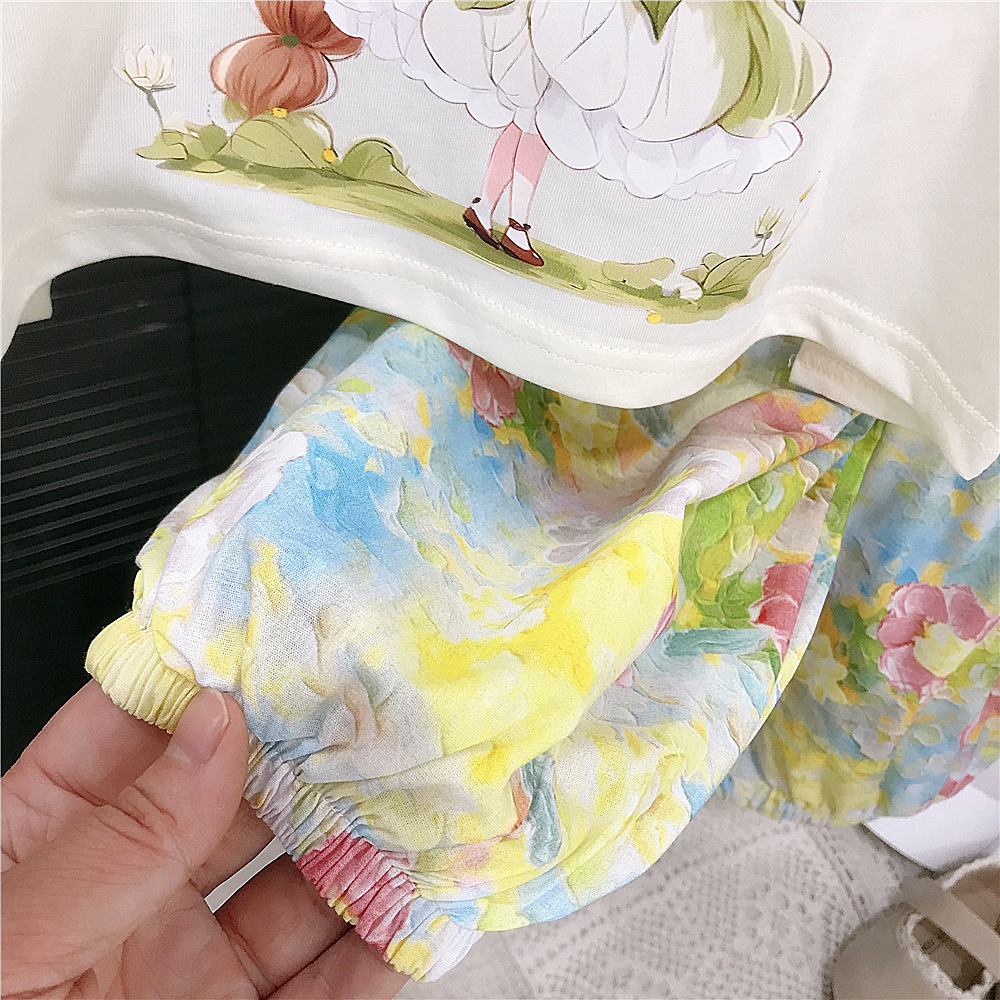 소녀 세트 여름 새로운 유행 만화 소녀 인쇄 최고 캐주얼 올 매치 바지 2 피스 세트 대외 무역