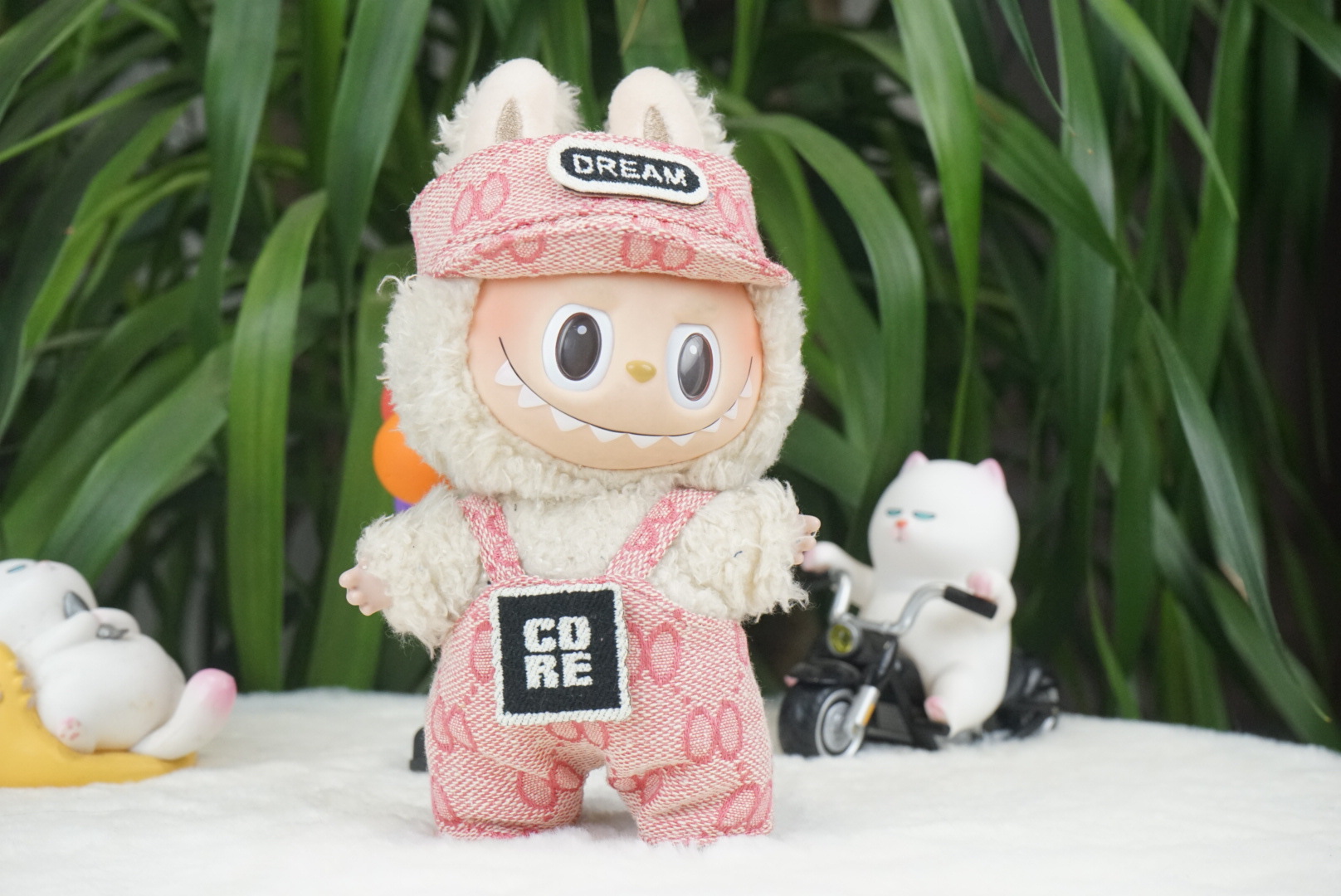 Labubu 옷 17cm Labubu 인형 코트 다크 브라운 핑크 명암 컬러 벨트 바지 세트 인형 트렌디 한 놀이 착용
