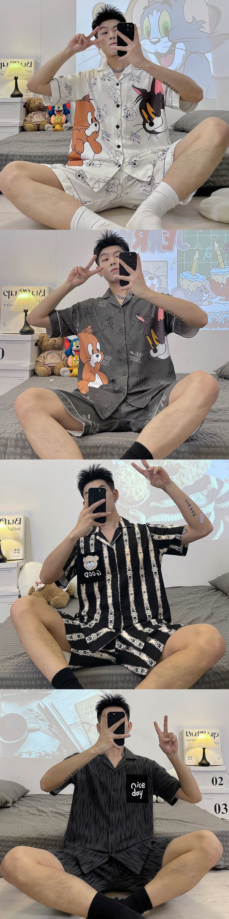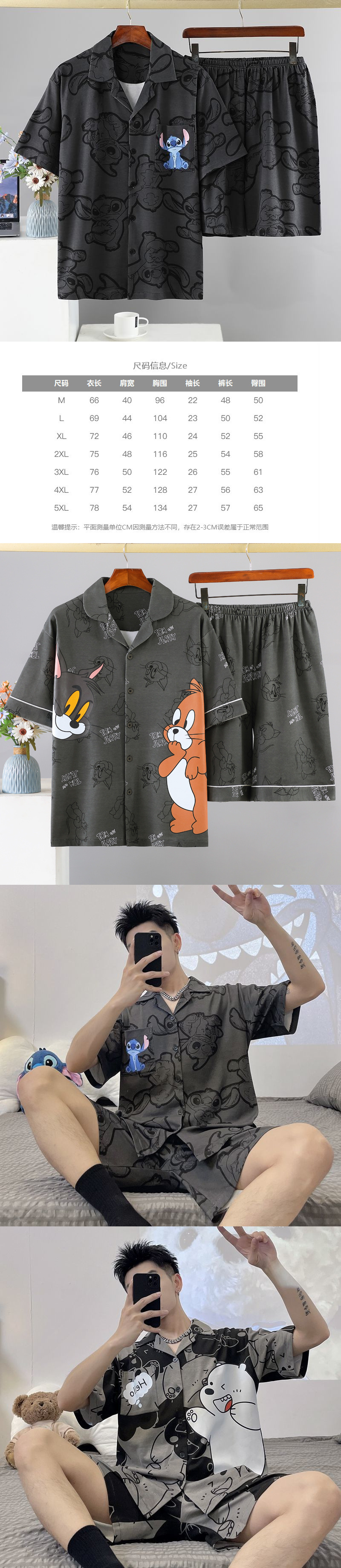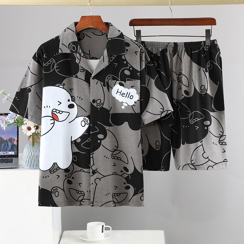 여름 반팔 잠옷 남성 카디건 만화 청소년 플러스 사이즈 플러스 사이즈 반바지 남성 잠옷 홈웨어 세트스토어 가기