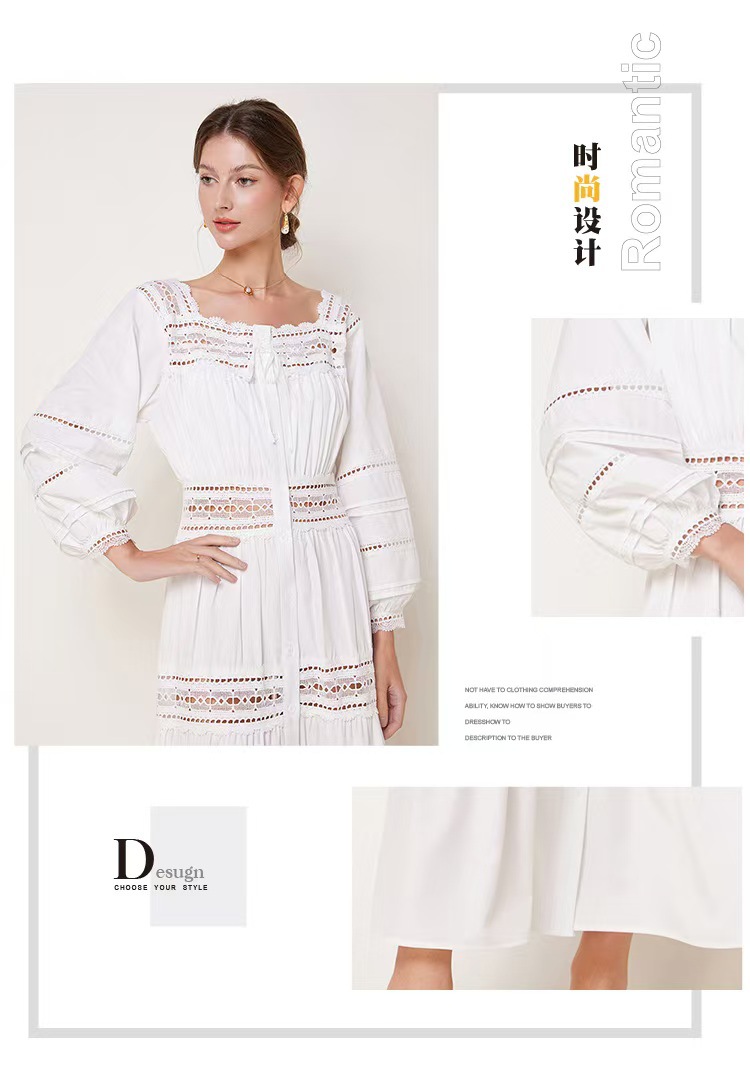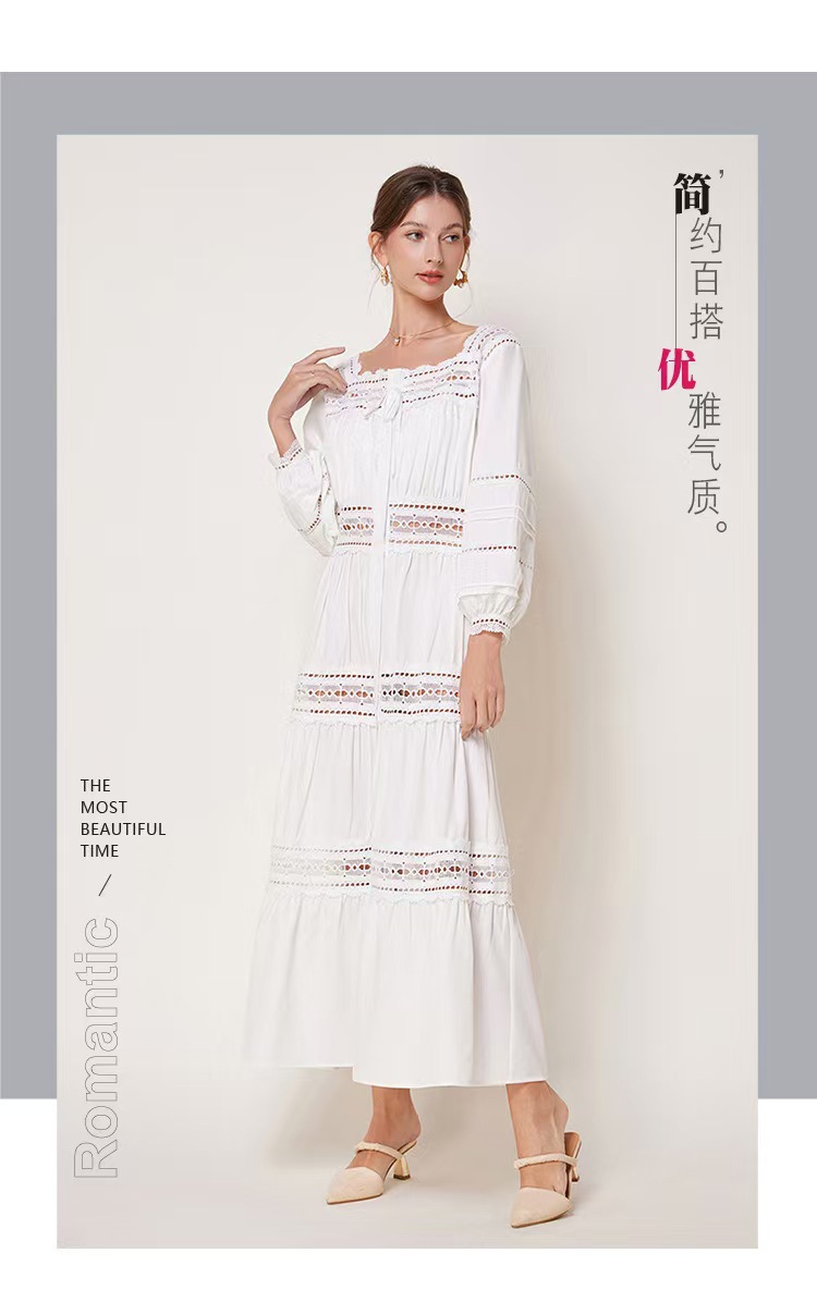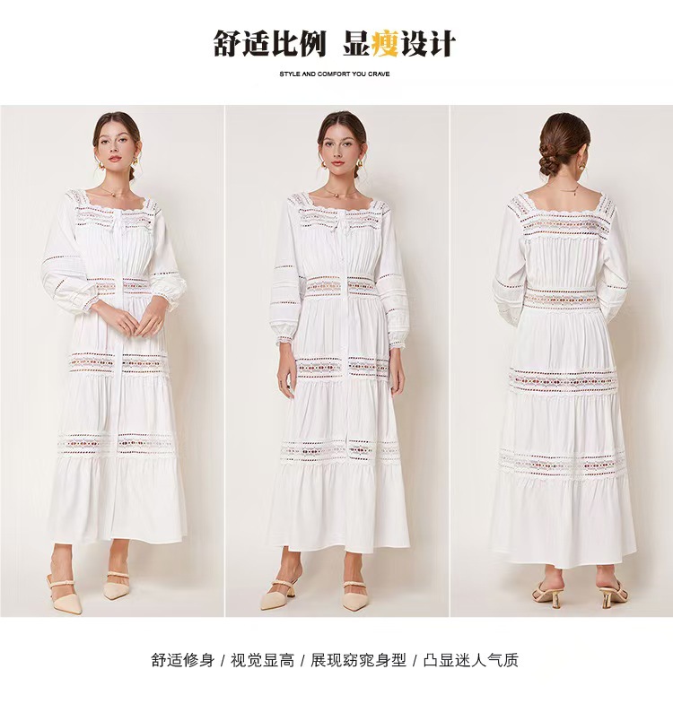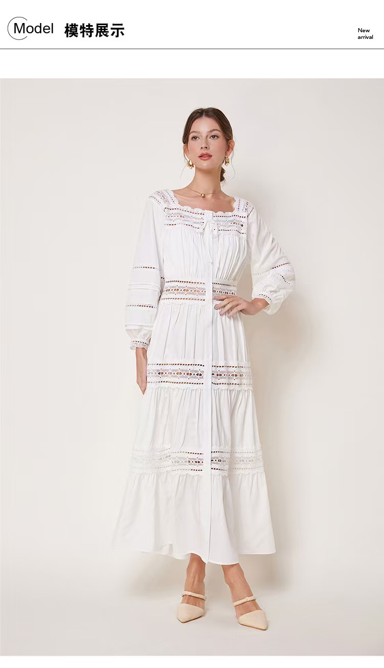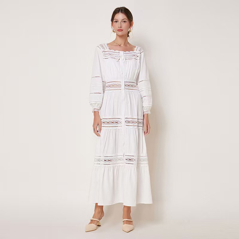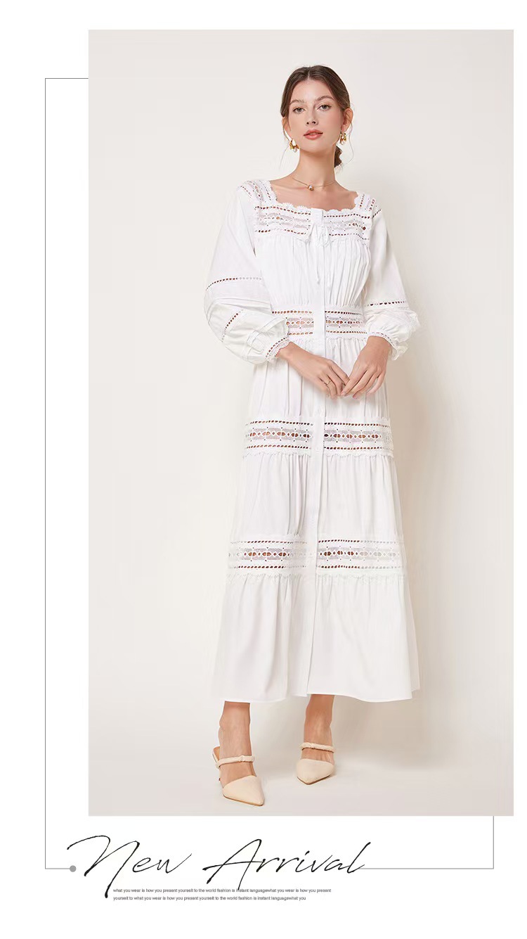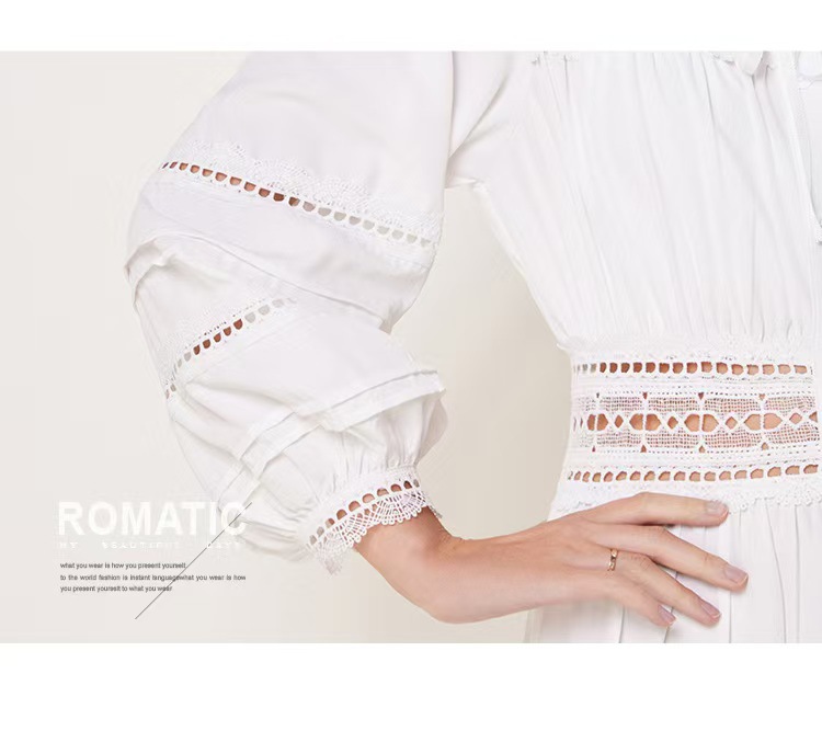 우아한 크로스보더 대외 무역 새로운 스타일의 달콤한 퍼프 슬리브 롱 드레스 중공 레이스 러플 프론트 브레스트 긴팔 드레스스토어 가기