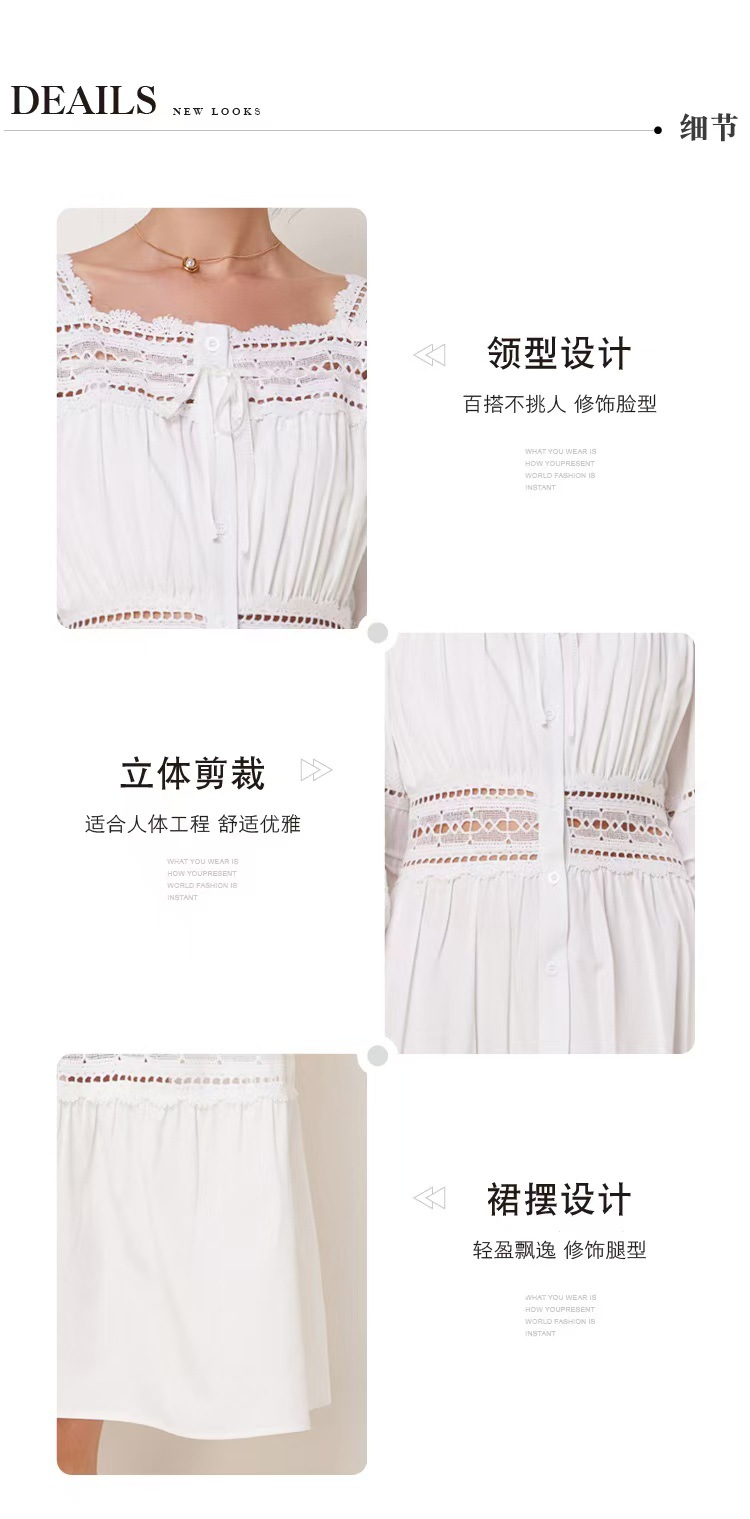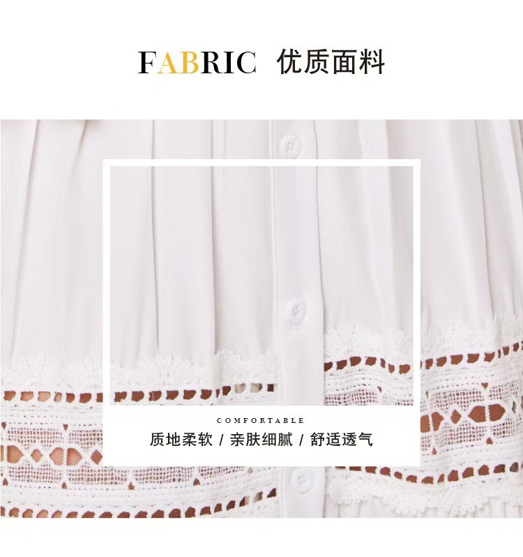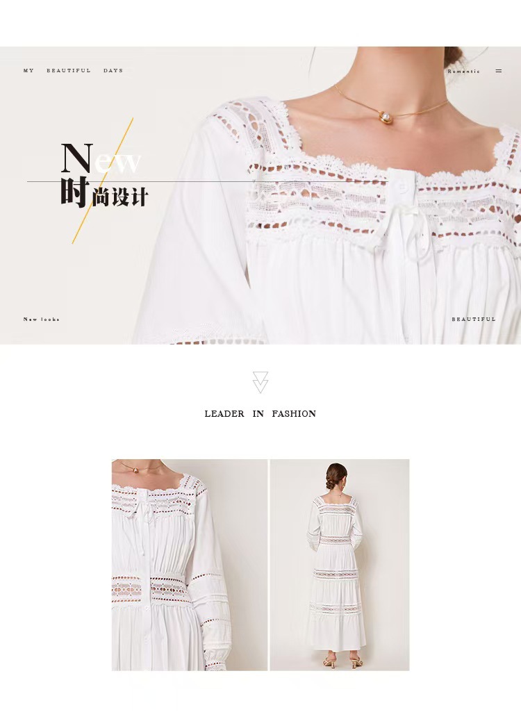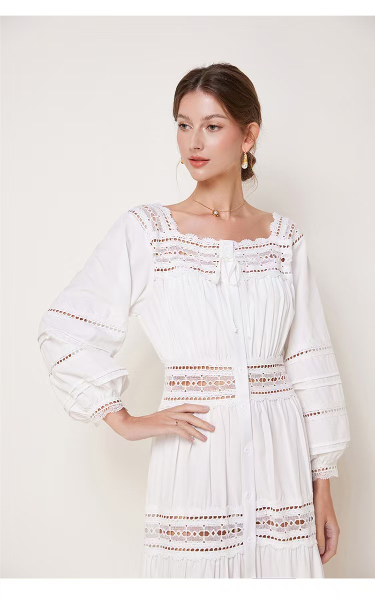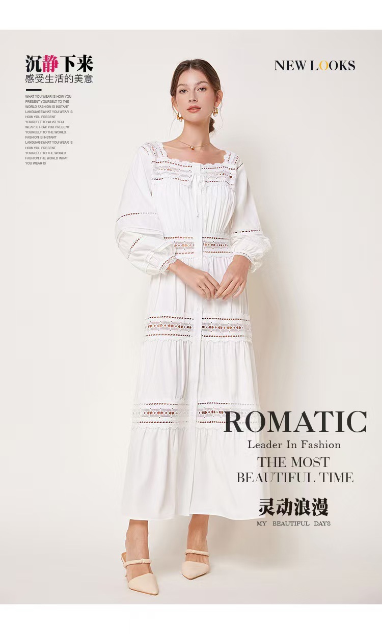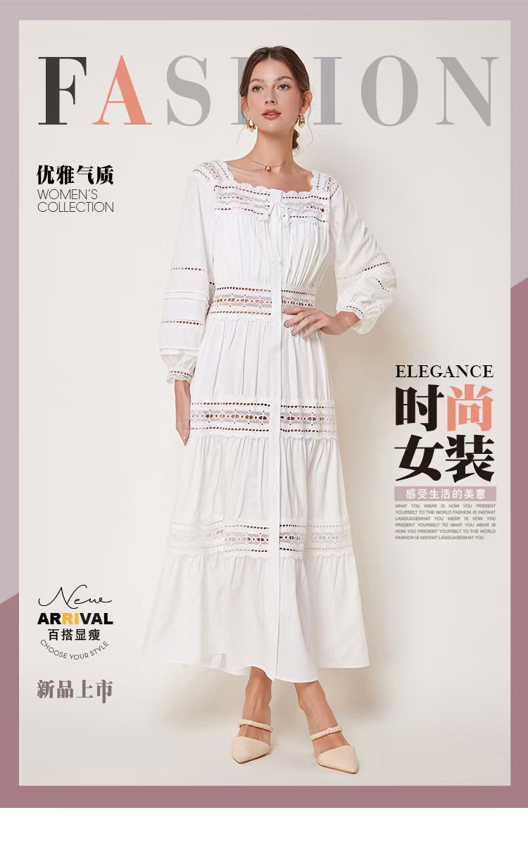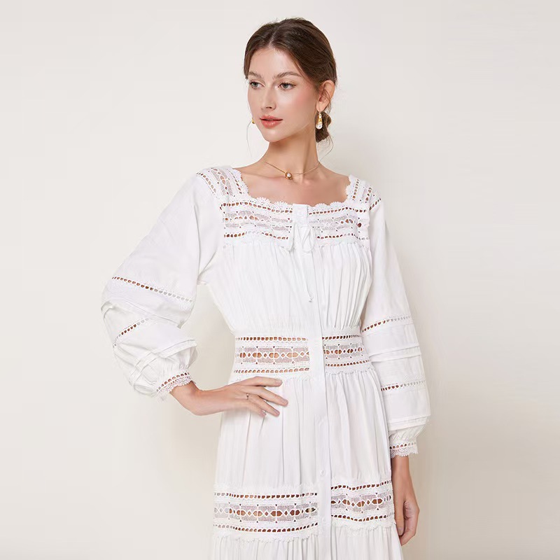 우아한 크로스보더 대외 무역 새로운 스타일의 달콤한 퍼프 슬리브 롱 드레스 중공 레이스 러플 프론트 브레스트 긴팔 드레스스토어 가기