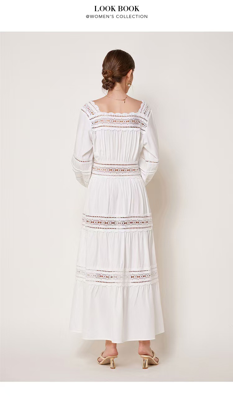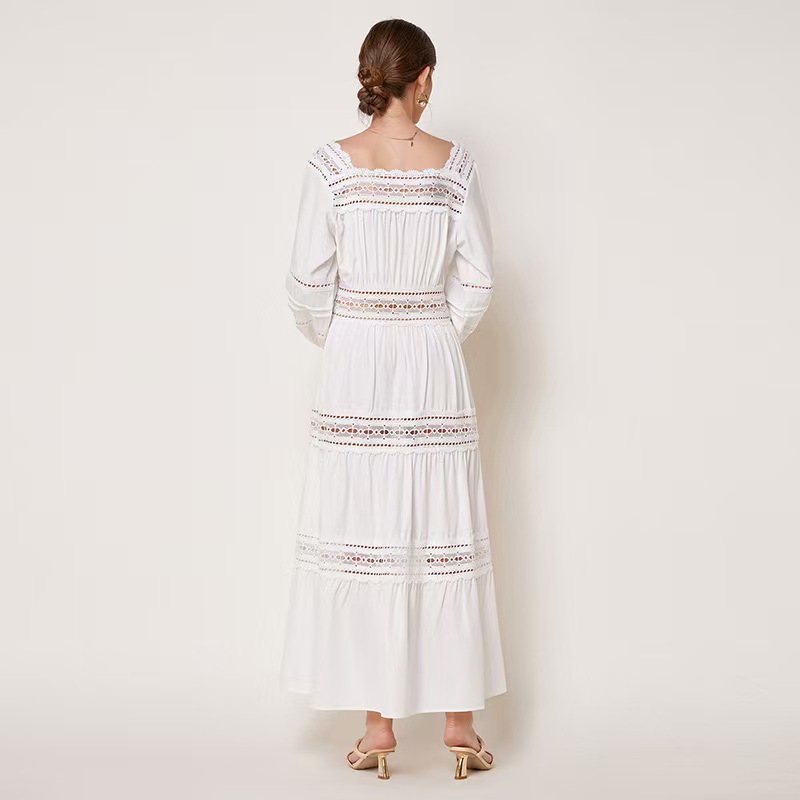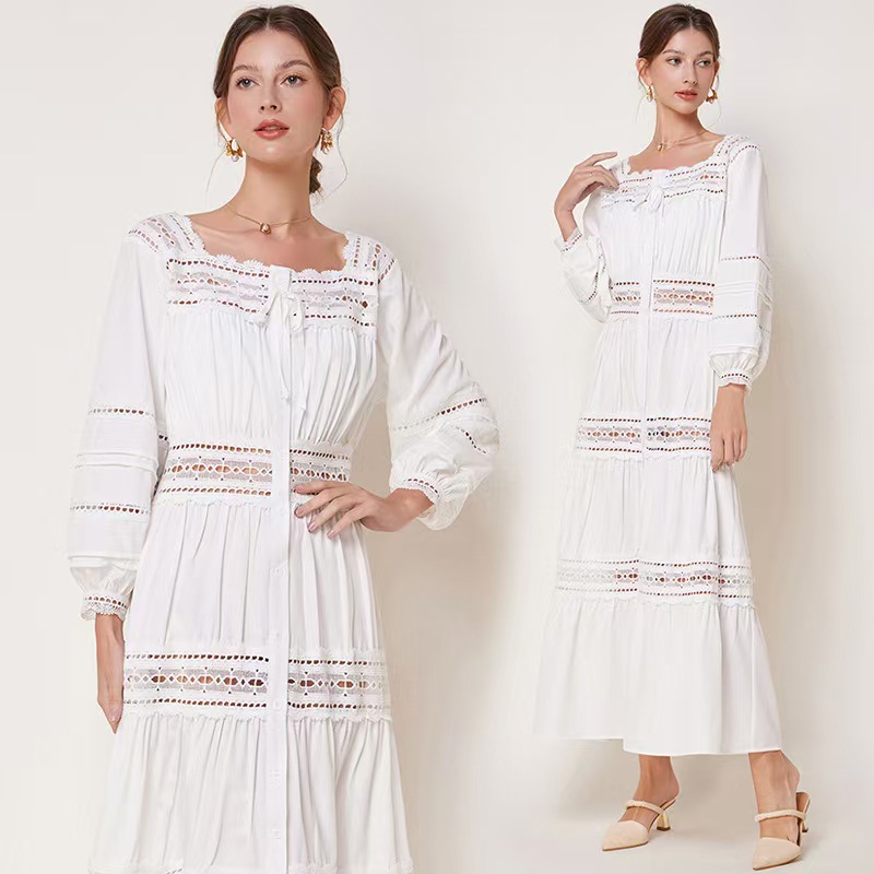 우아한 크로스보더 대외 무역 새로운 스타일의 달콤한 퍼프 슬리브 롱 드레스 중공 레이스 러플 프론트 브레스트 긴팔 드레스