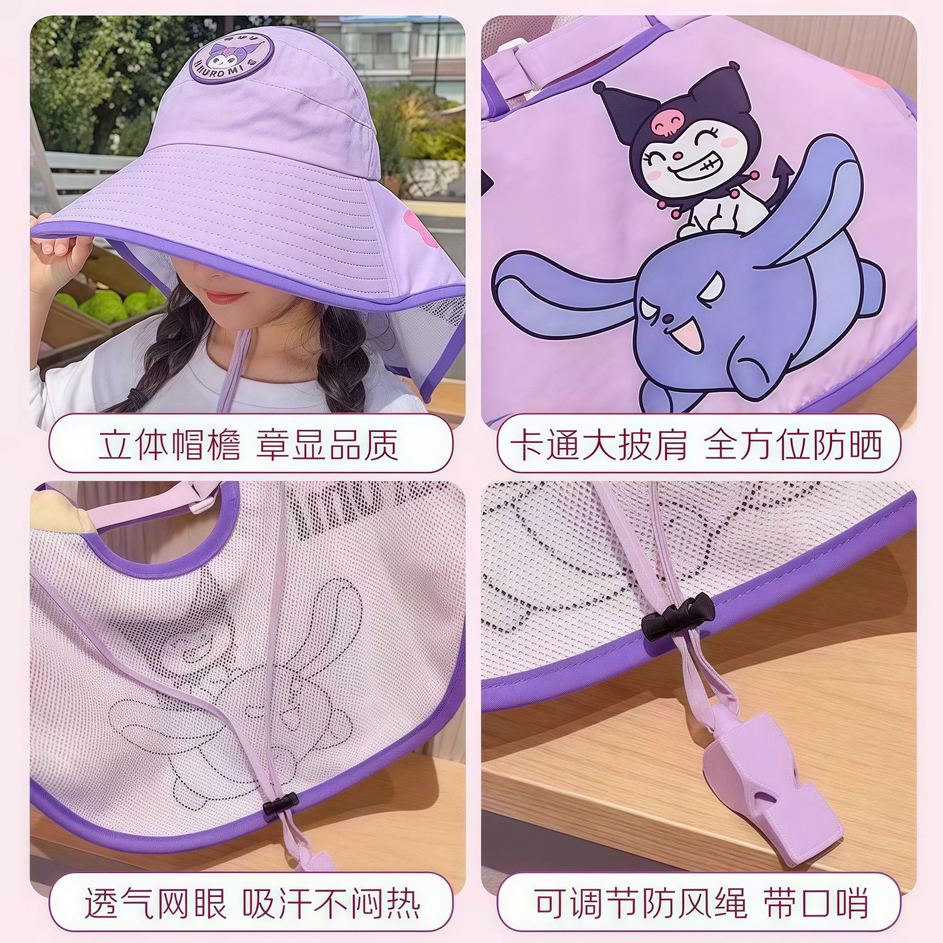 여름 어린이용 자외선 차단 모자, 넓은 챙과 목 보호 기능, 산리오 캐릭터, 남녀 아기용, 숄과 호루라기 포함, 자외선 차단 및 통기성스토어 가기