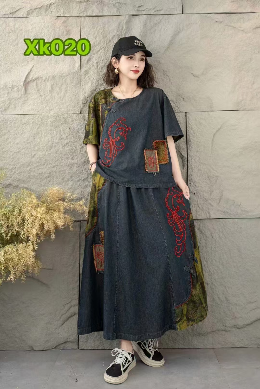 자수 데님 스커트 정장 2025 여름 복고풍 버튼 스플 라이스 프린트 라운드 넥 데님 탑 여성 투피스 세트스토어 가기