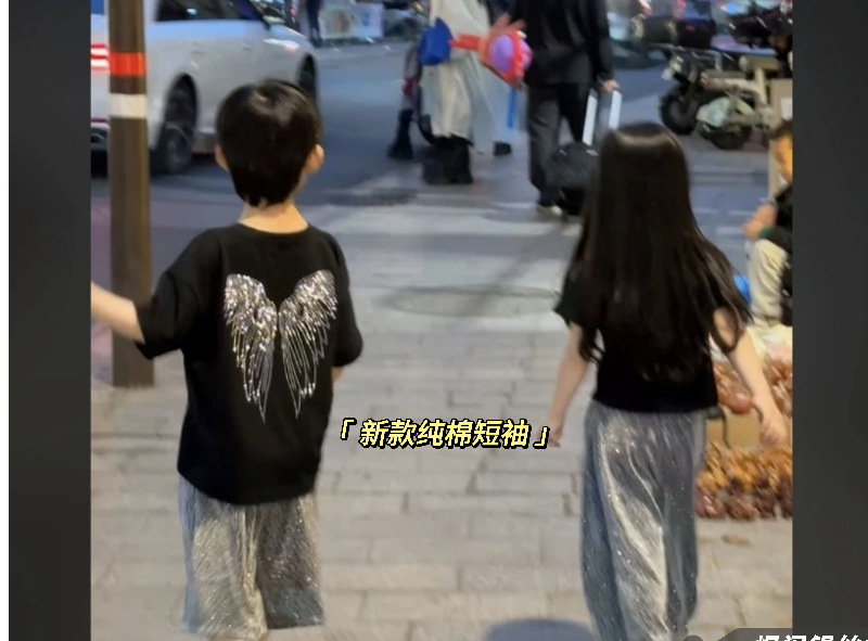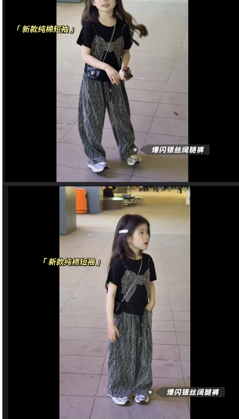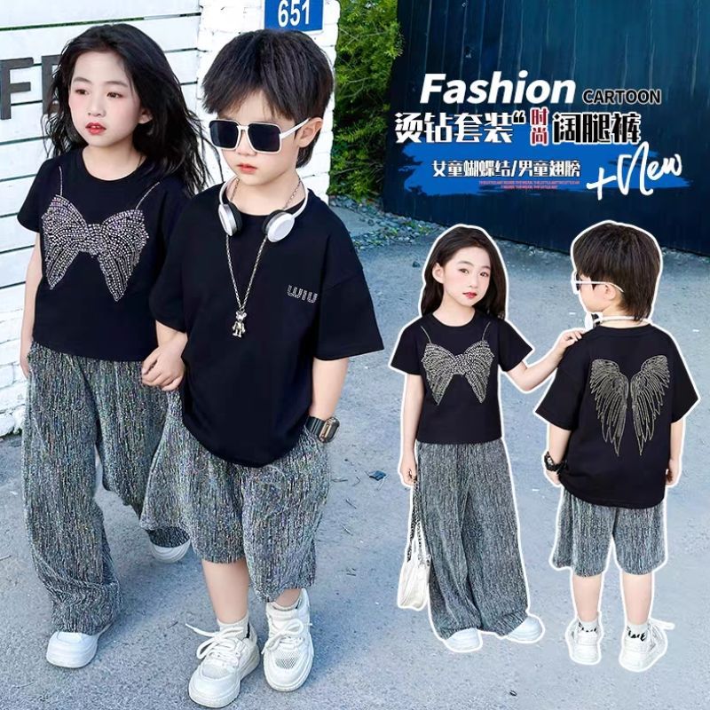 여름 신상 반팔 와이드 팬츠, 데님 디자인의 자매형 투피스 세트, 중대형 아동 패션, 트렌디하고 쿨한 아동복스토어 가기