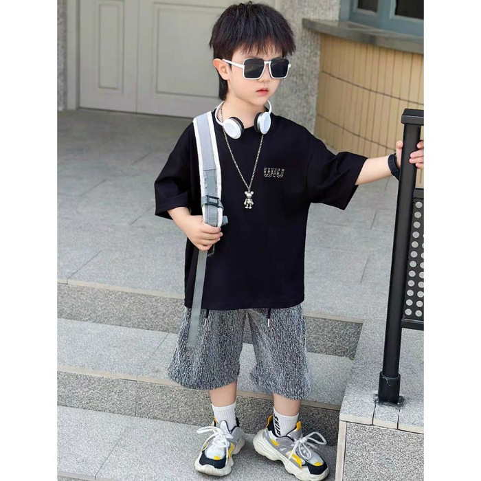 여름 신상 반팔 와이드 팬츠, 데님 디자인의 자매형 투피스 세트, 중대형 아동 패션, 트렌디하고 쿨한 아동복