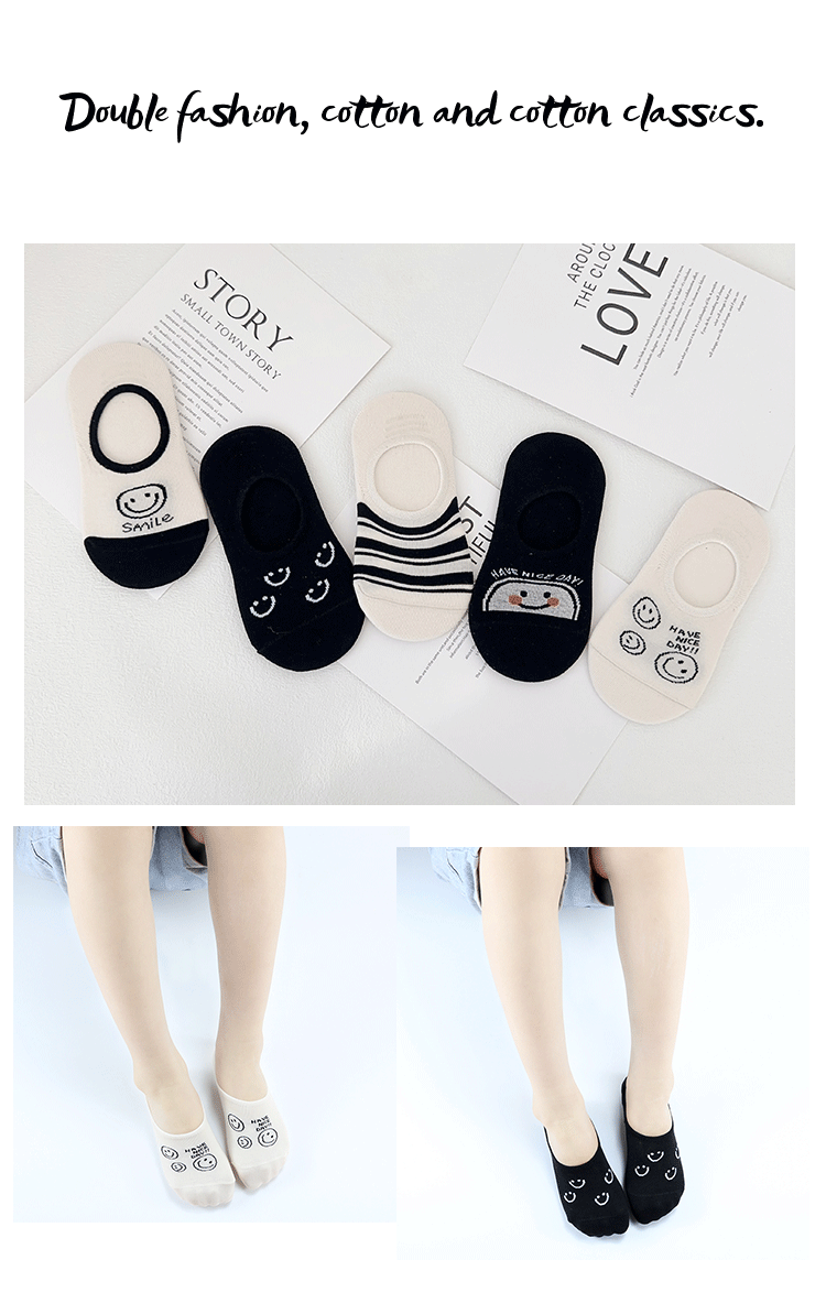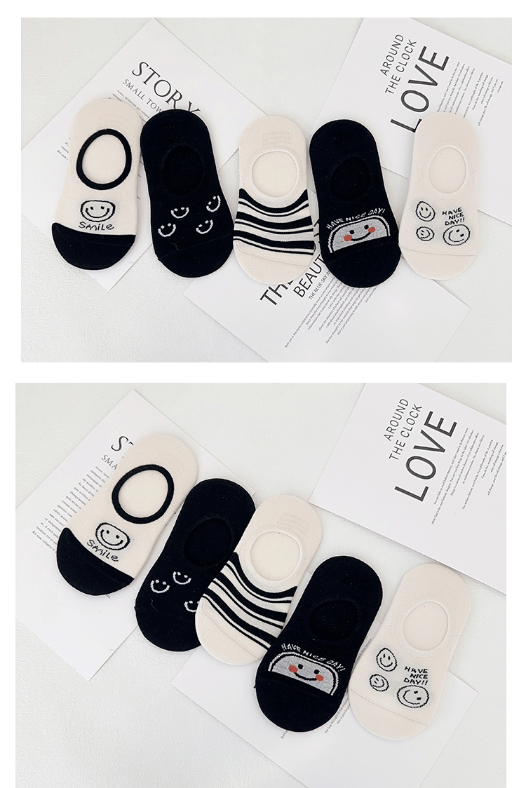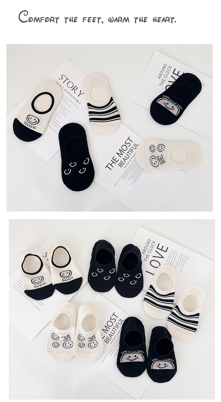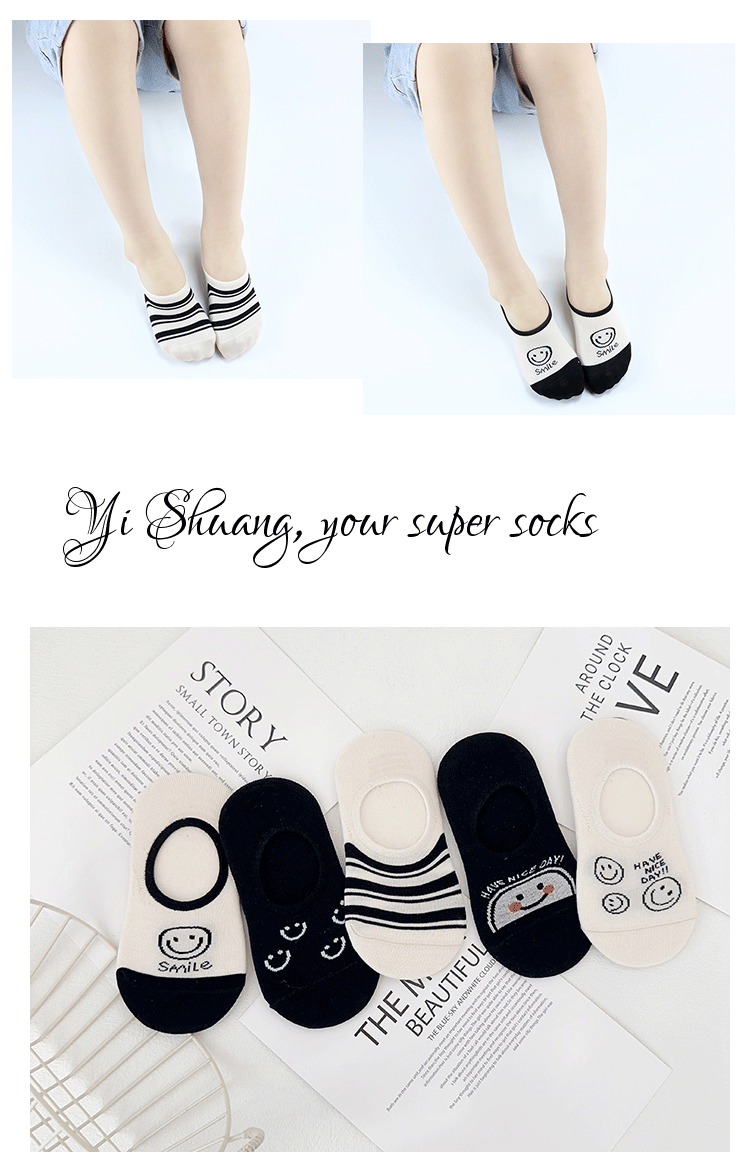 Yishuangshuang 어린이 양말 여름 새로운 만화 웃는 얼굴 보트 양말 빗질면 흑백 얕은 입 보이지 않는 양말 뼈없는 양말
