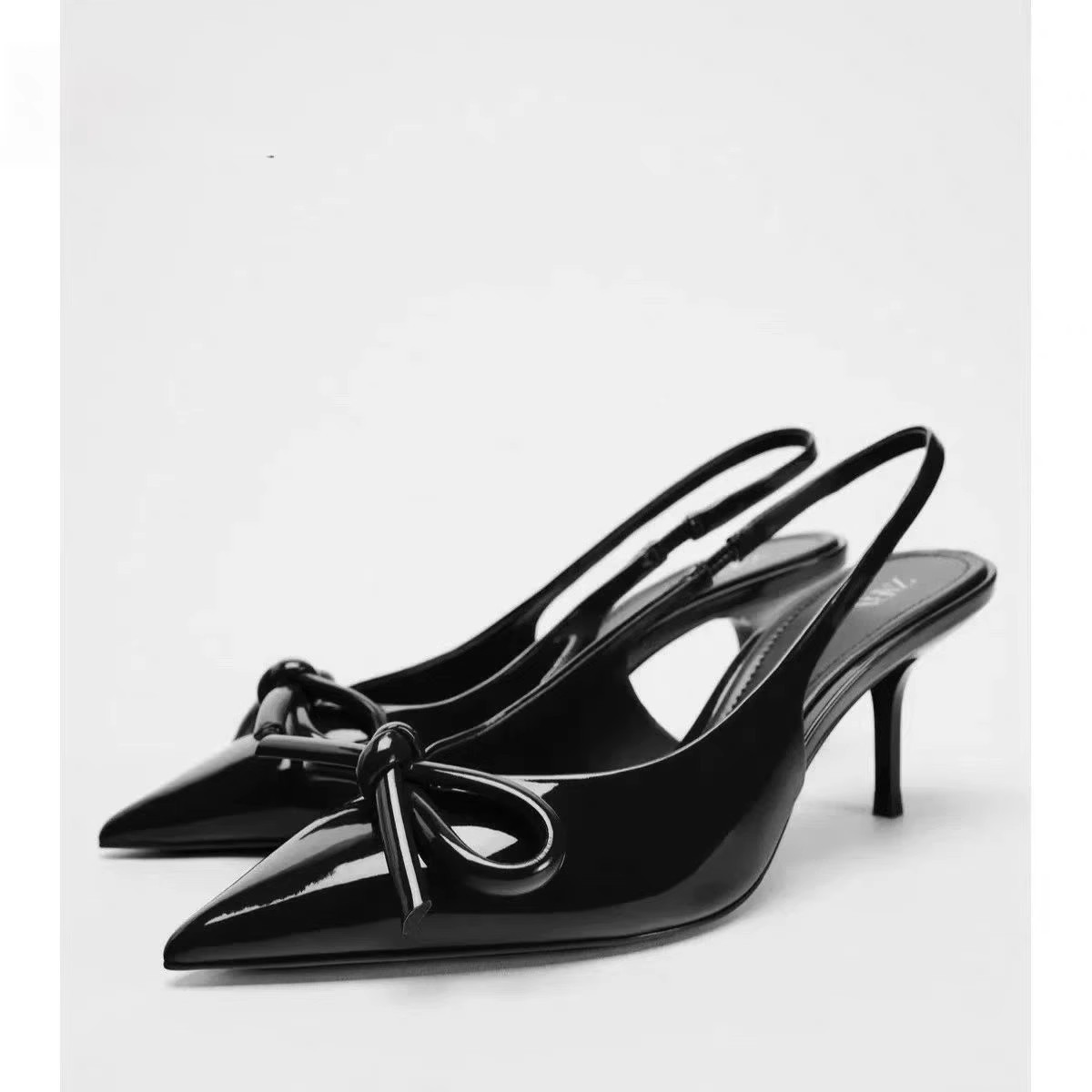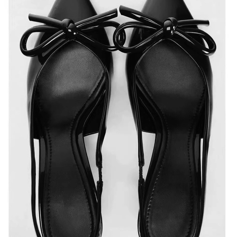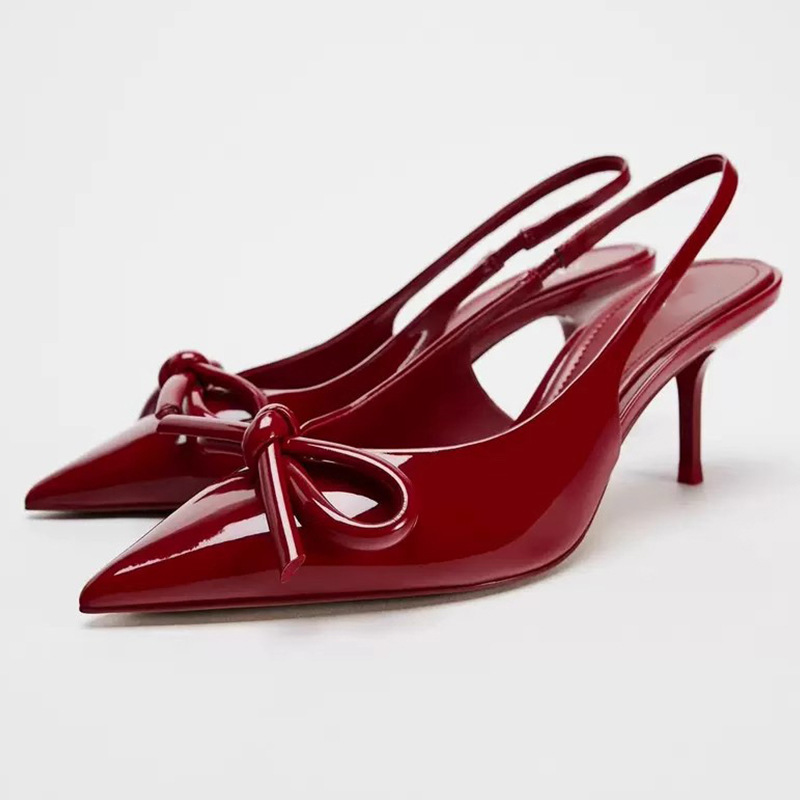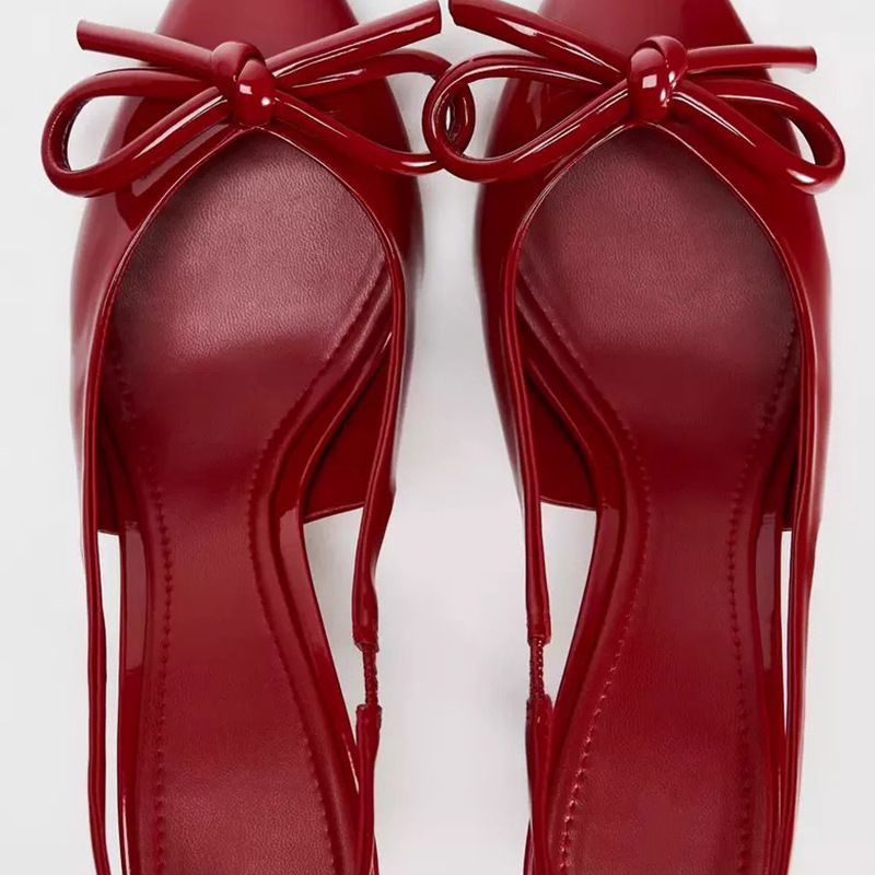 2025년 여름 신상 여성화 버건디 보우 포인티드 토 페이턴트 가죽 펌프스 하이힐 스틸레토 샌들 아우터스토어 가기