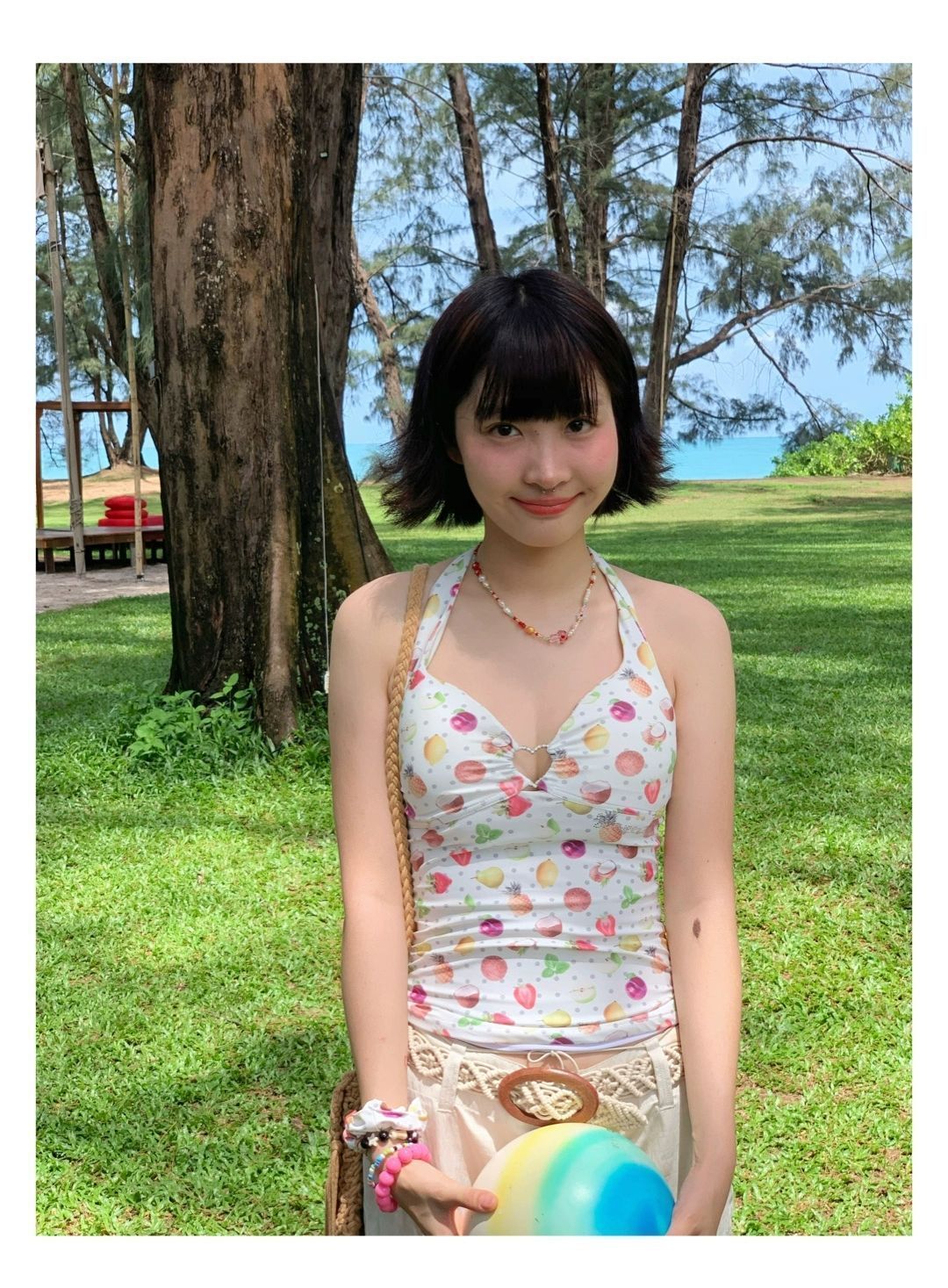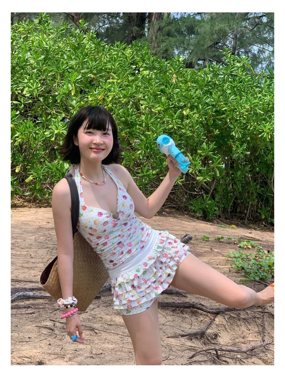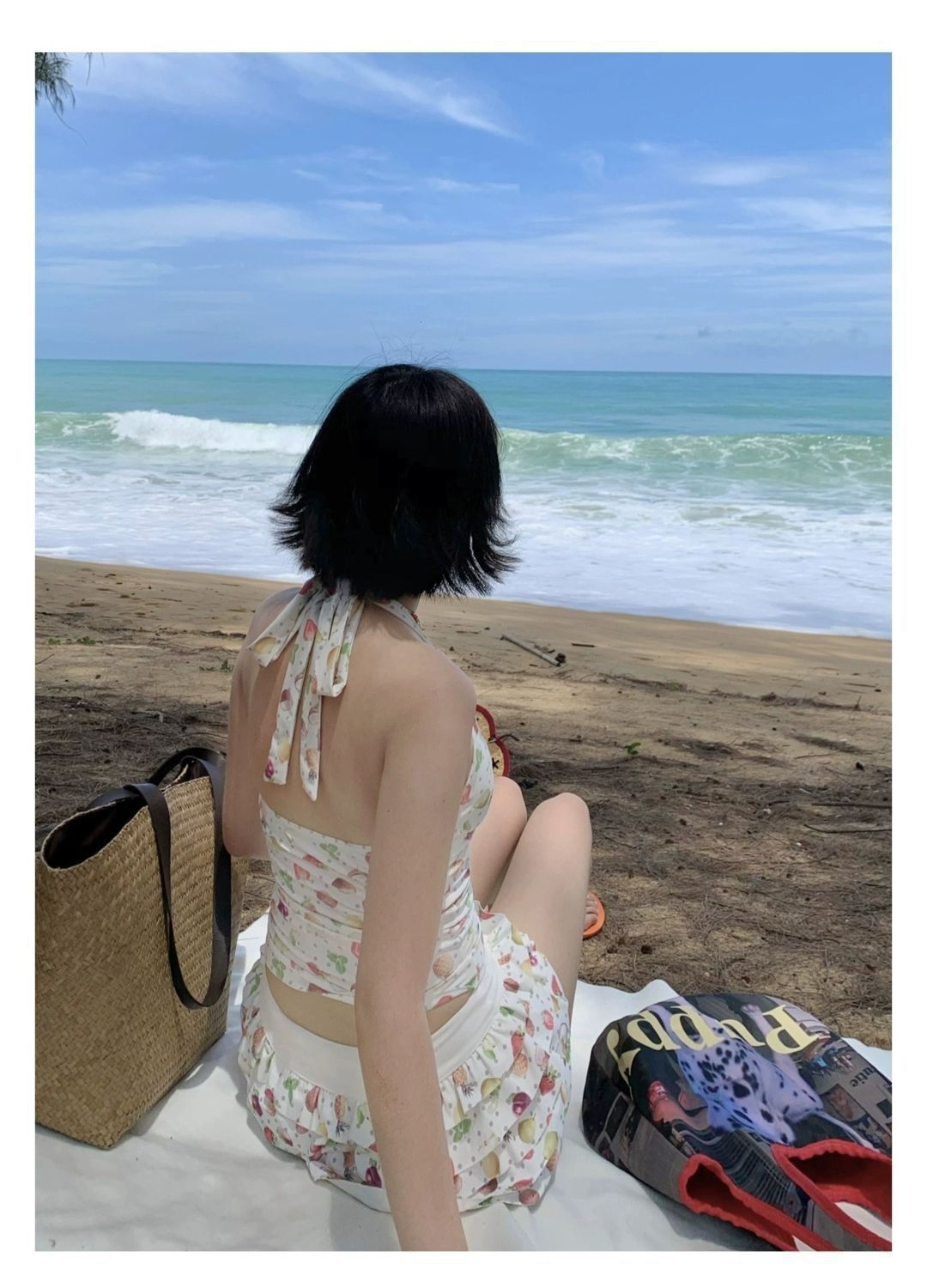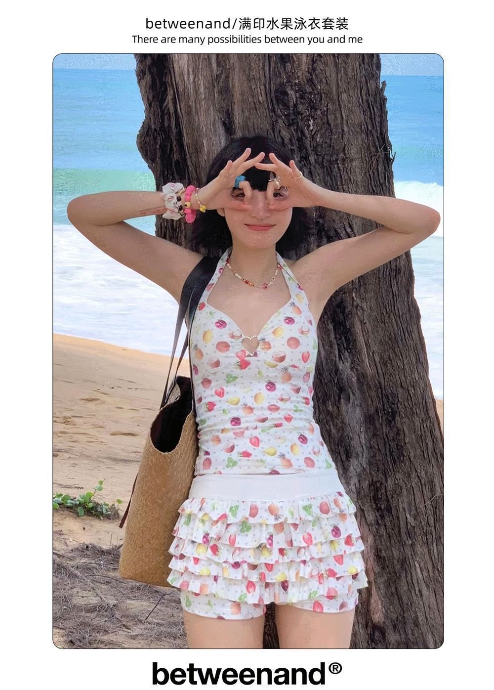 2026년 신상 순수하고 섹시한 여름 과일무늬 프린트 해변 온천 수영복 여성용 러플 반바지 투피스 세트스토어 가기