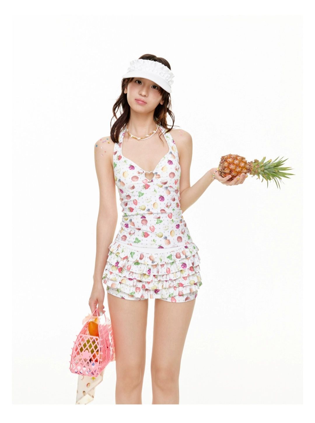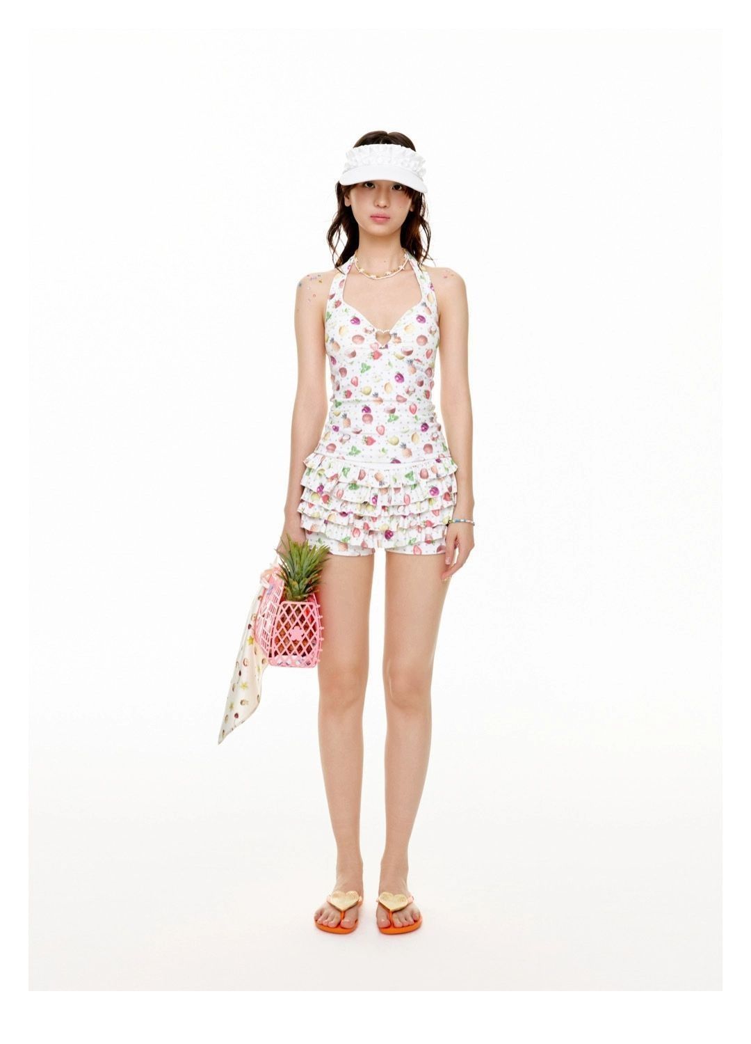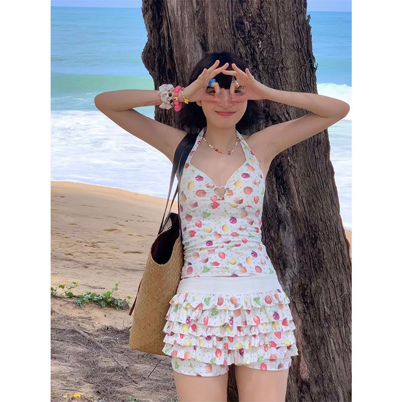 2026년 신상 순수하고 섹시한 여름 과일무늬 프린트 해변 온천 수영복 여성용 러플 반바지 투피스 세트