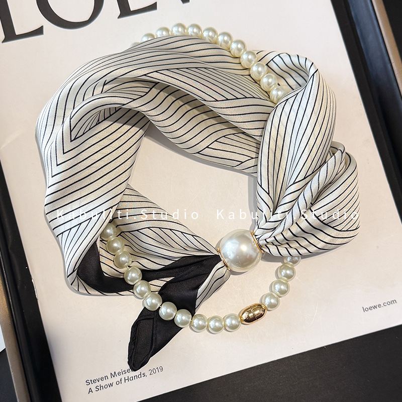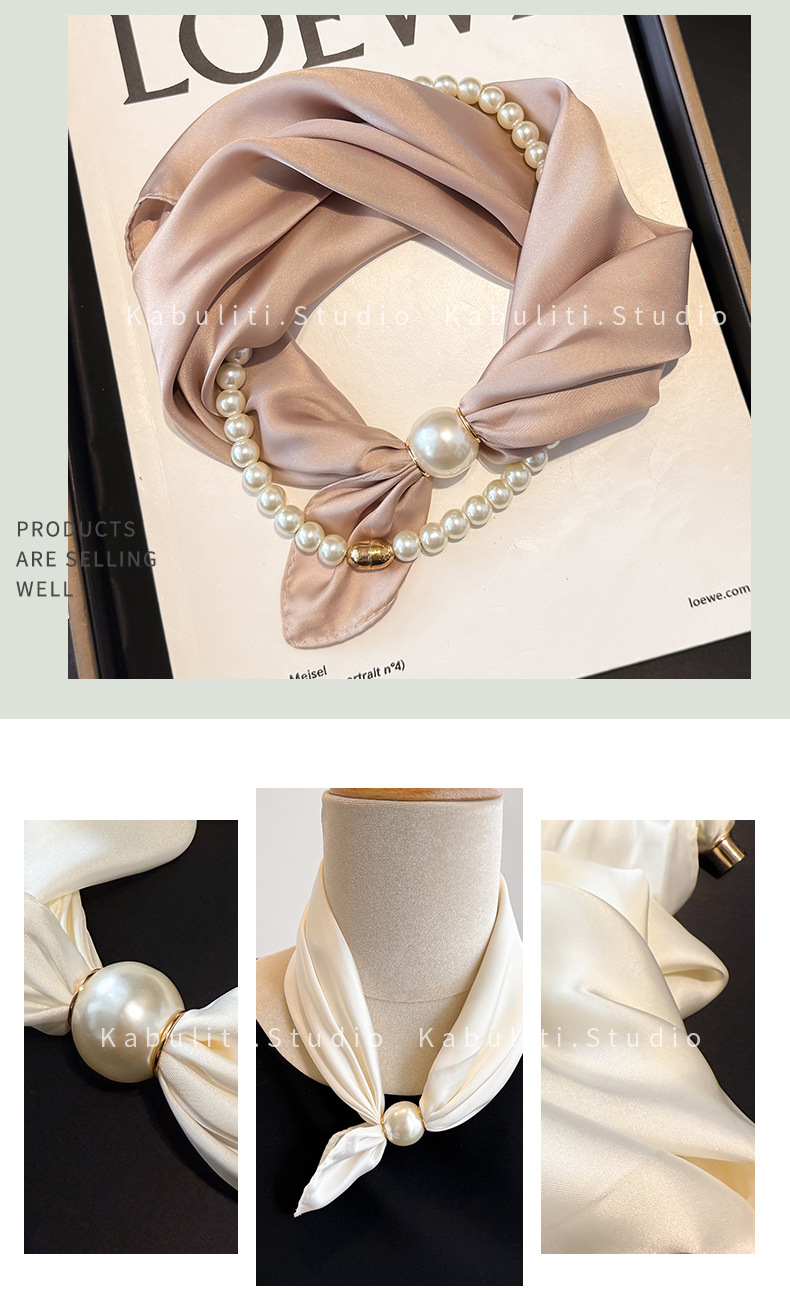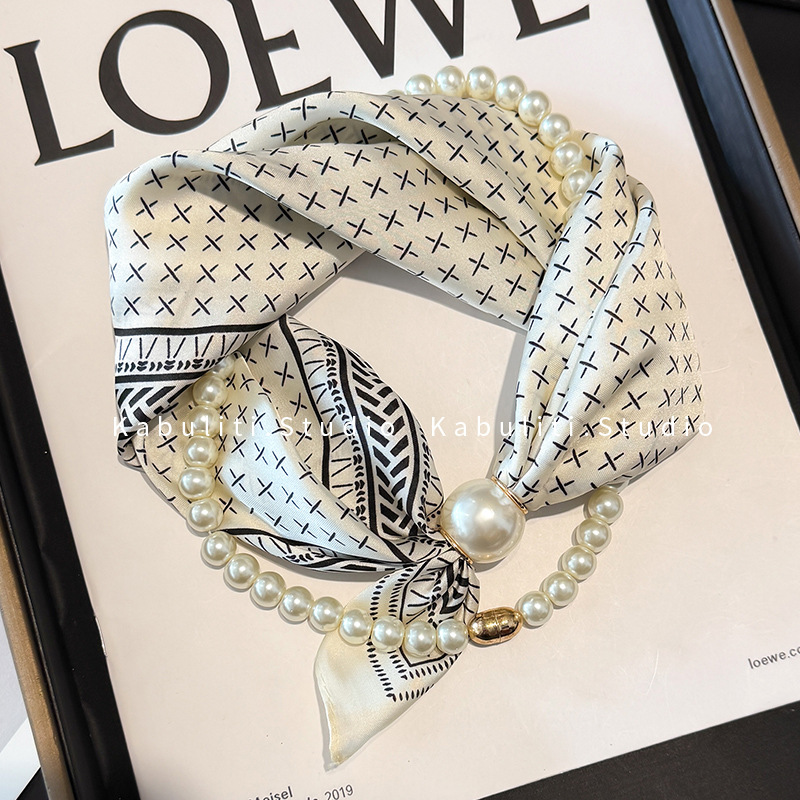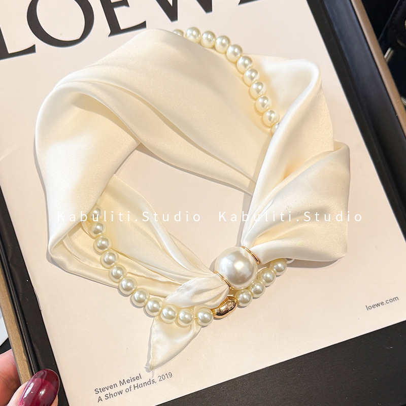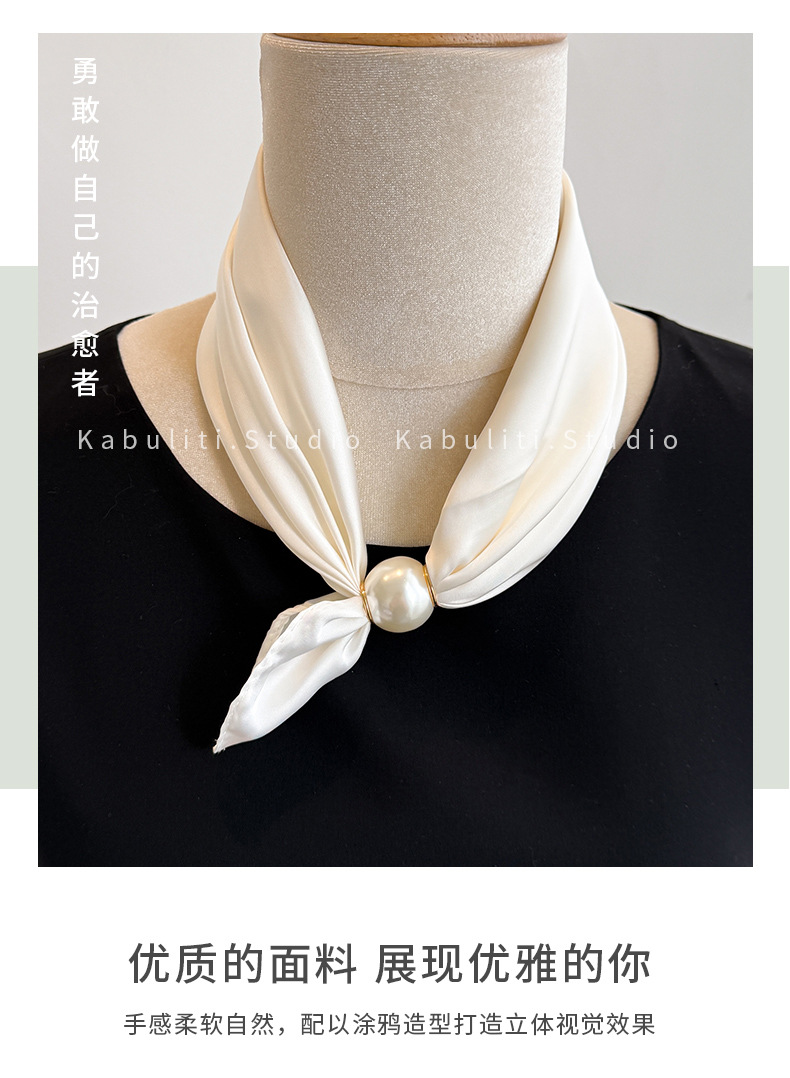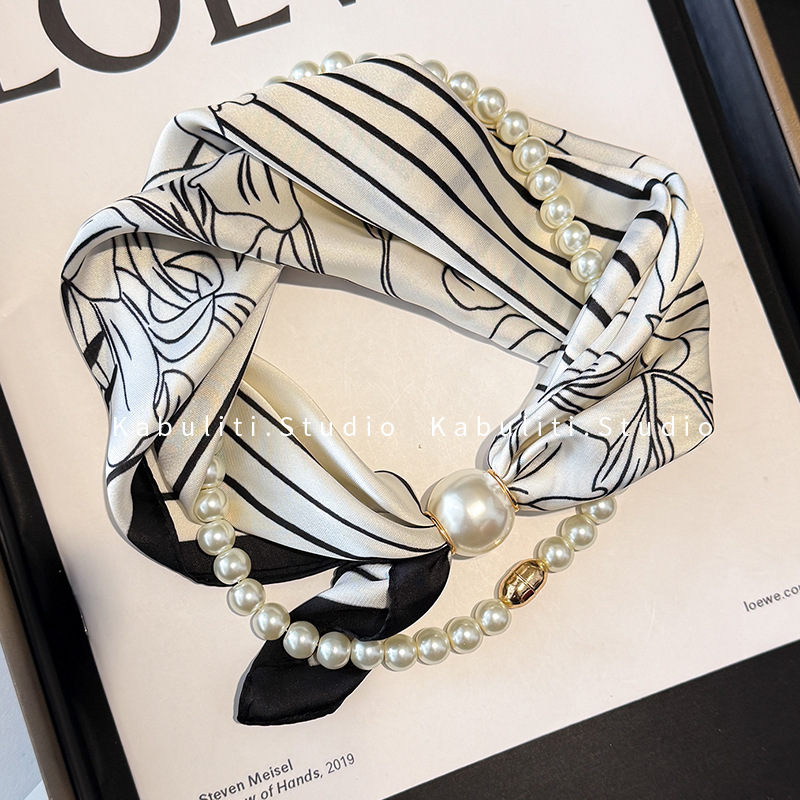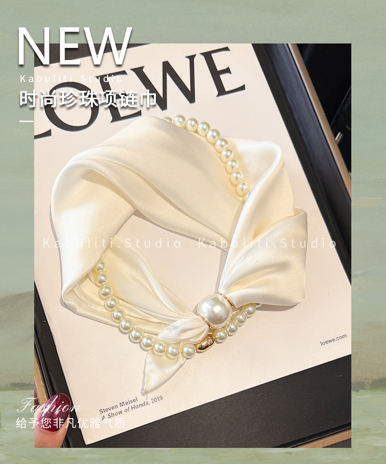 미색 자석 버클 진주 목걸이, 좁은 귀, 긴 실크 스카프, 셔츠와 얇은 스카프가 있는 여성용 목 보호대스토어 가기