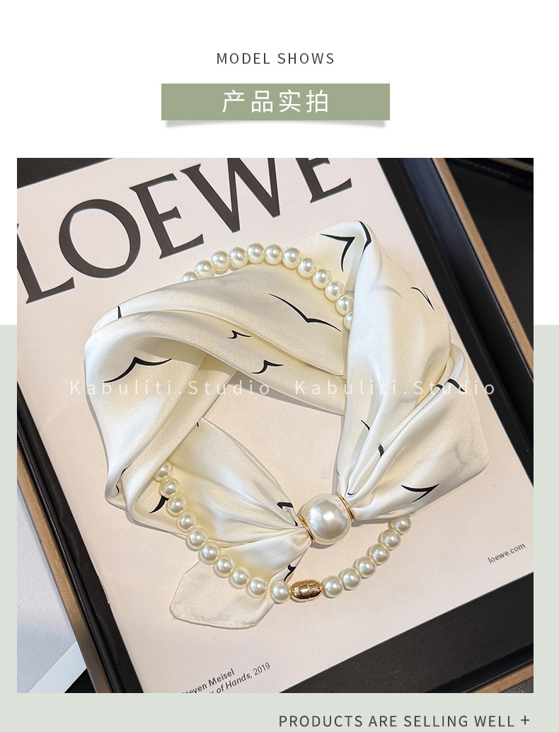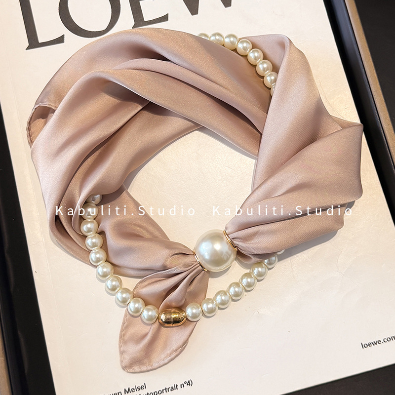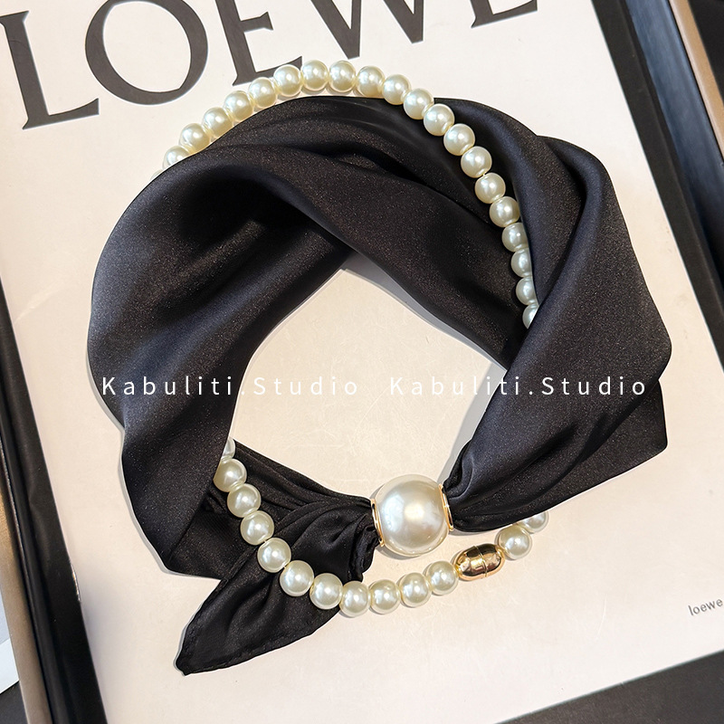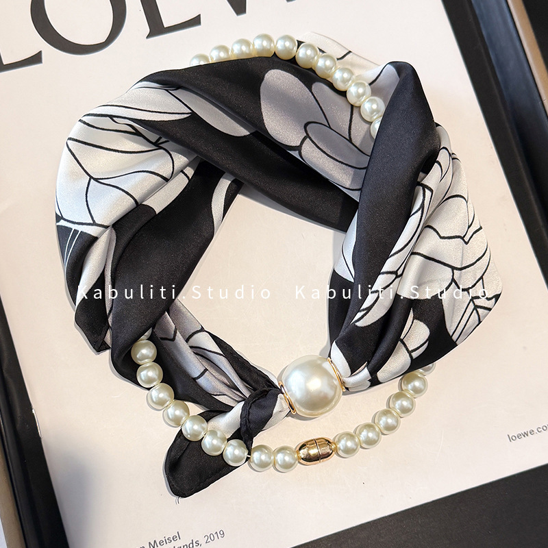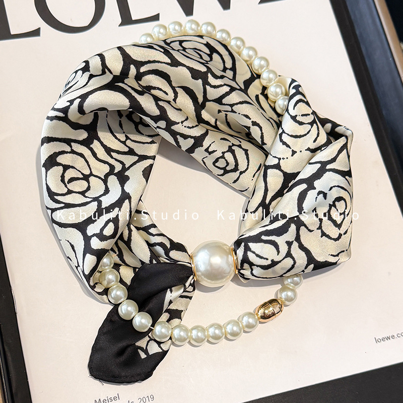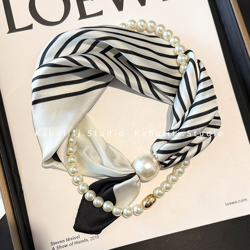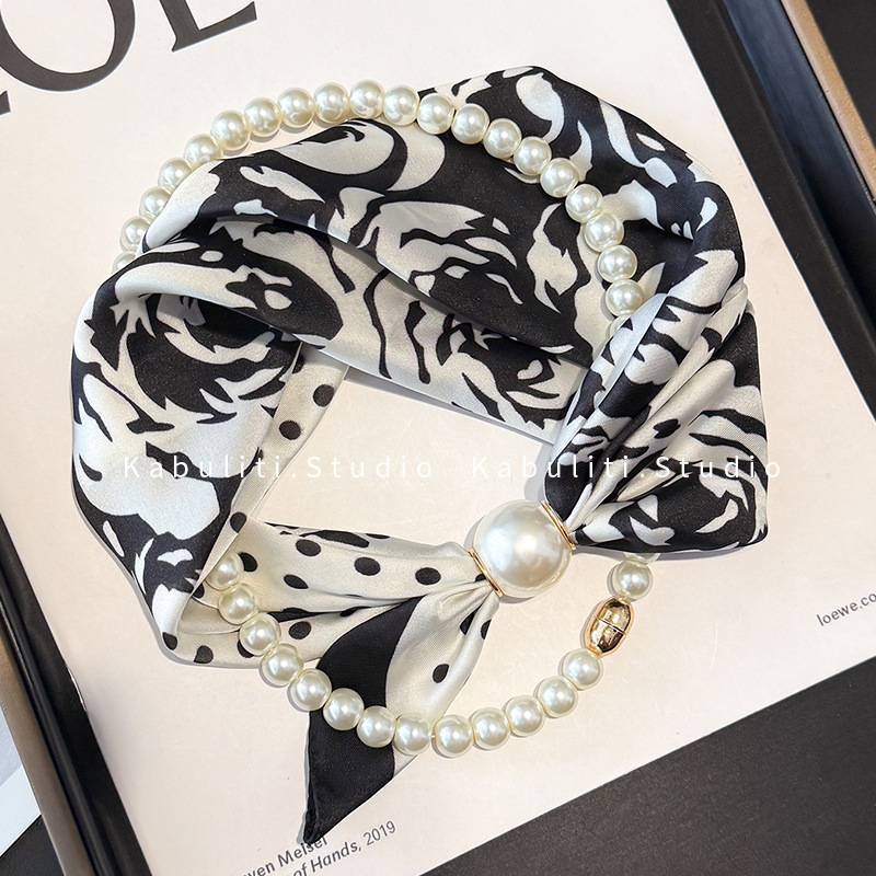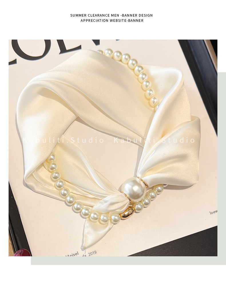 미색 자석 버클 진주 목걸이, 좁은 귀, 긴 실크 스카프, 셔츠와 얇은 스카프가 있는 여성용 목 보호대스토어 가기