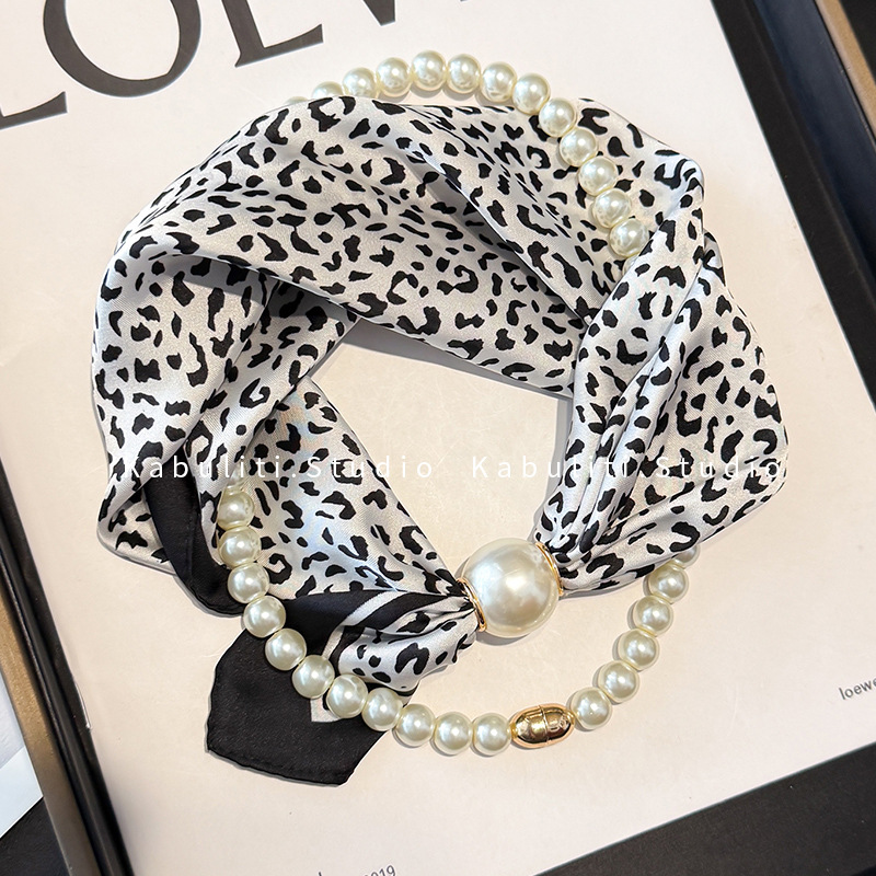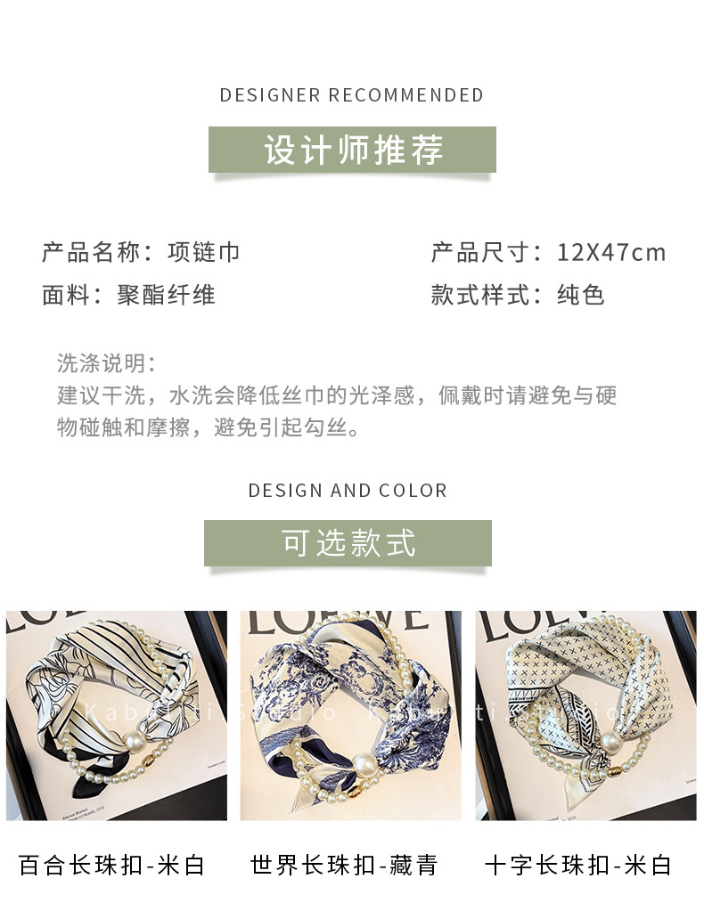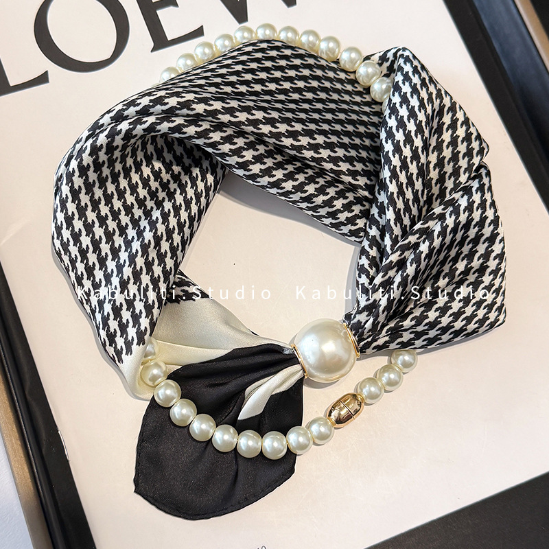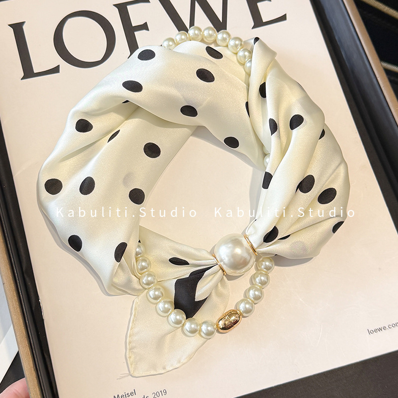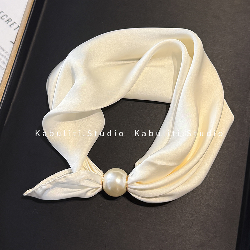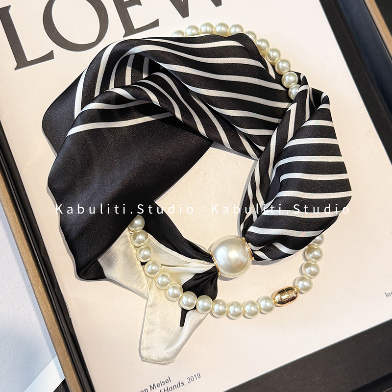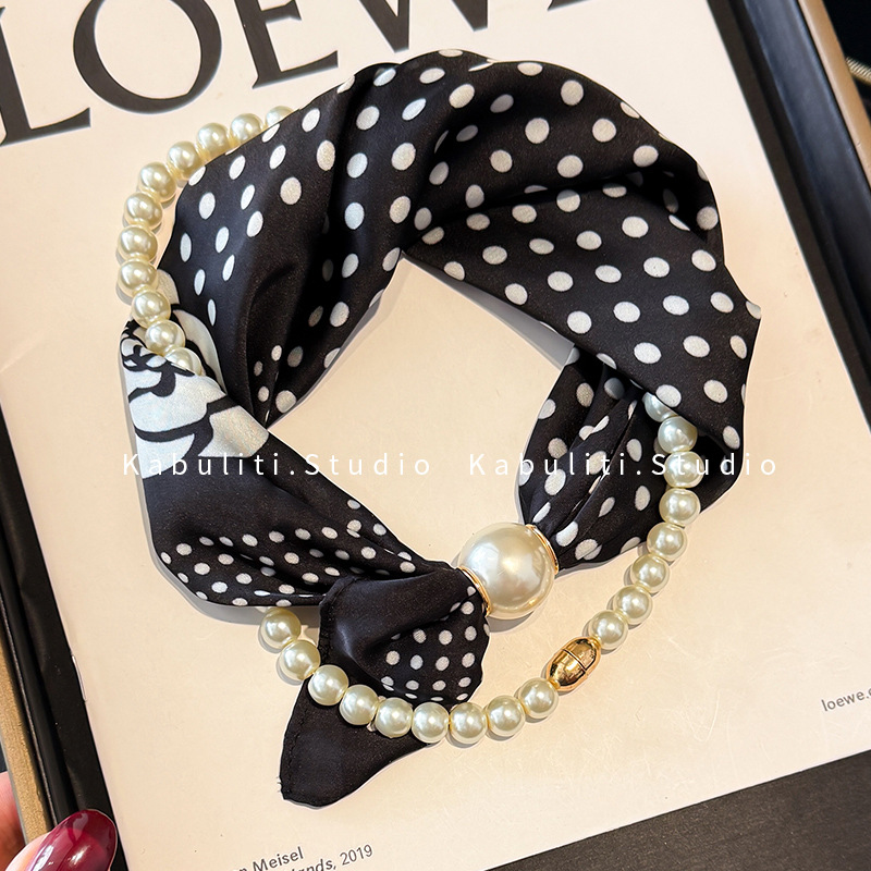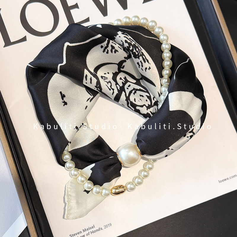 미색 자석 버클 진주 목걸이, 좁은 귀, 긴 실크 스카프, 셔츠와 얇은 스카프가 있는 여성용 목 보호대스토어 가기