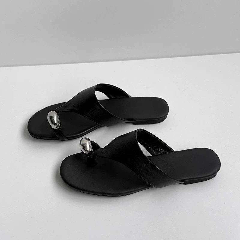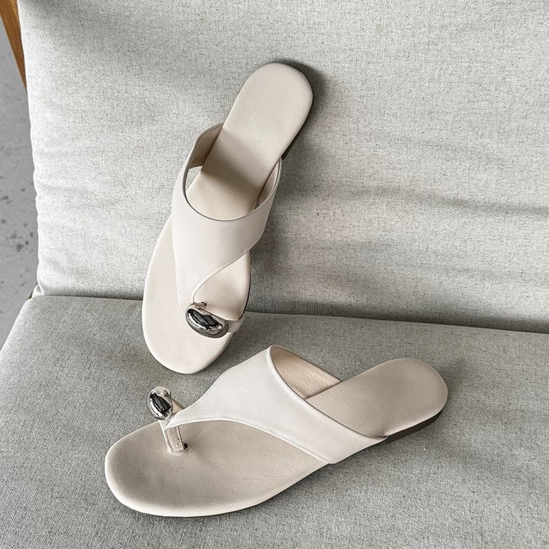 Cowhide 버전 ~ 한국 금속 발가락 플립 플롭 여성 외부 2025 여름 새로운 패션 플랫 샌들