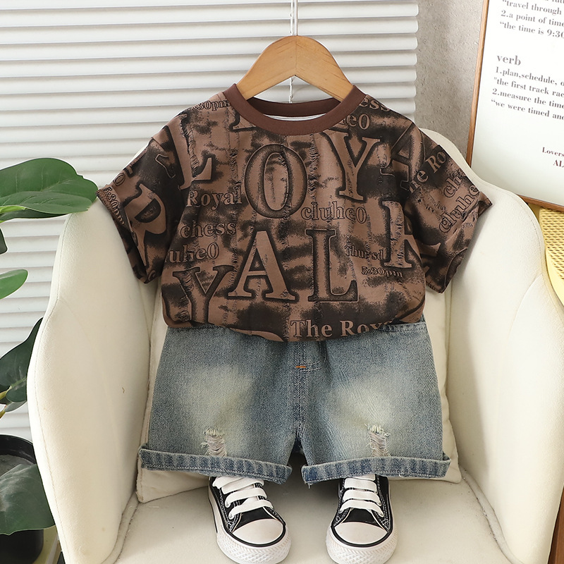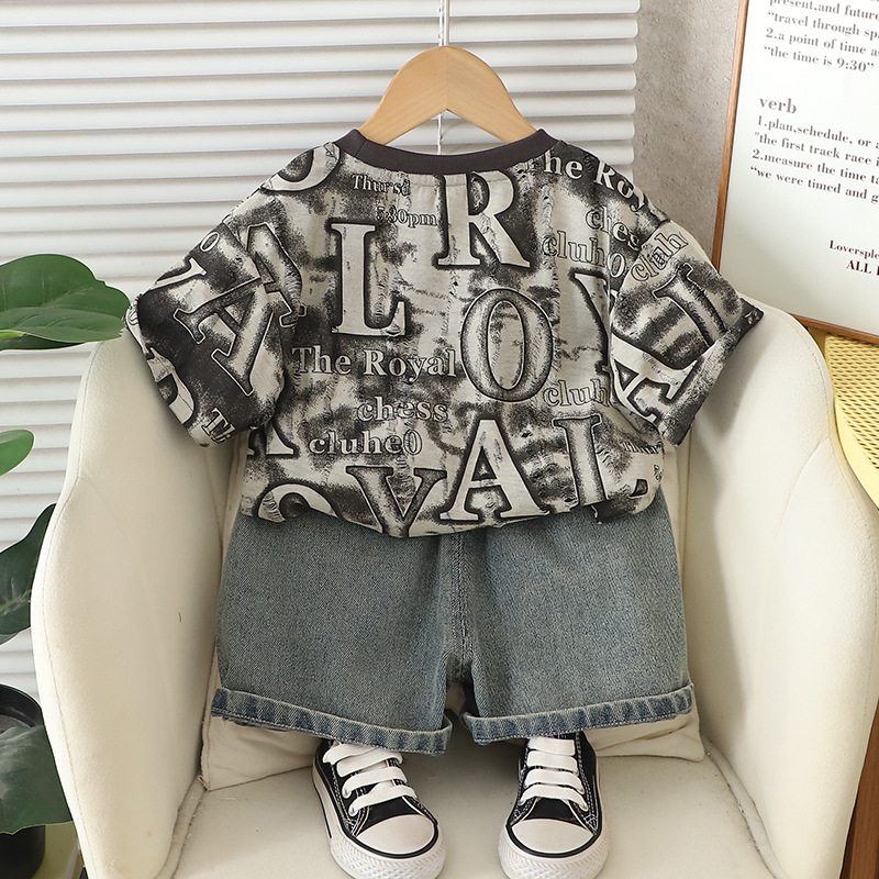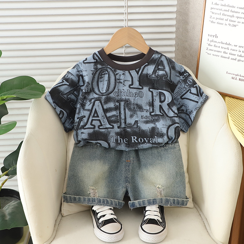 한국 스타일 여름 새로운 유행 서양식 전체 인쇄 라운드 목 짧은 소매 소년 아기 유행 투피스 세트 아동복 어린 소년스토어 가기