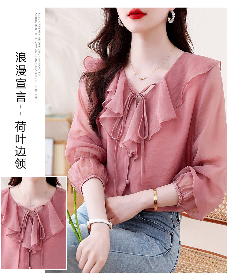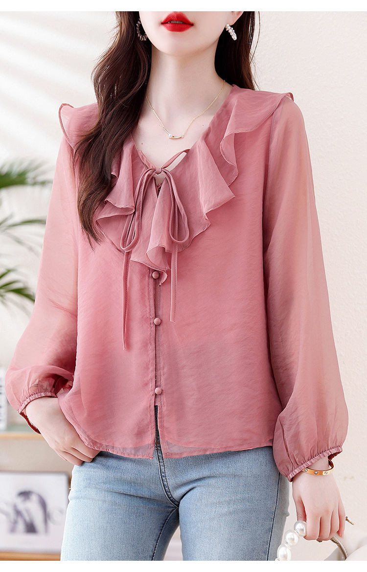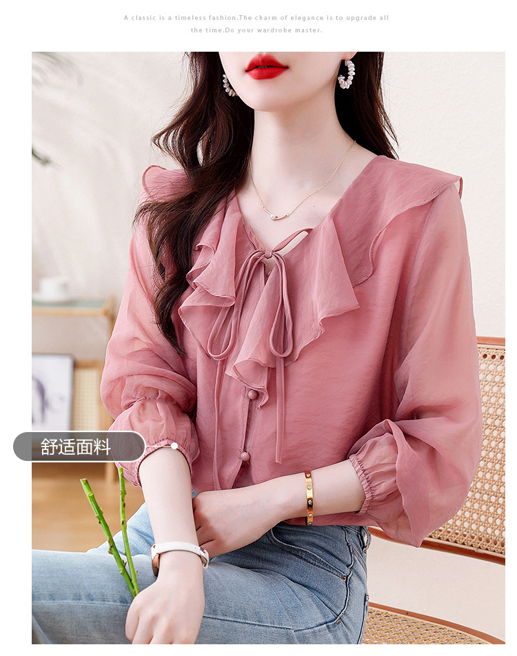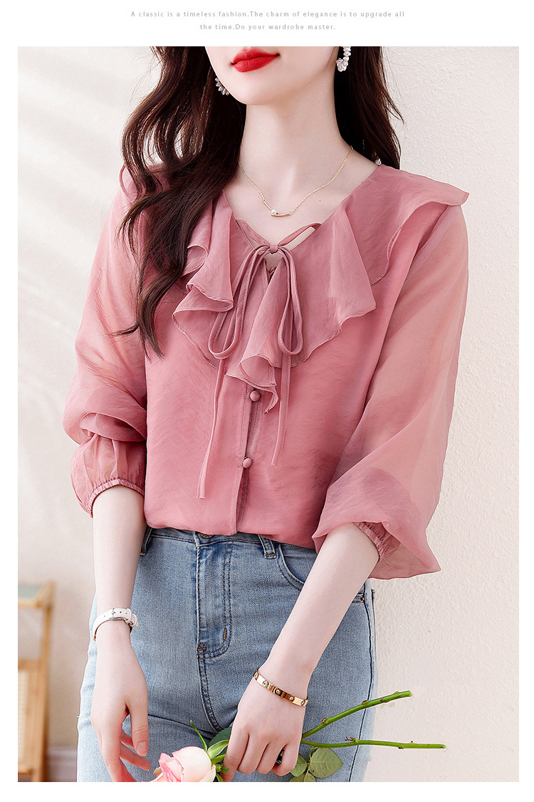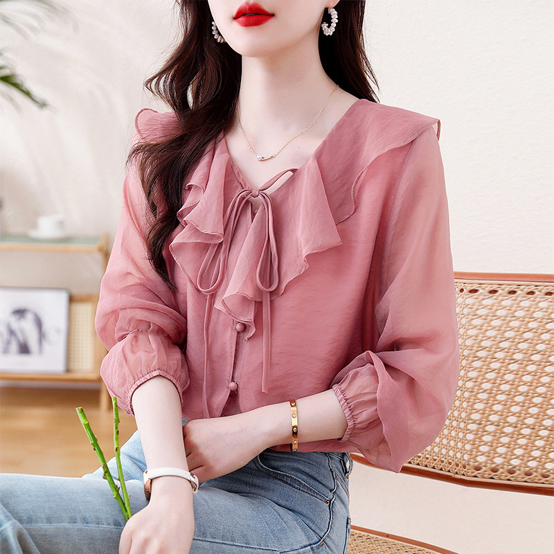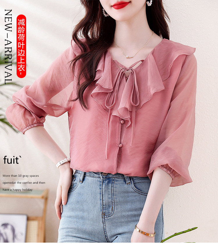 프랑스 스타일 부드러운 연령 감소 러플 V 넥 셔츠 여성의 2025 년 봄과 여름 달콤한 우아한 인형 셔츠 선스크린 탑스토어 가기