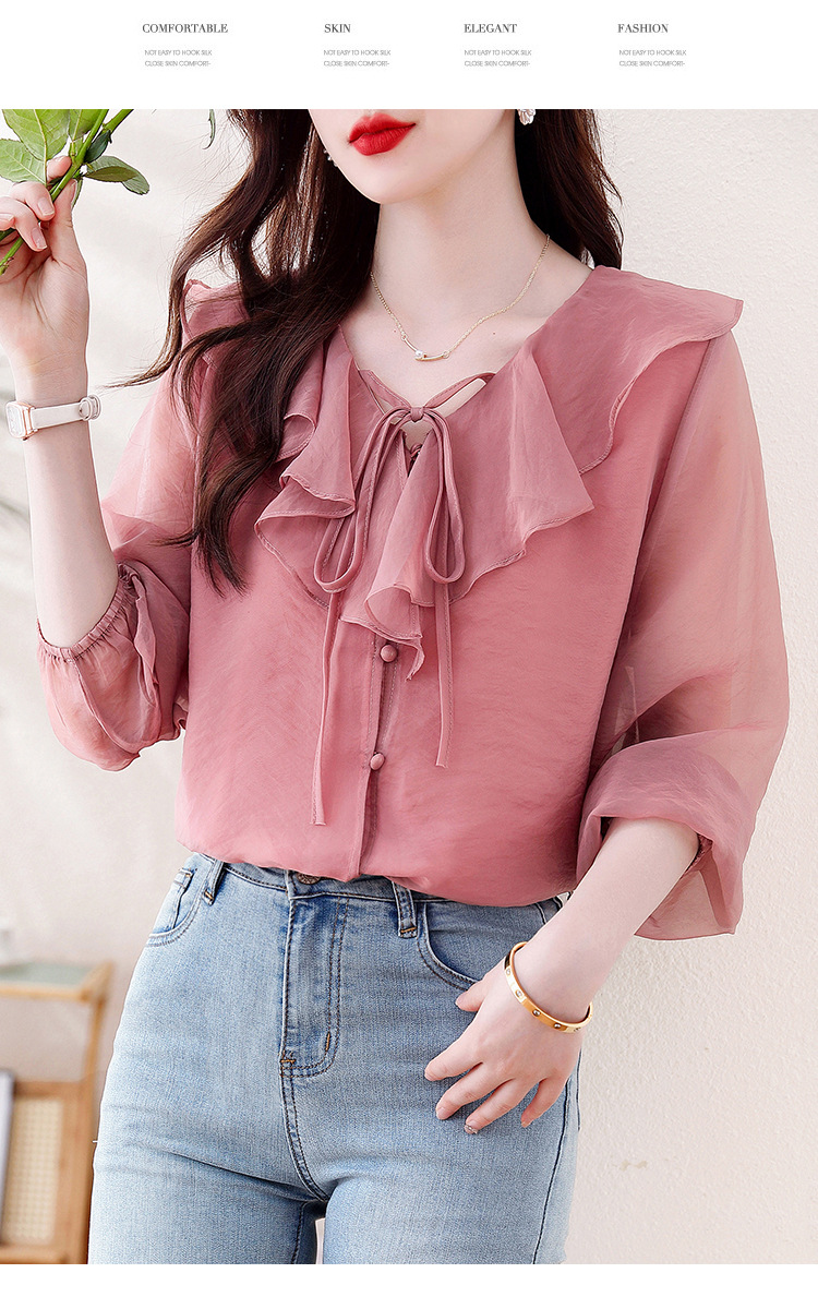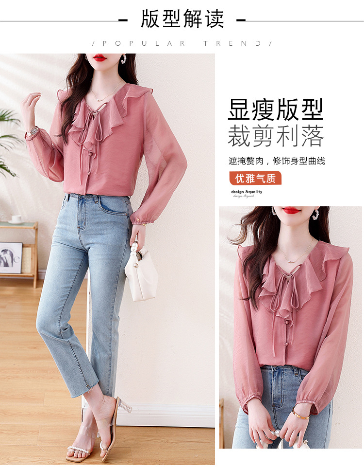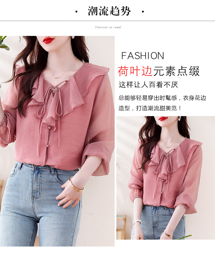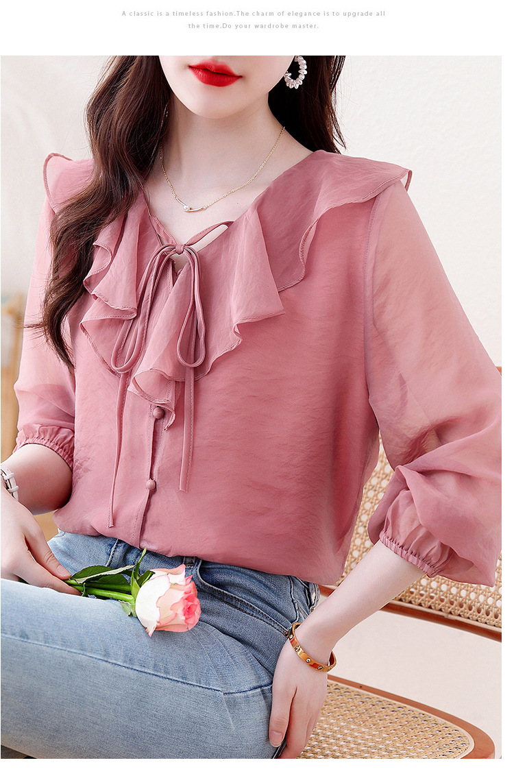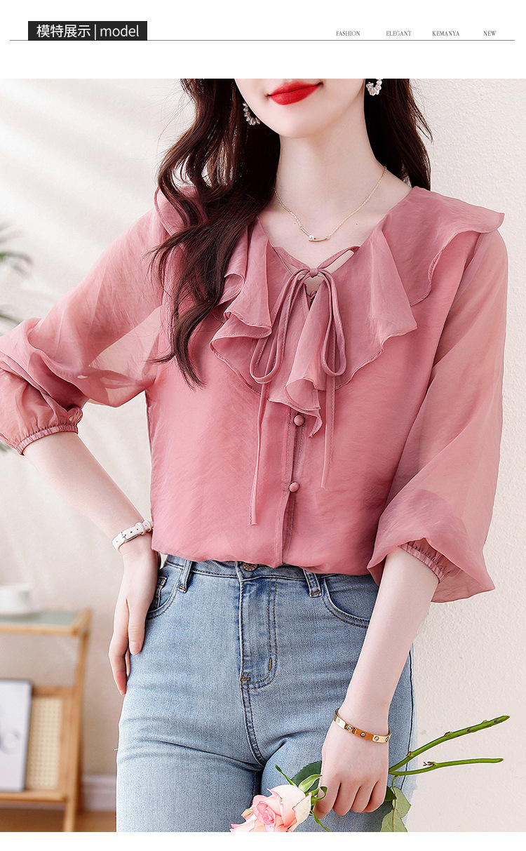 프랑스 스타일 부드러운 연령 감소 러플 V 넥 셔츠 여성의 2025 년 봄과 여름 달콤한 우아한 인형 셔츠 선스크린 탑스토어 가기