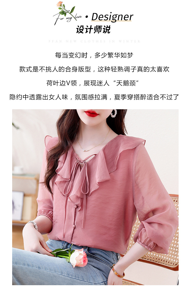 프랑스 스타일 부드러운 연령 감소 러플 V 넥 셔츠 여성의 2025 년 봄과 여름 달콤한 우아한 인형 셔츠 선스크린 탑