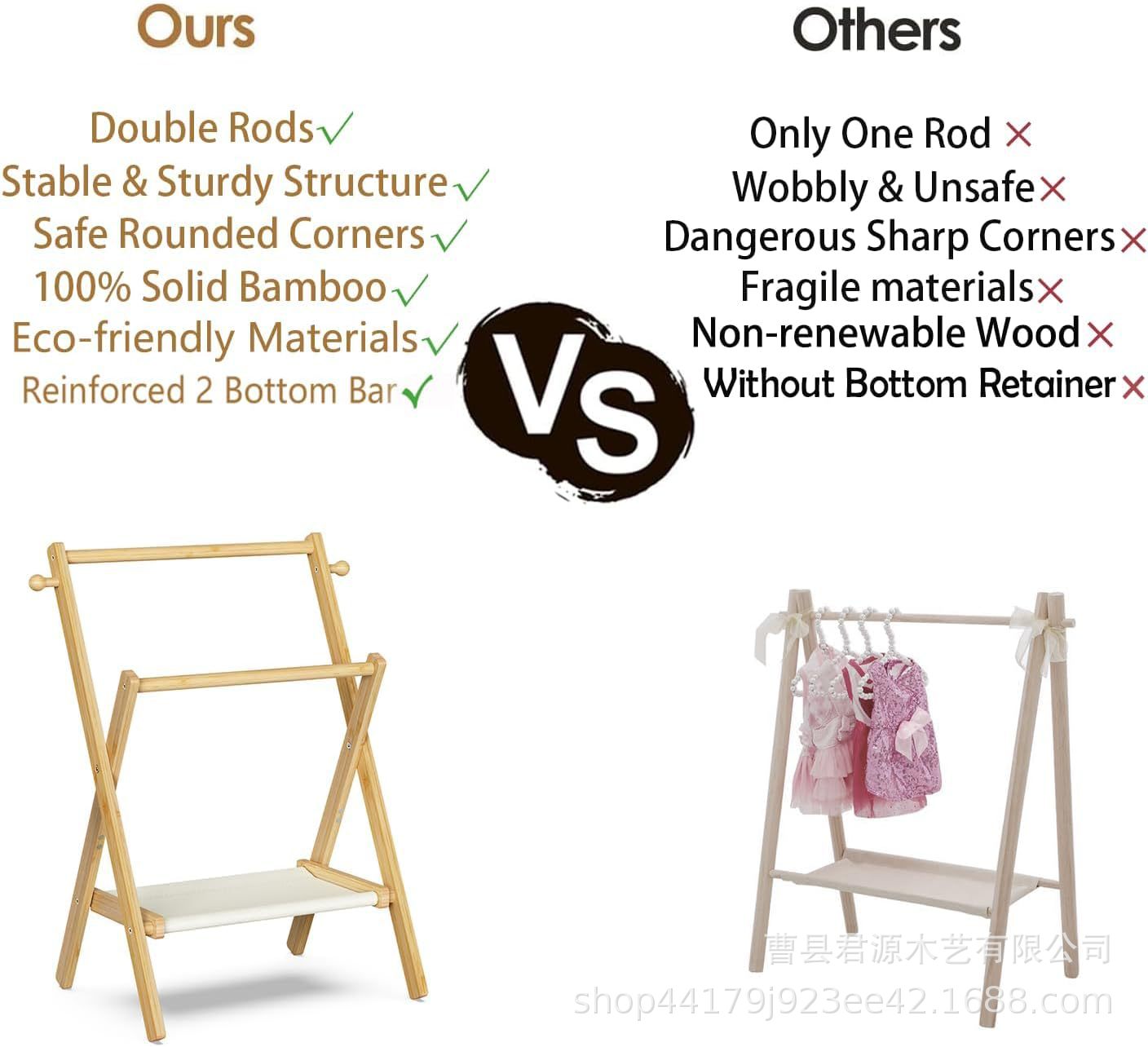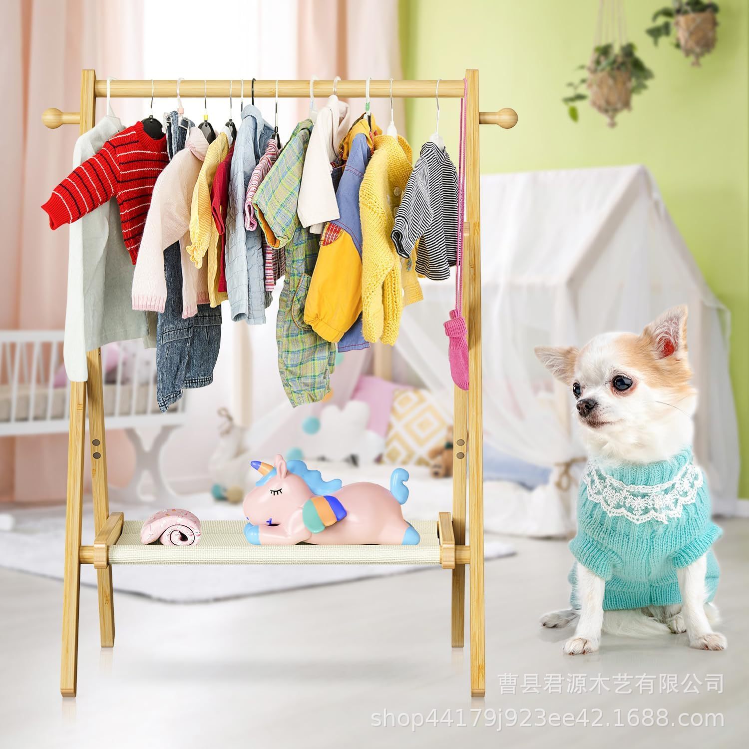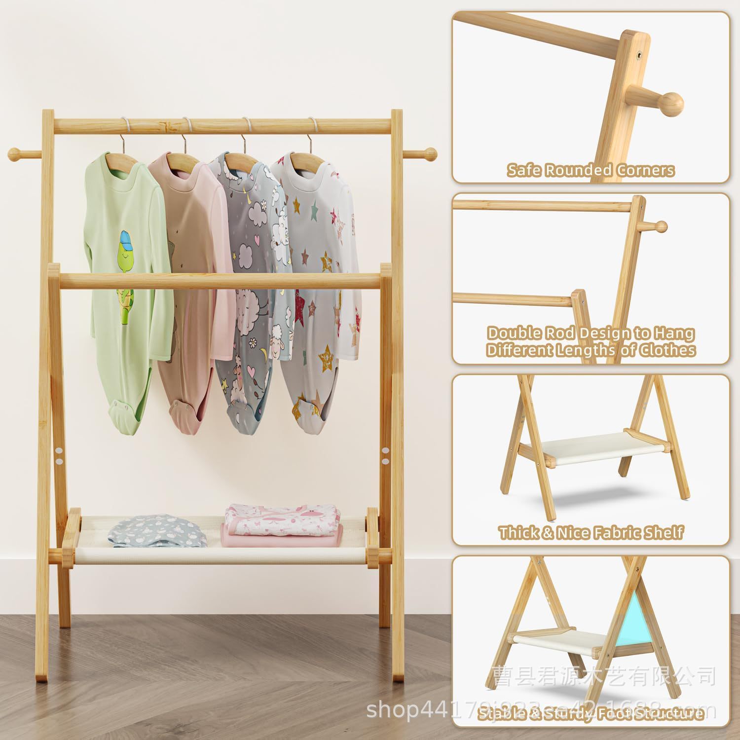 보관 선반과 이중 막대가있는 국경 간 나무 아기 의류 걸이 미니 옷장 랙 아기 목욕 주최자스토어 가기