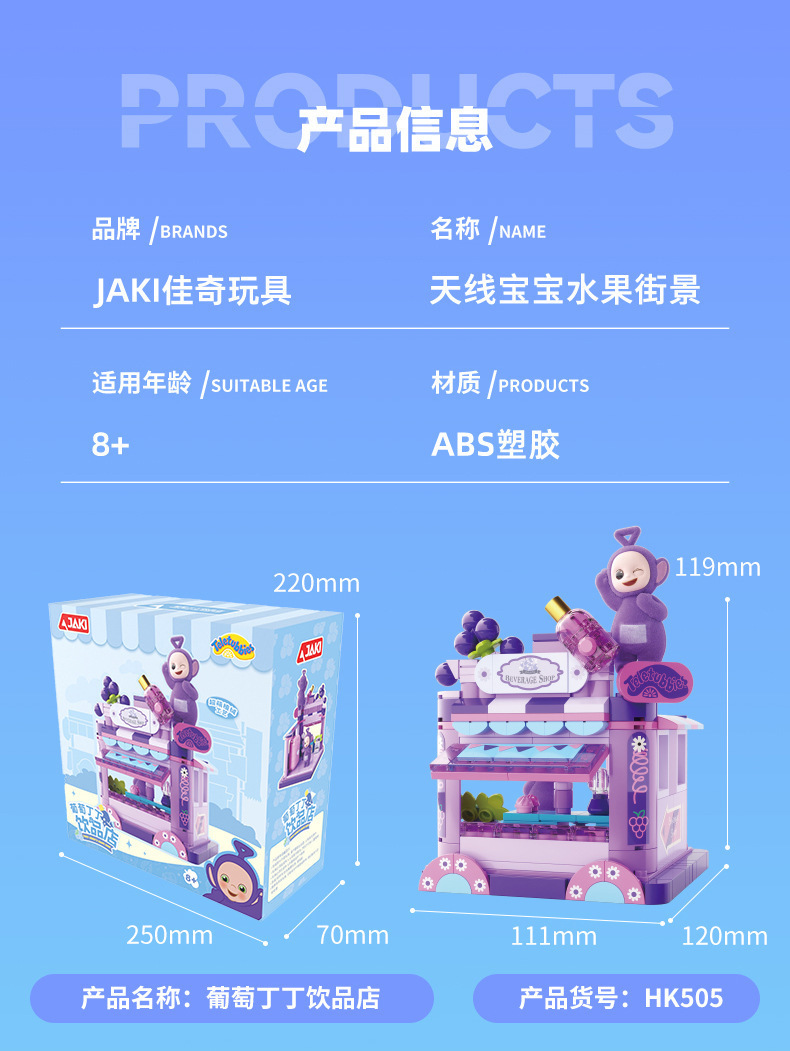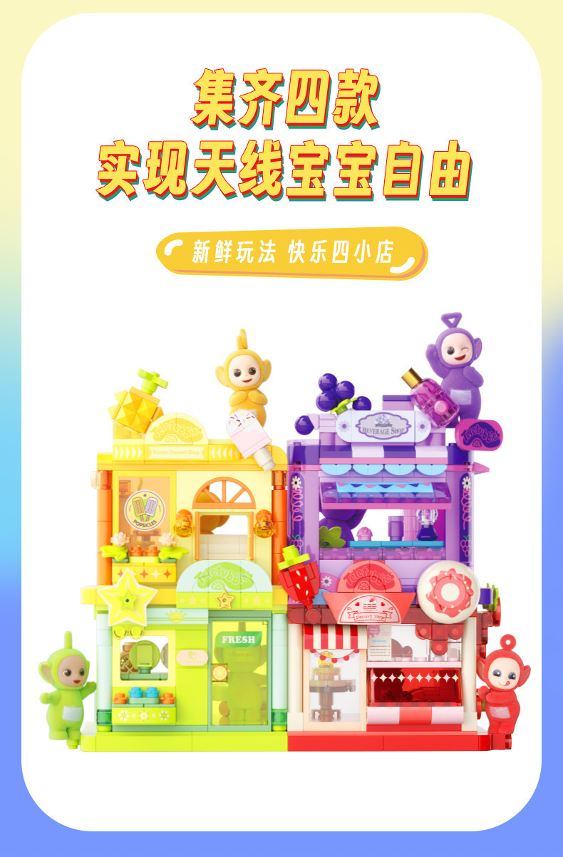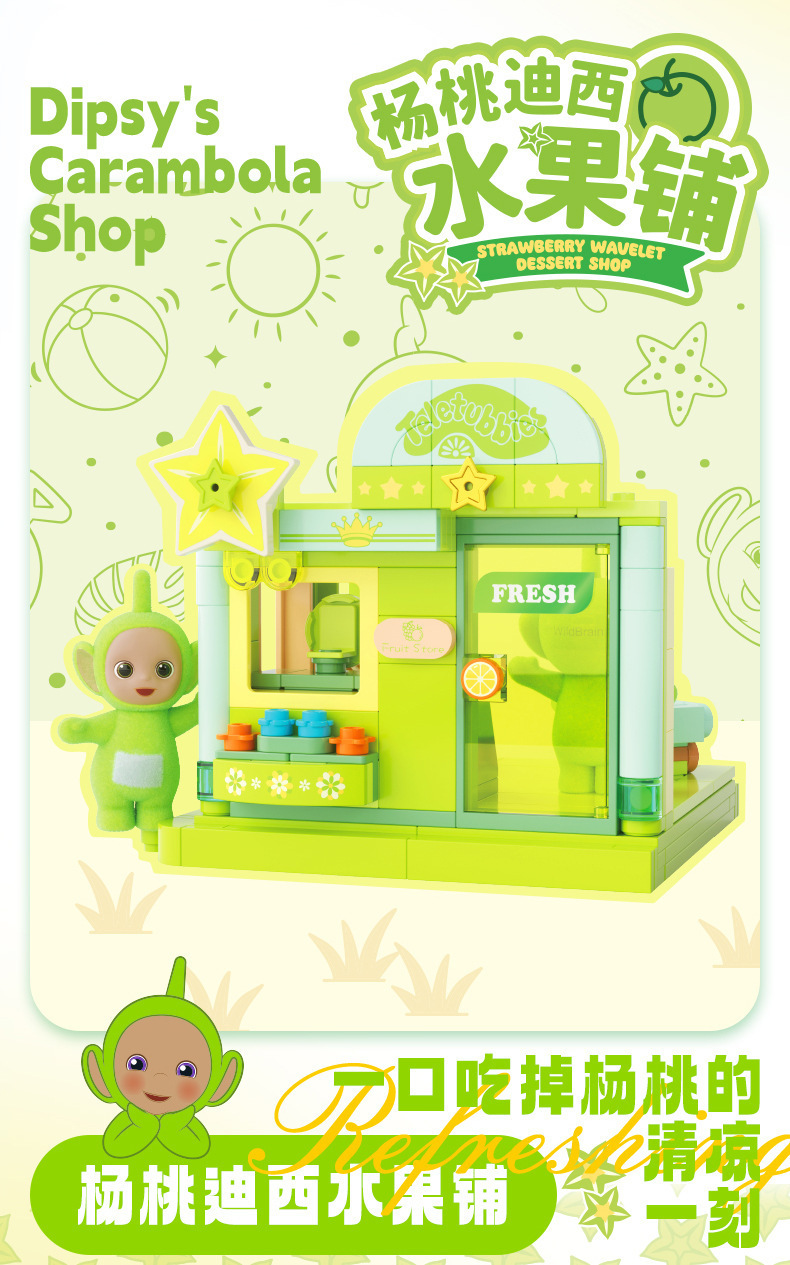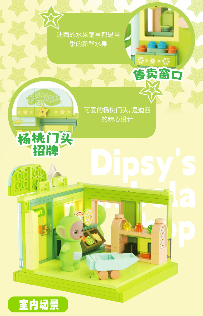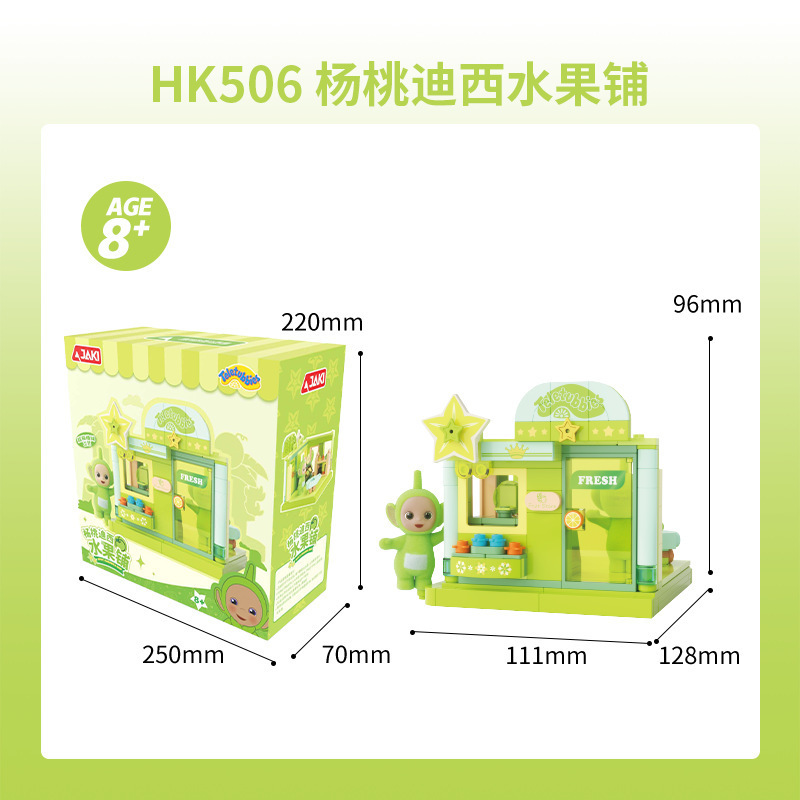 Jiaqi HK501-8 Teletubbies 과일 가게 관람차 장면 장식품 조립 빌딩 블록 Little Red Book 선물스토어 가기