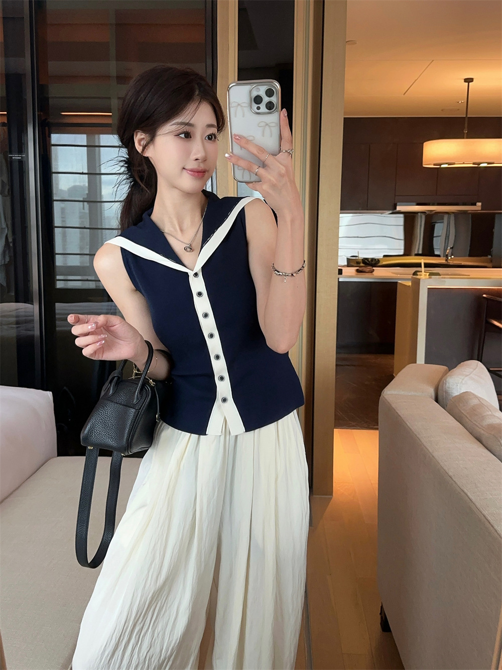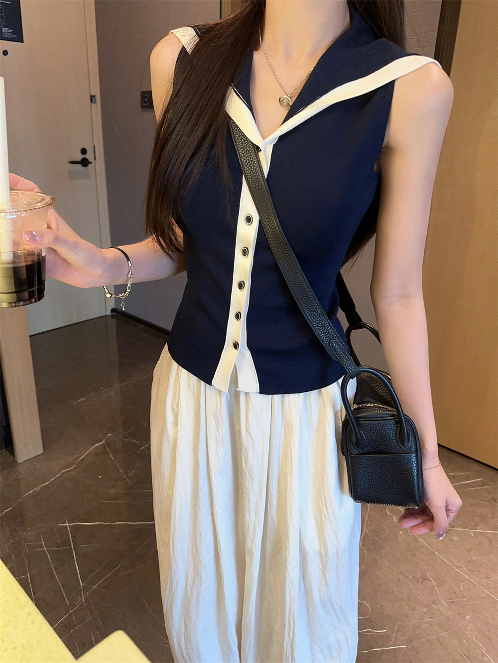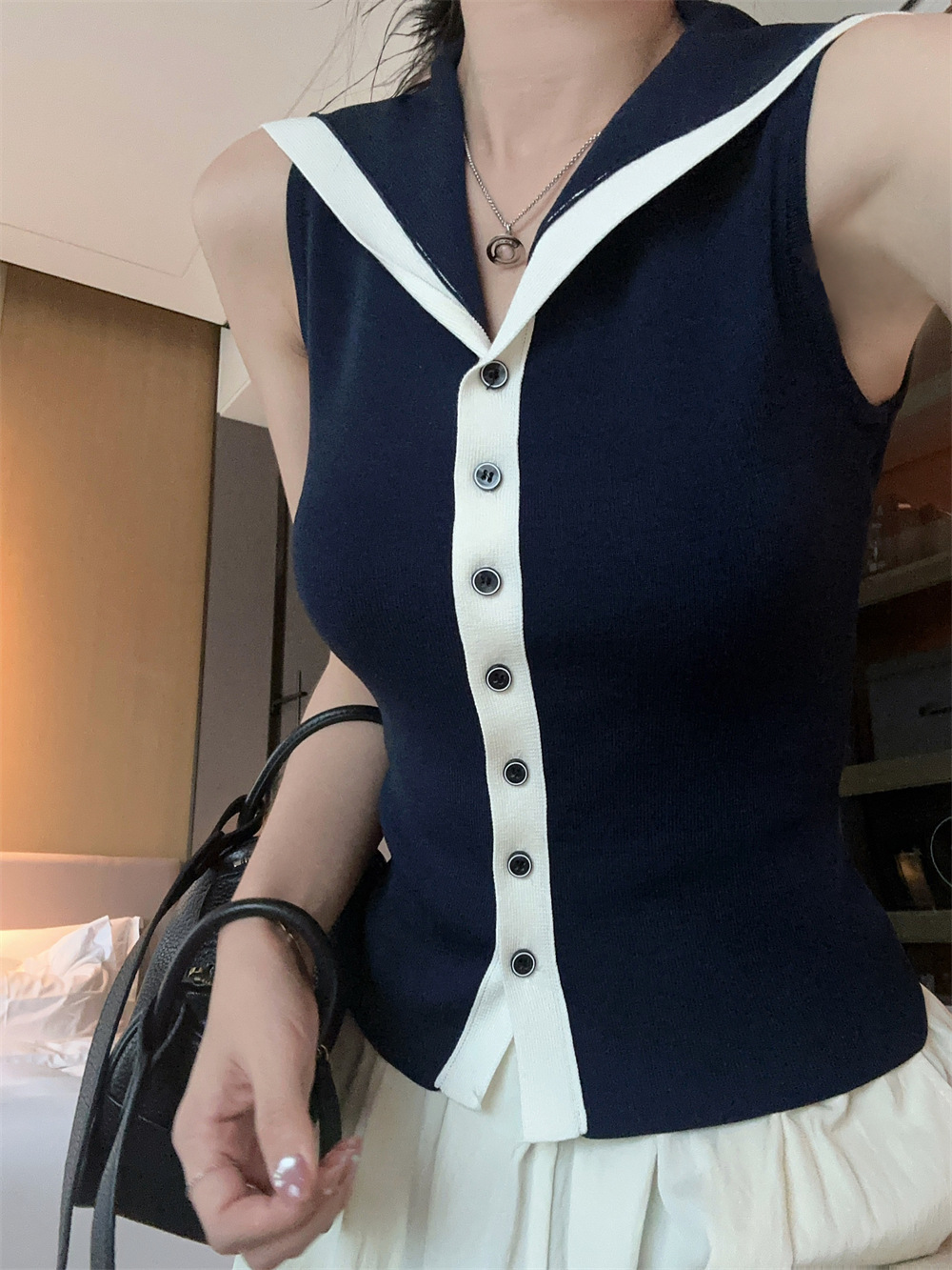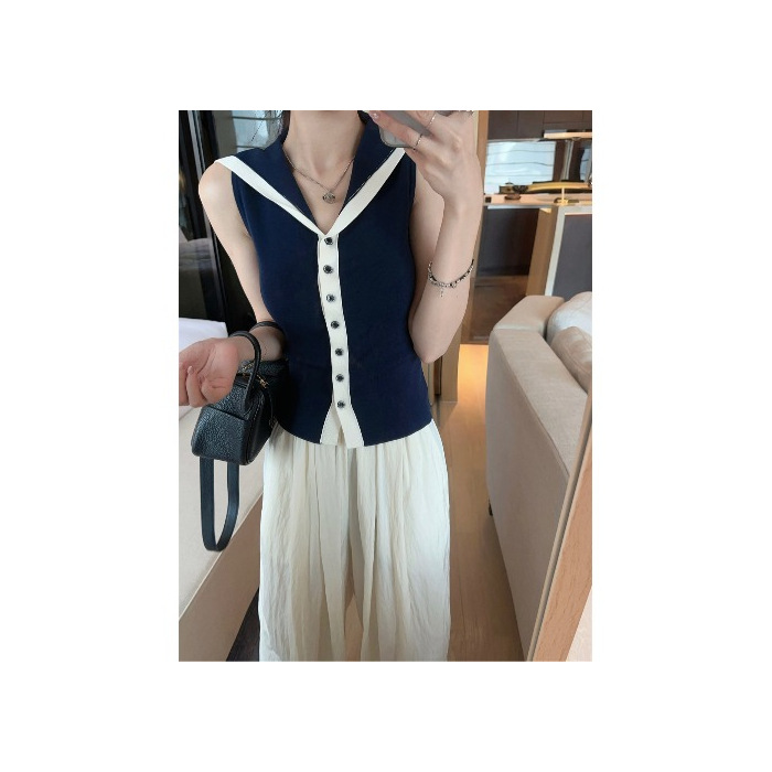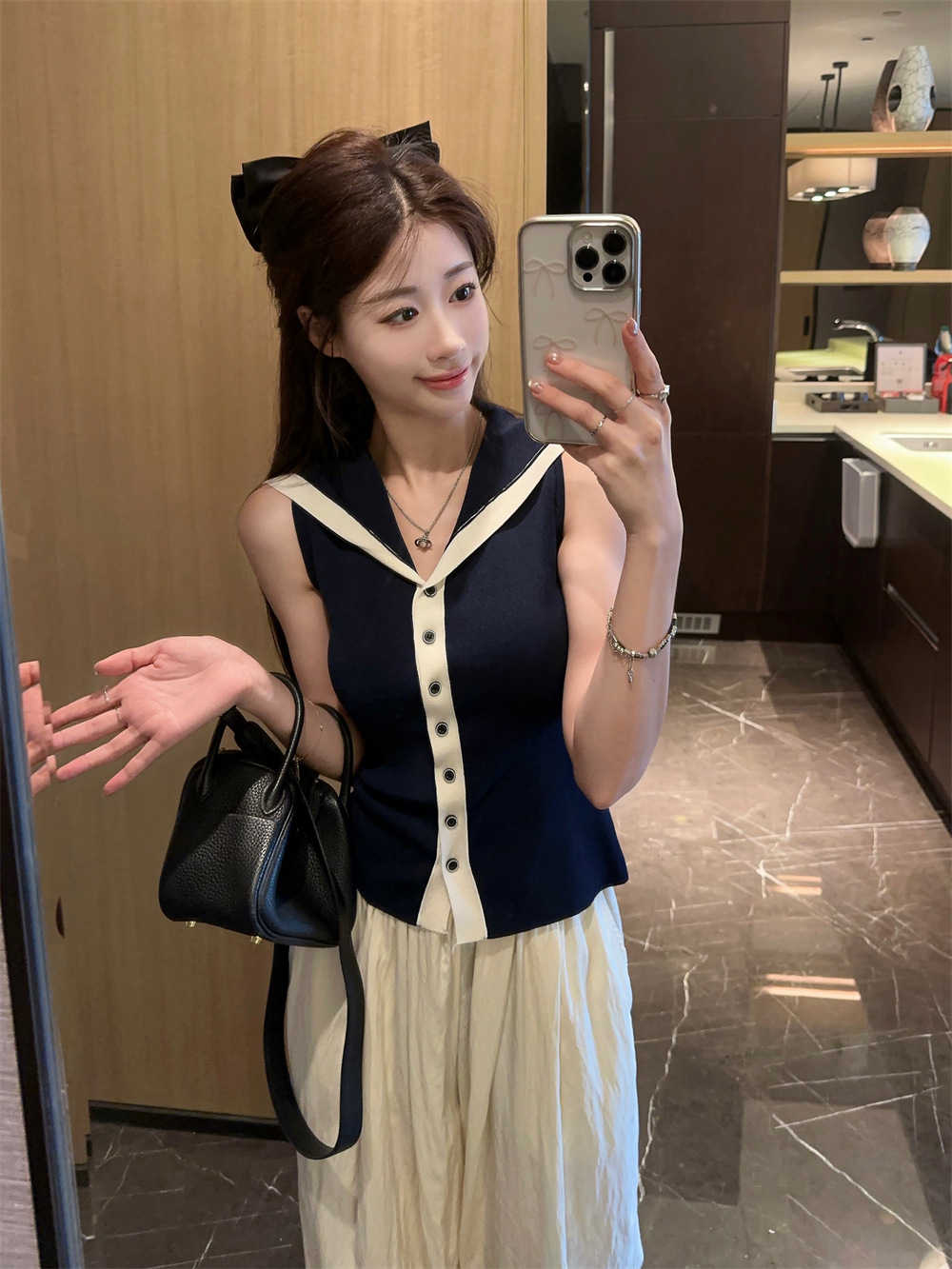 프렌치 레트로 콘트라스트 네이비 칼라 스웨터 여성 여름 뉴 스타일 아우터 아이스 실크 탑 슬림 핏 민소매 조끼 트렌디