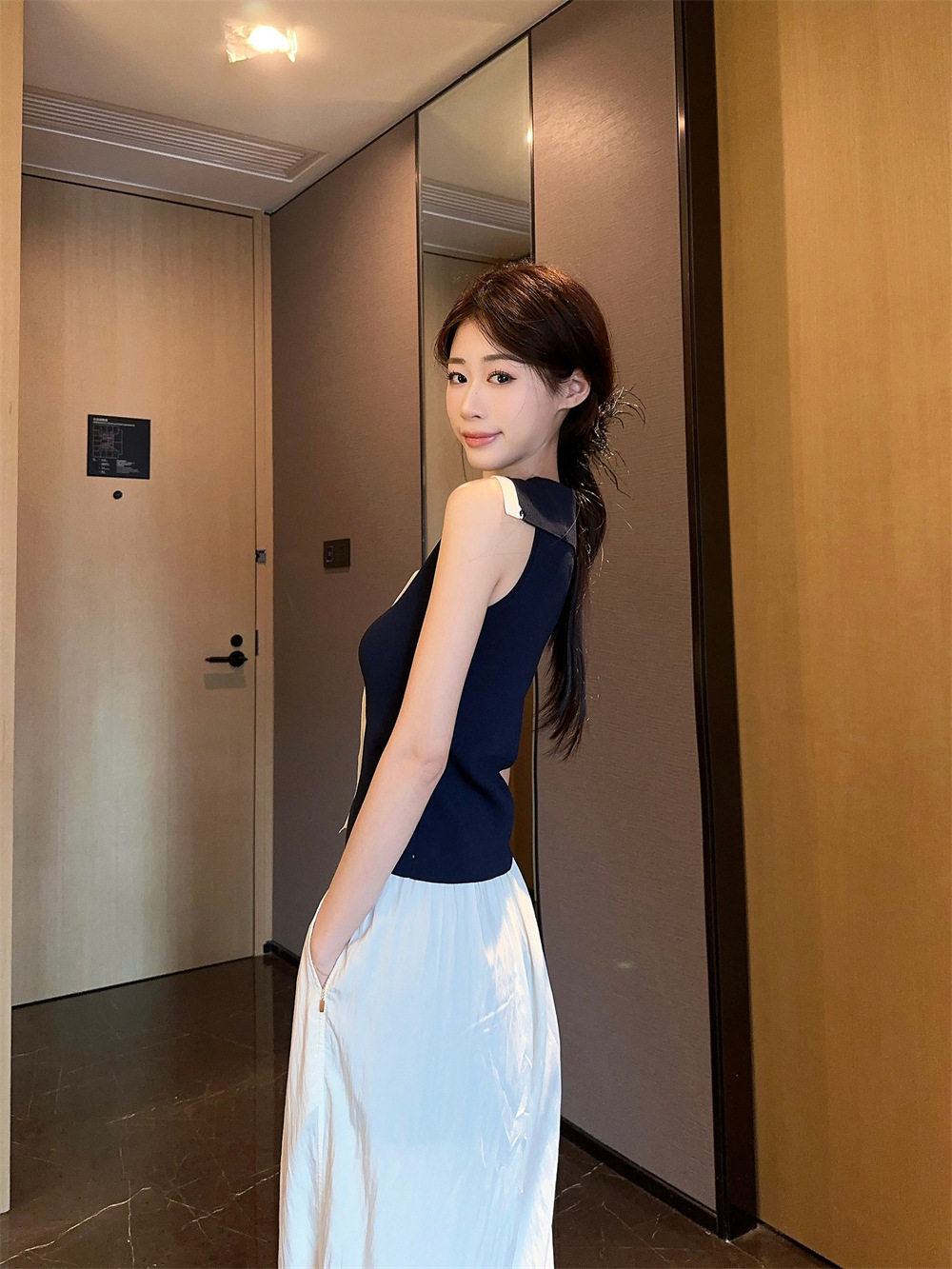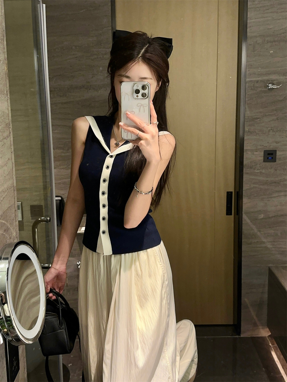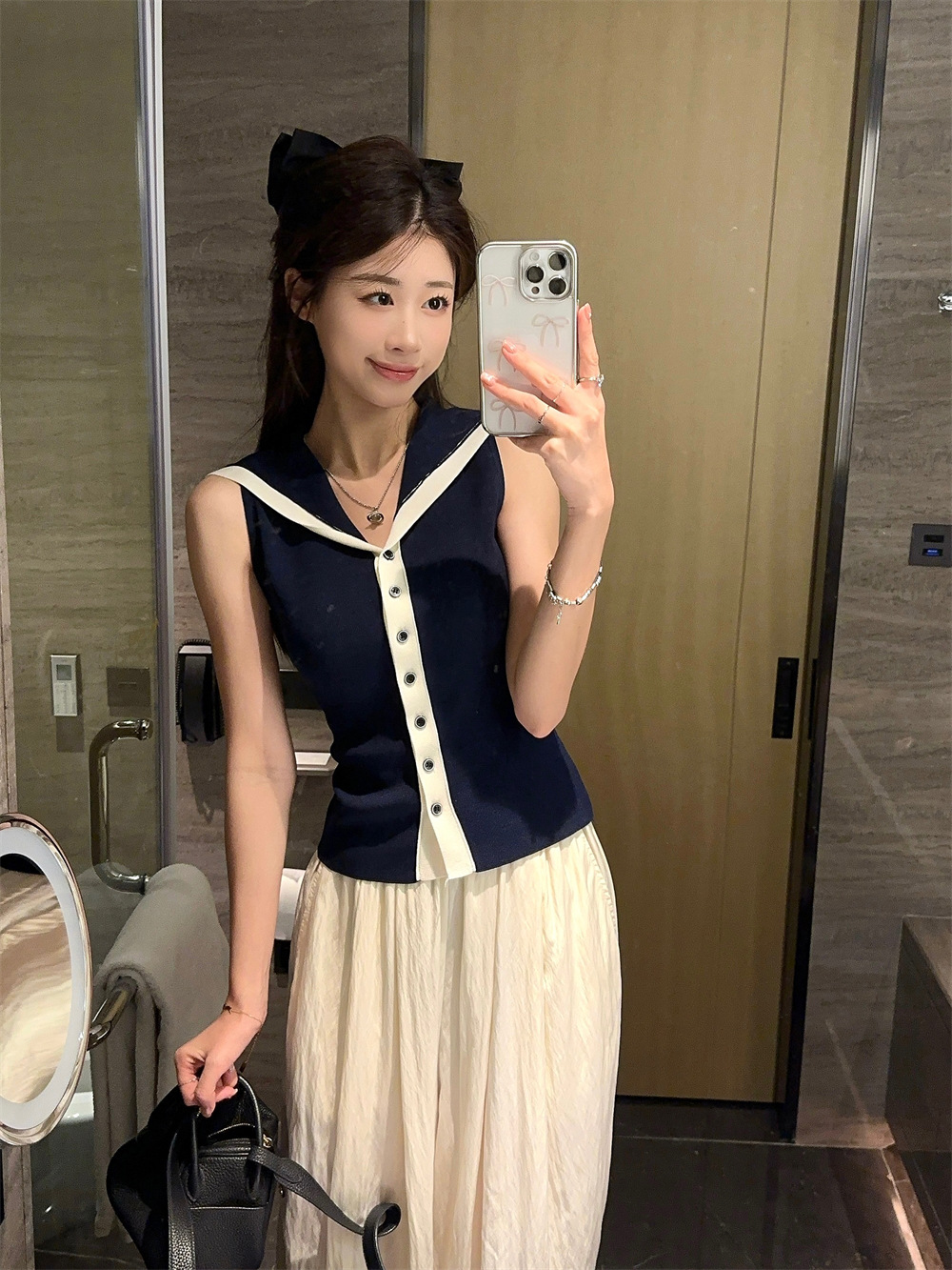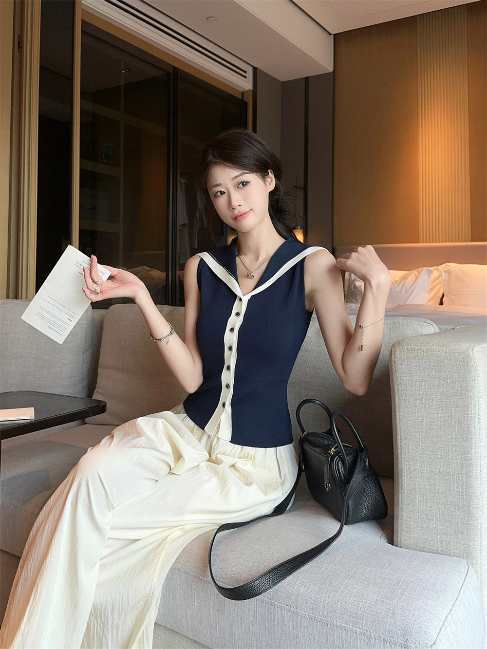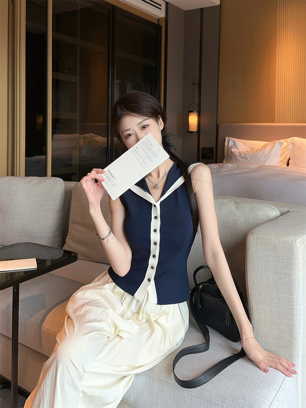 프렌치 레트로 콘트라스트 네이비 칼라 스웨터 여성 여름 뉴 스타일 아우터 아이스 실크 탑 슬림 핏 민소매 조끼 트렌디