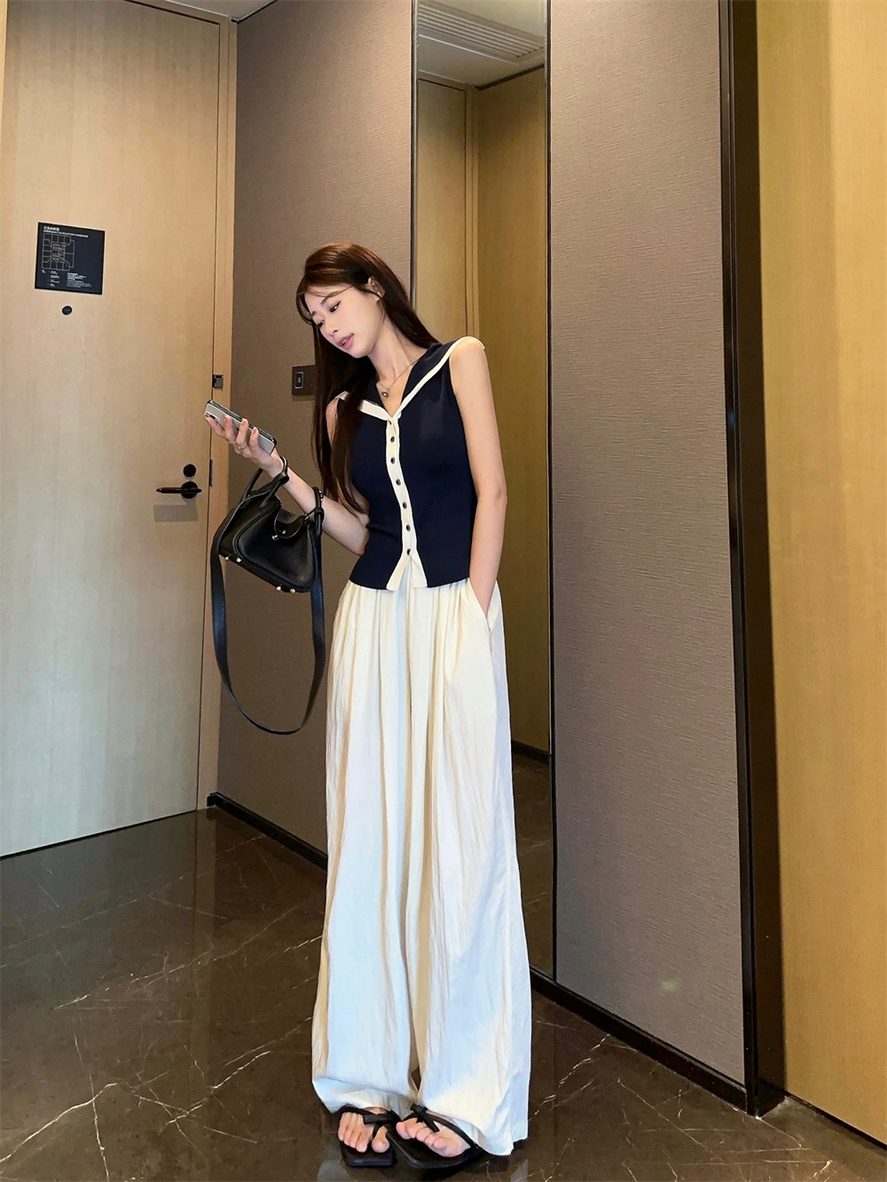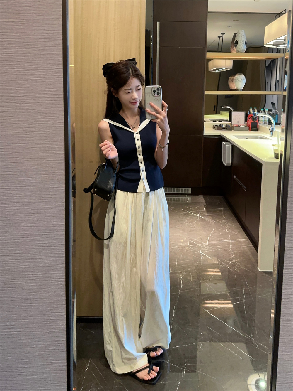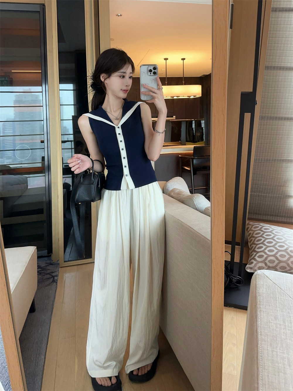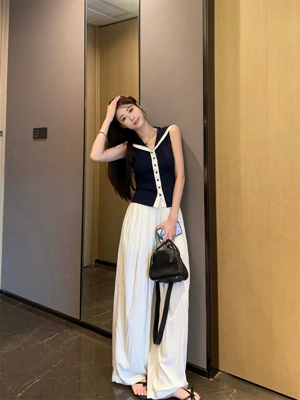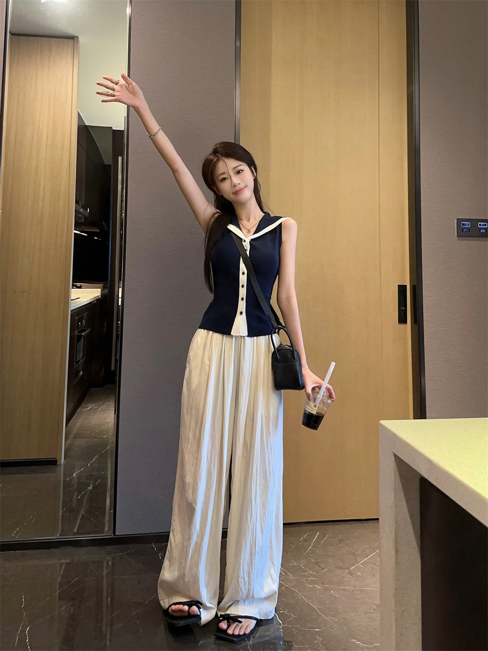 프렌치 레트로 콘트라스트 네이비 칼라 스웨터 여성 여름 뉴 스타일 아우터 아이스 실크 탑 슬림 핏 민소매 조끼 트렌디