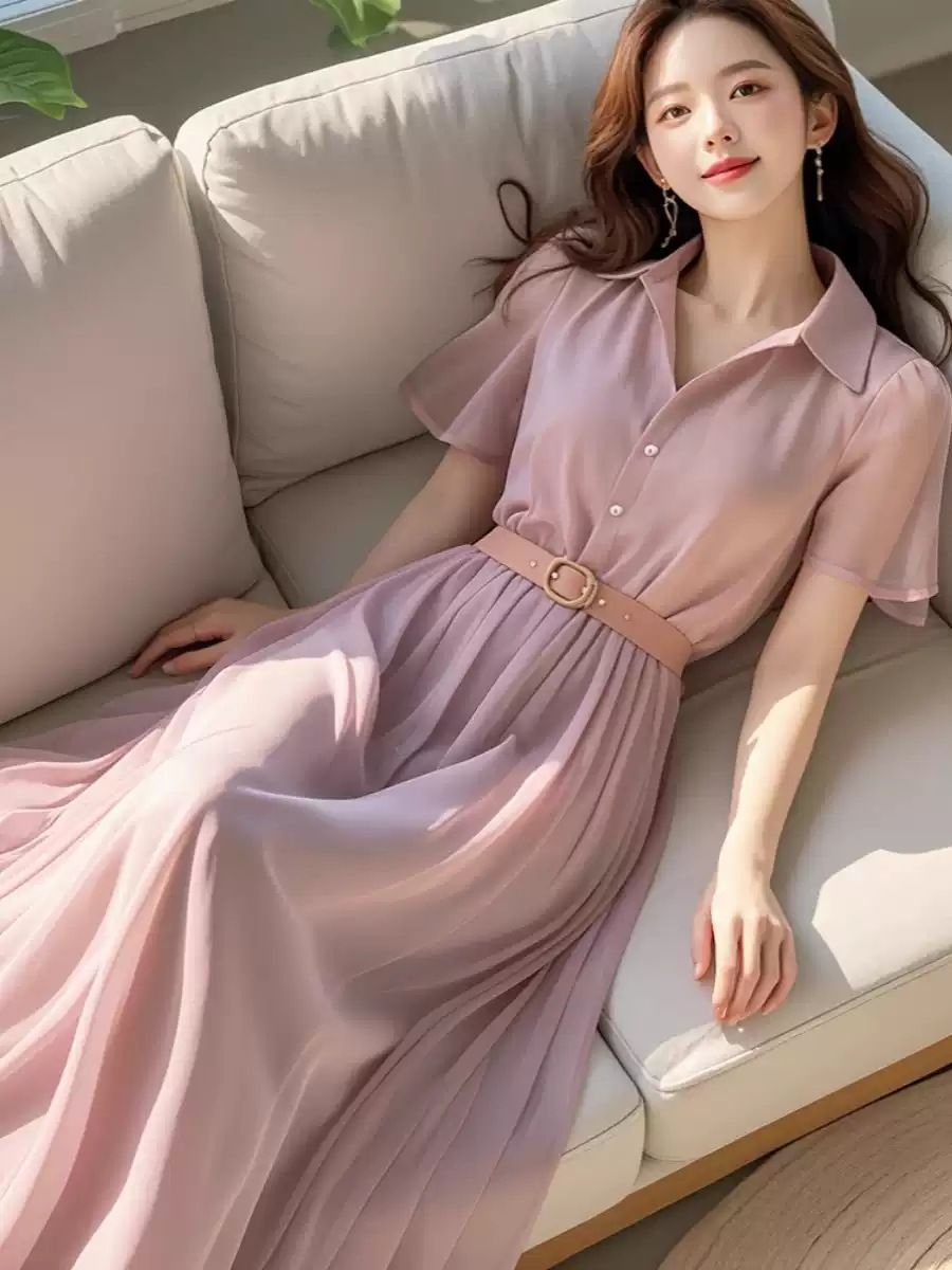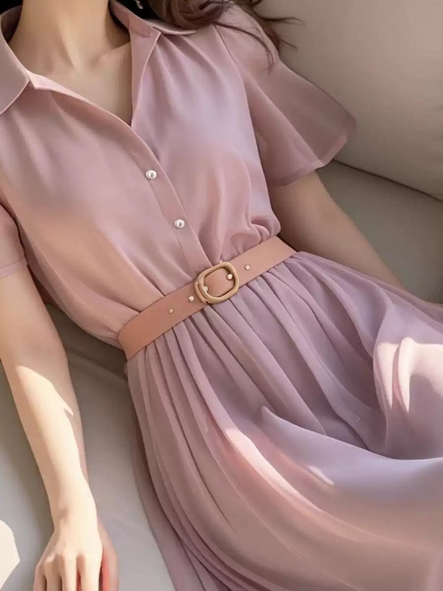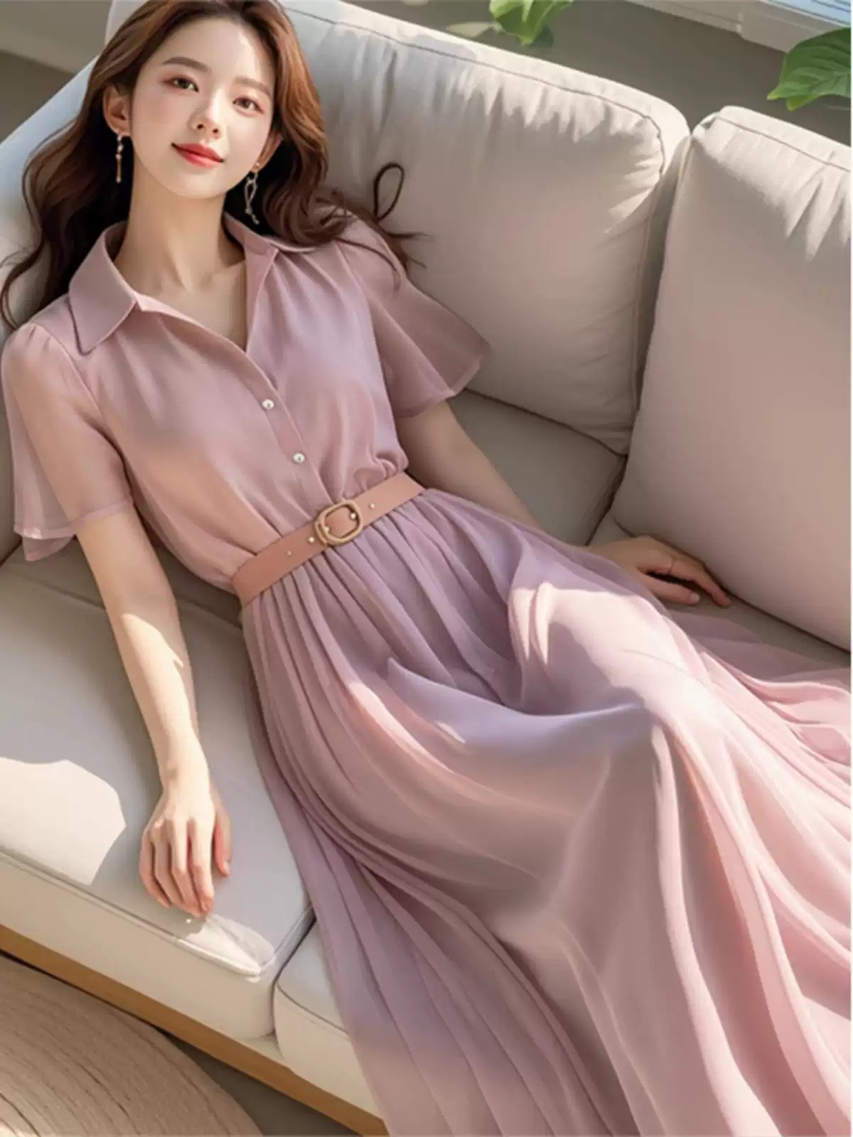 2025 년 새로운 여름 인기 올해의 단순하고 관대 한 고급 감각 단색 쉬폰 원피스 여성 원피스
