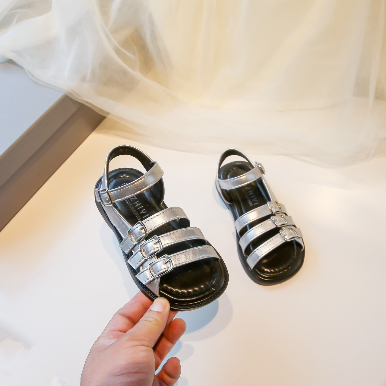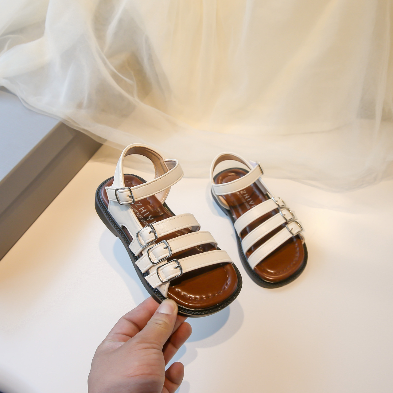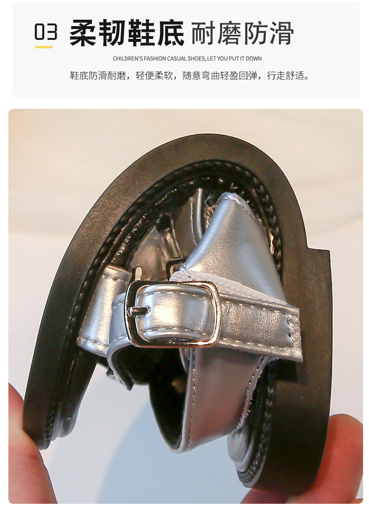 어린 소녀 오픈 토우 로마 샌들 2025 여름 새로운 한국 스타일 공주 신발 큰 어린이를위한 서양식 중공 해변 신발스토어 가기