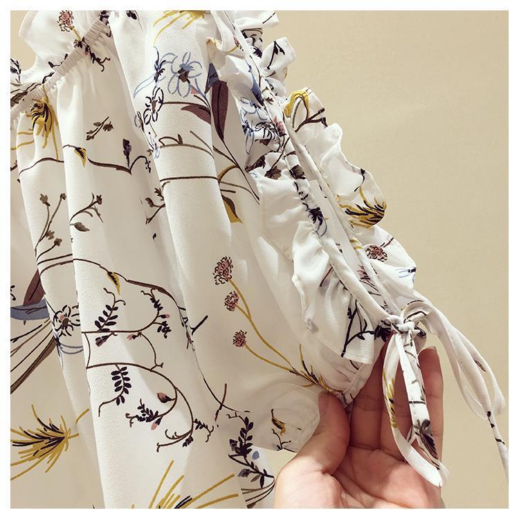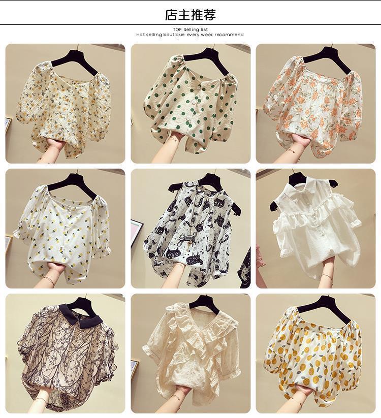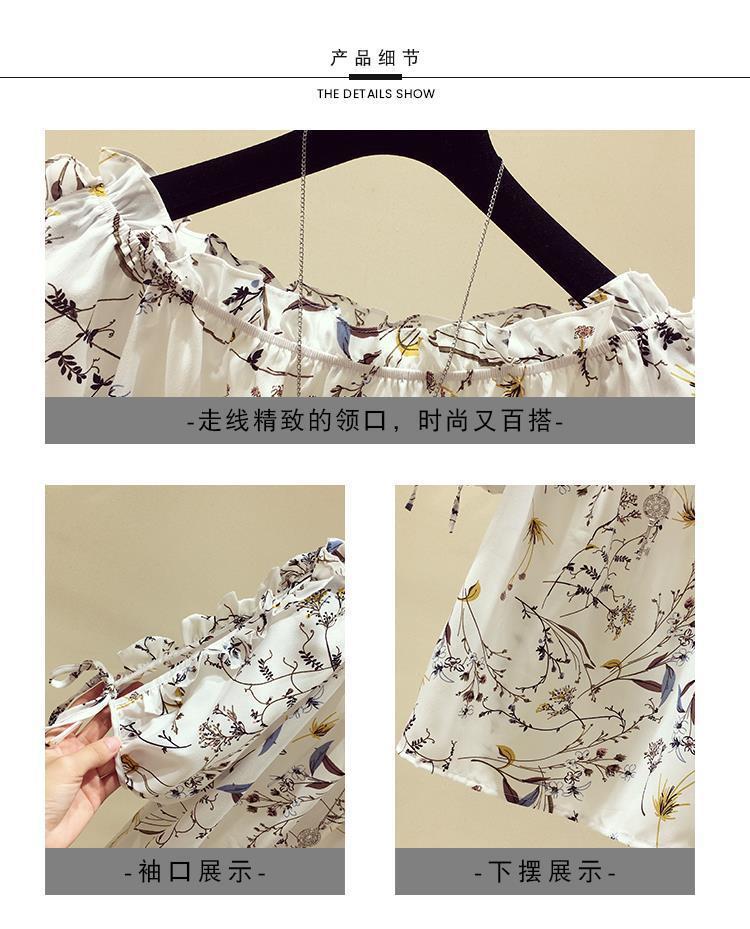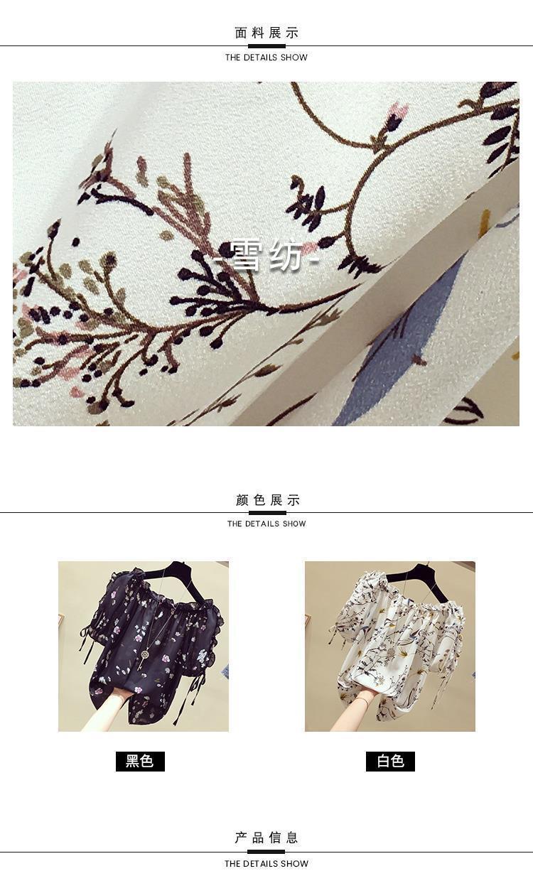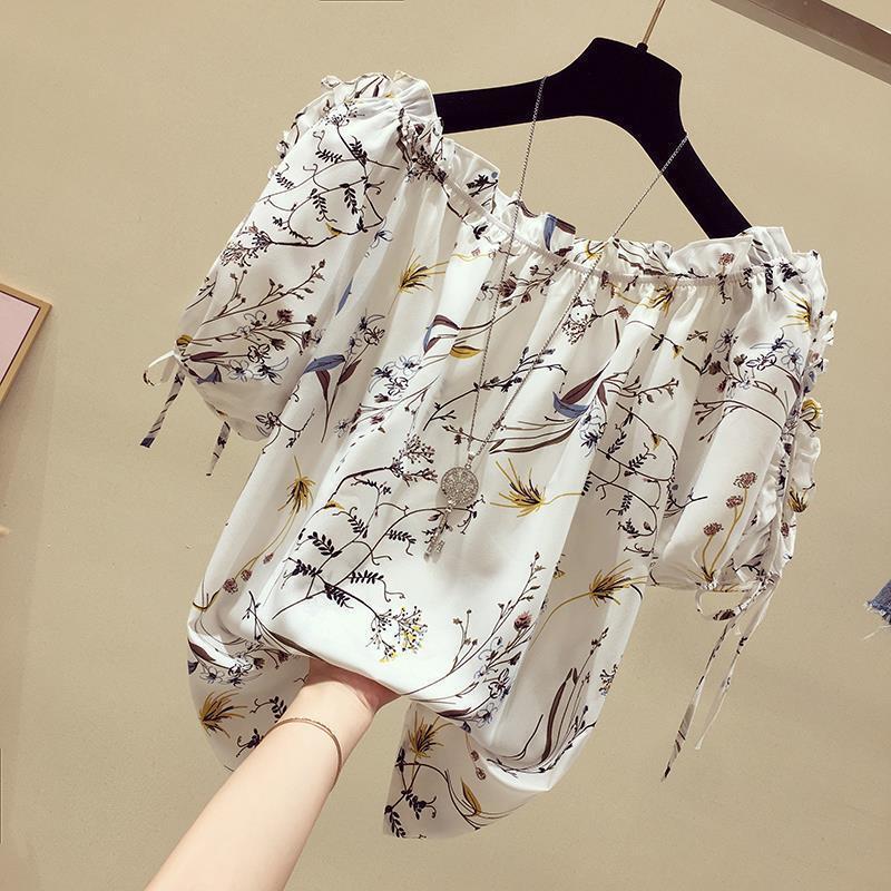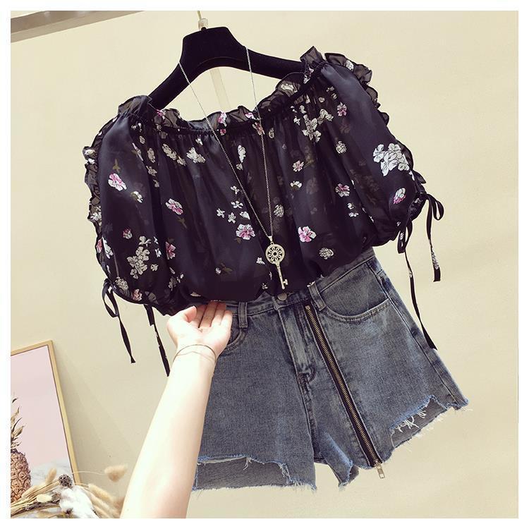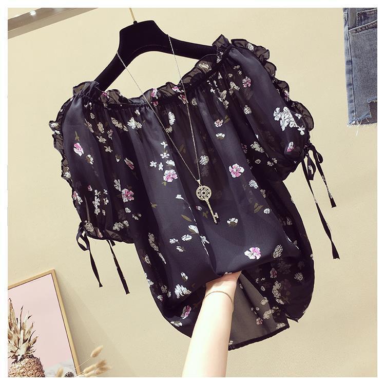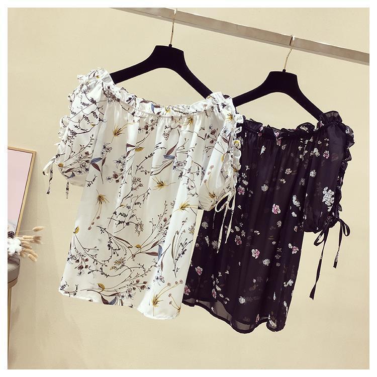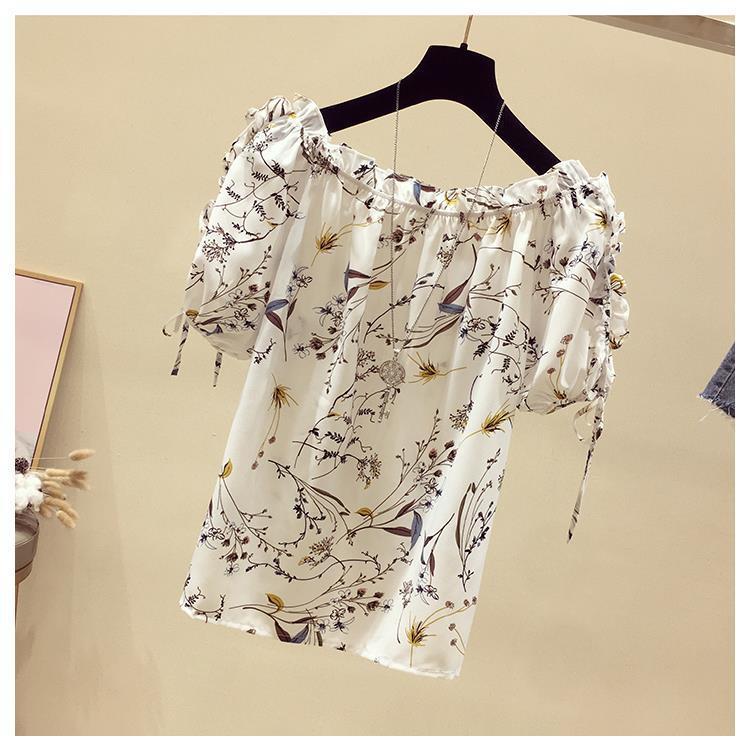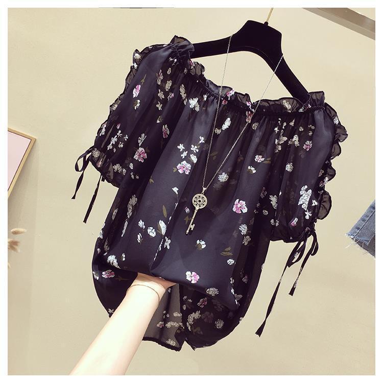 여성용 원 숄더 탑, 반팔 여름 신작 한국식 루즈하고 달콤한 배를 덮는 오프 숄더 꽃무늬 쉬폰 셔츠스토어 가기