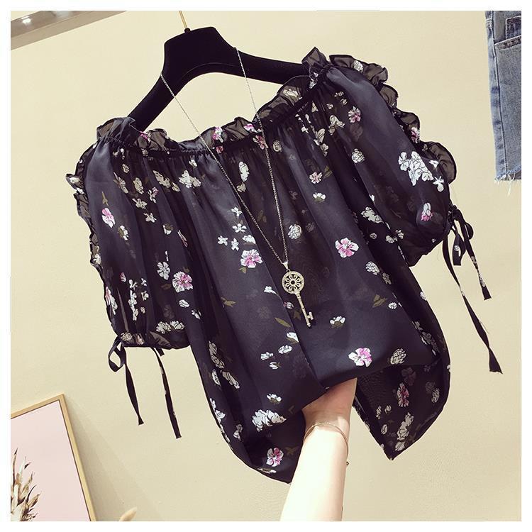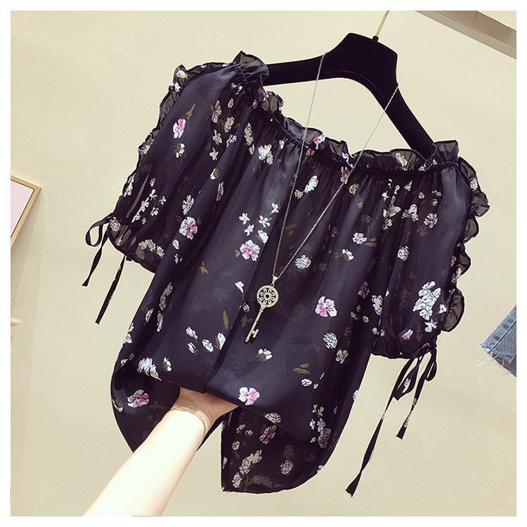 여성용 원 숄더 탑, 반팔 여름 신작 한국식 루즈하고 달콤한 배를 덮는 오프 숄더 꽃무늬 쉬폰 셔츠