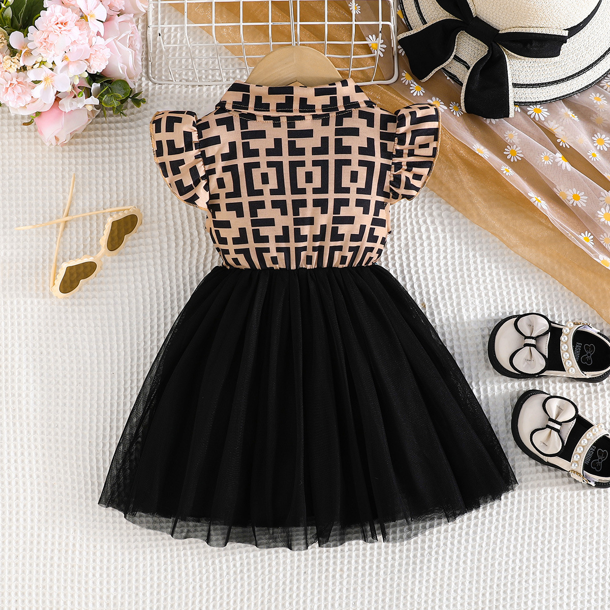 중소형 어린이를 위한 국경 간 전용 공급 - 여름 격자 무늬 패션 버전 스플라이스 플라잉 슬리브 드레스 드롭 배송스토어 가기