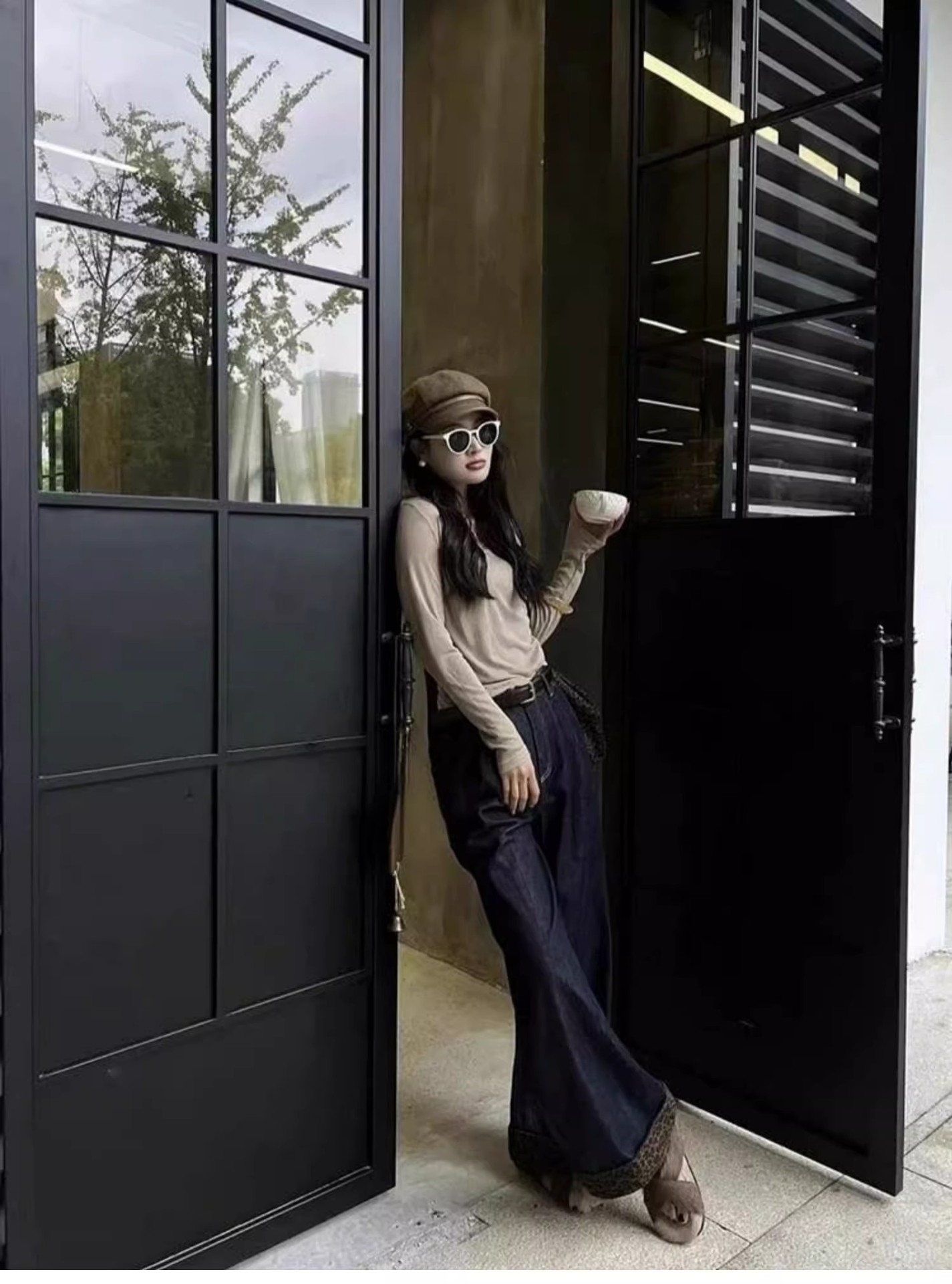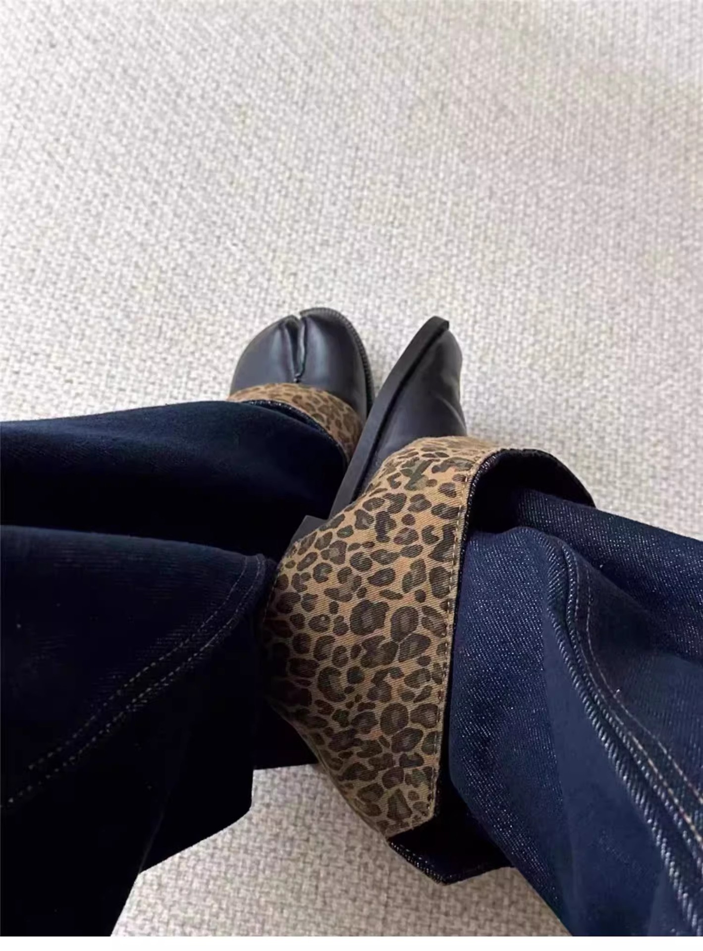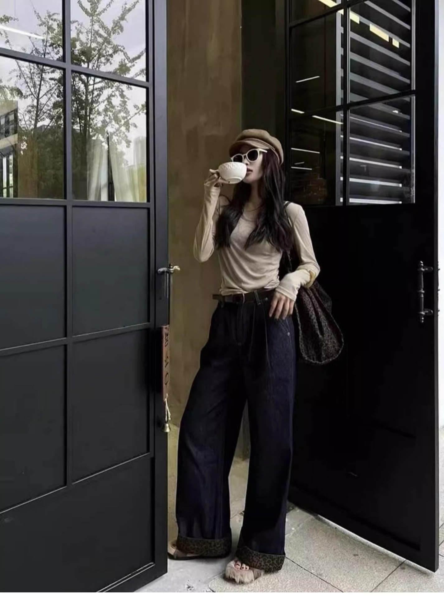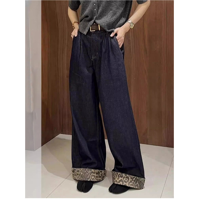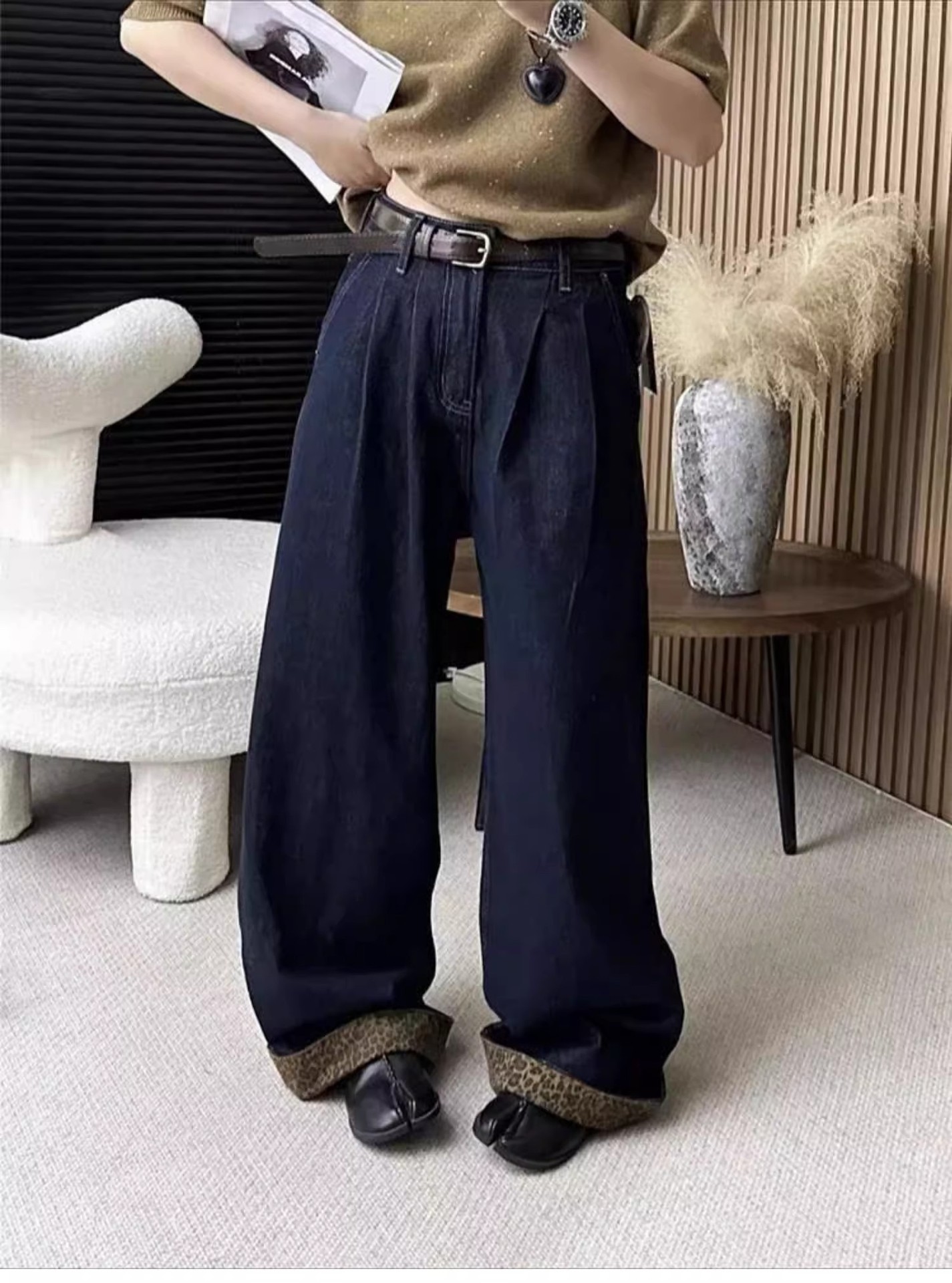 기모 두꺼운 레오파드 무늬 바느질 컬 청바지 여성 2024 년 겨울 신작 한국식 하이 웨이스트 슬리밍 스트레이트 레그 팬츠