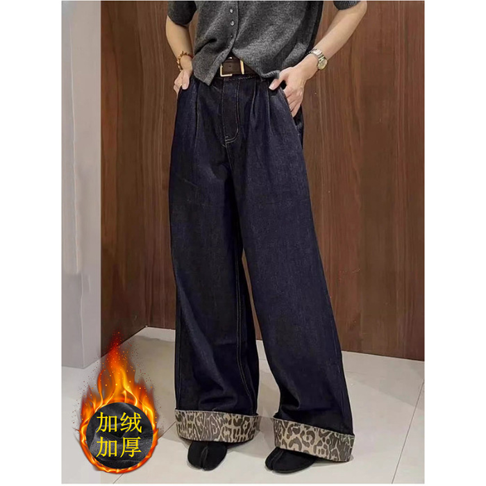 기모 두꺼운 레오파드 무늬 바느질 컬 청바지 여성 2024 년 겨울 신작 한국식 하이 웨이스트 슬리밍 스트레이트 레그 팬츠스토어 가기