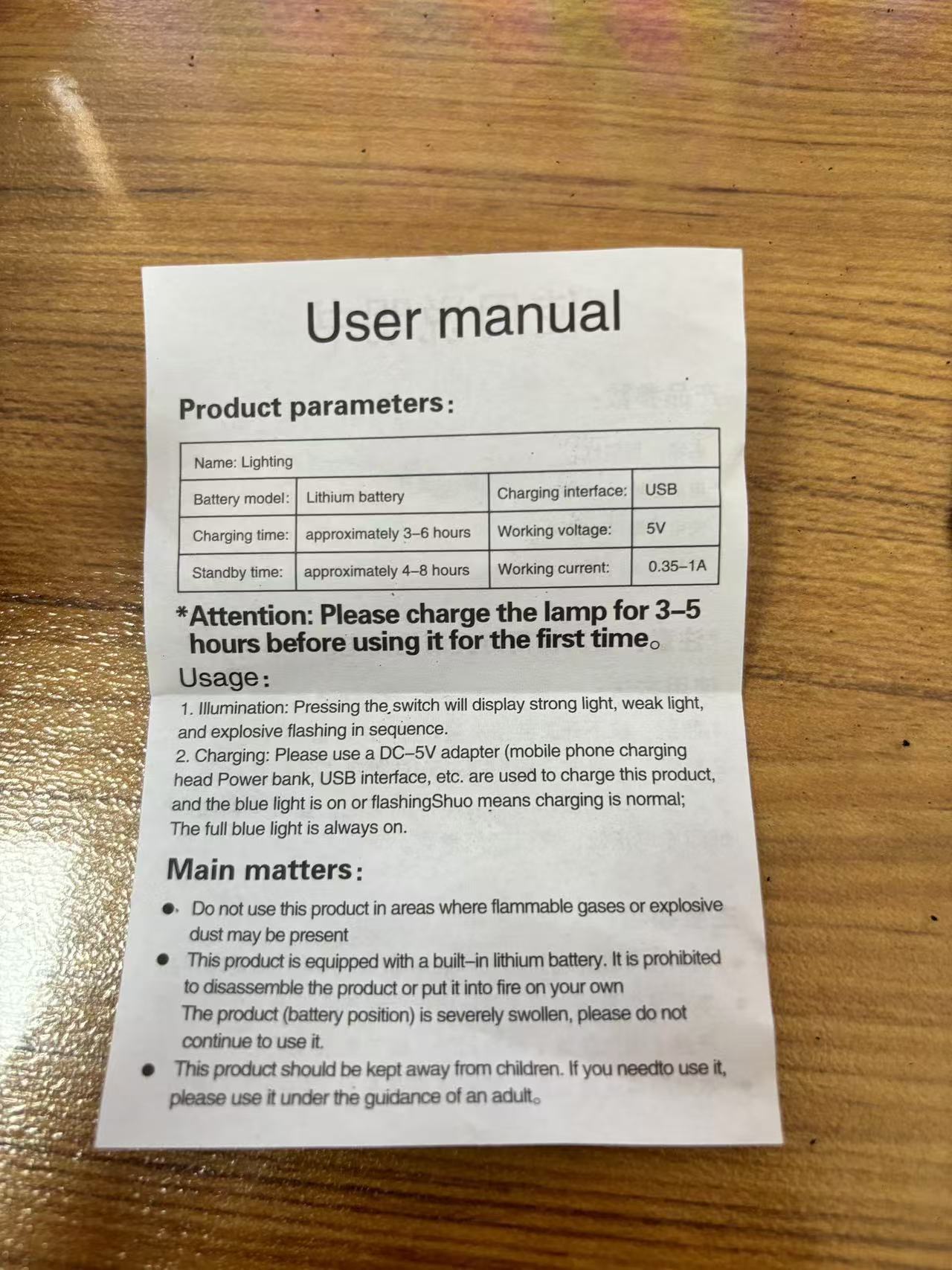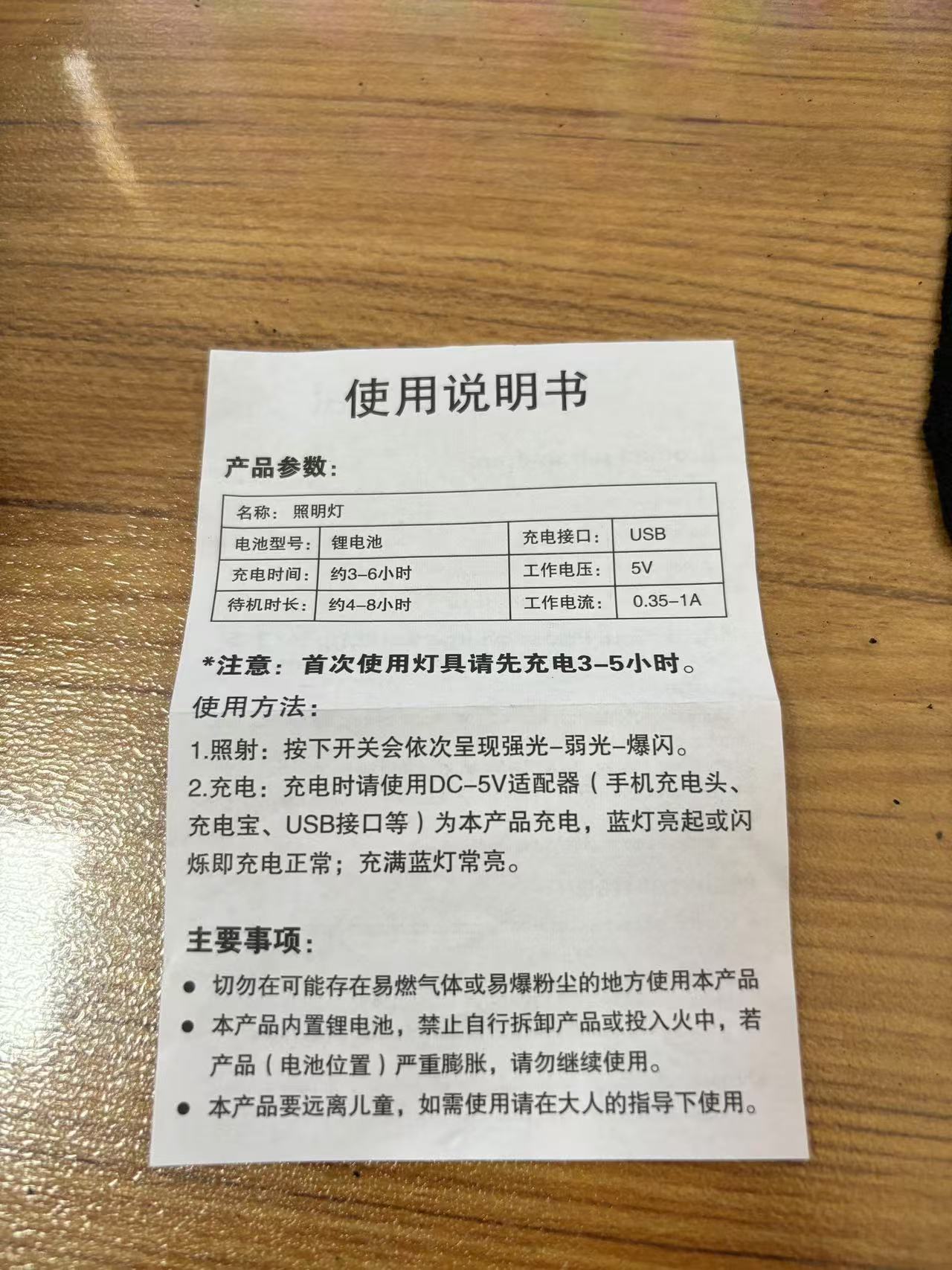 注意:首次使用灯具请先充电3-5小时。使用方法: