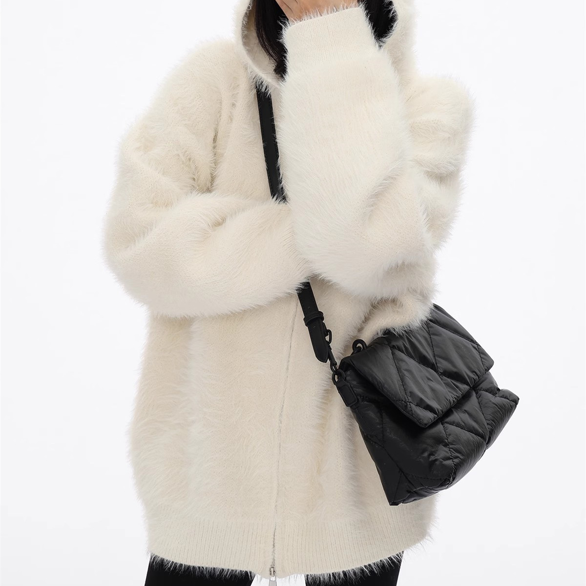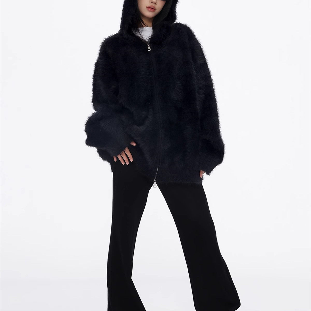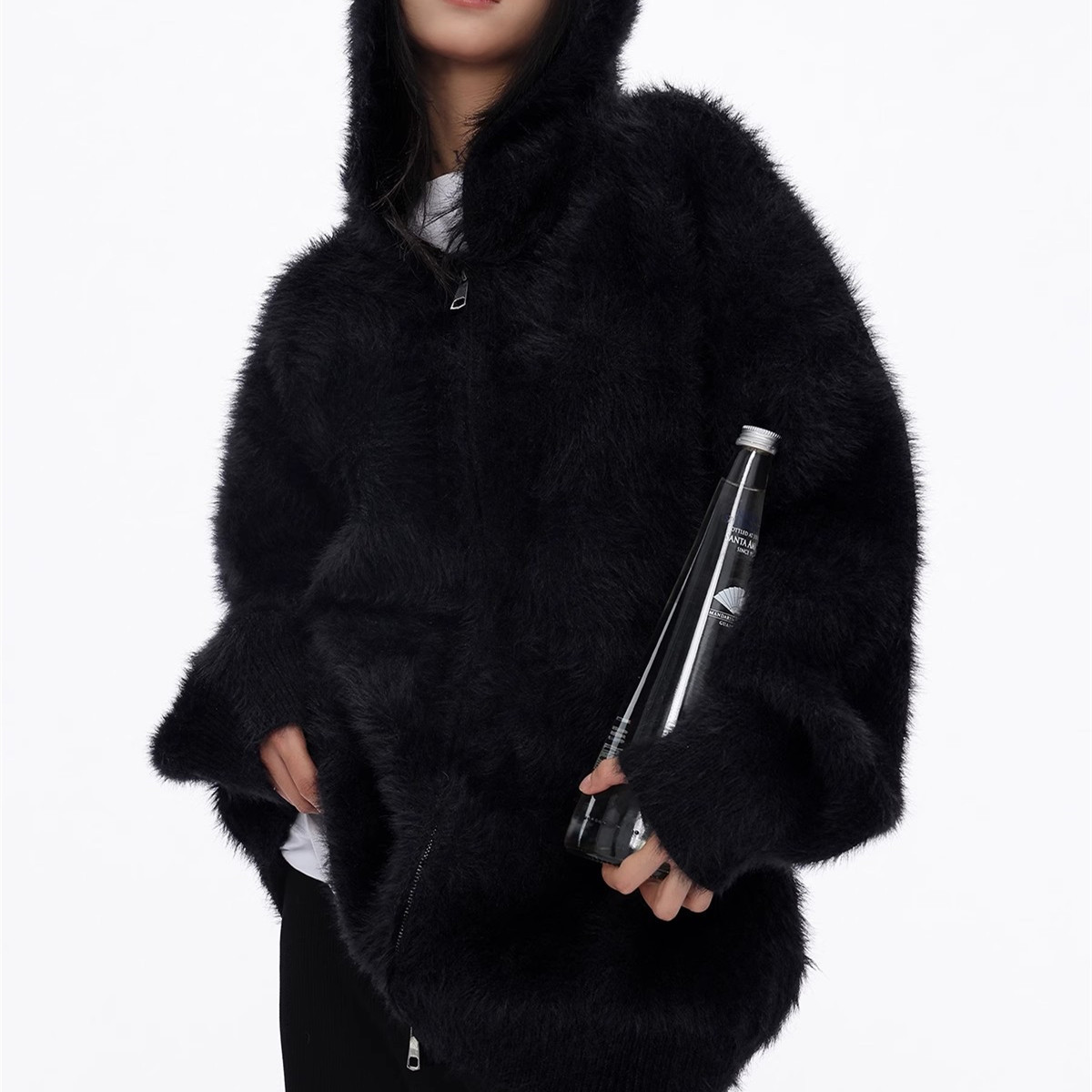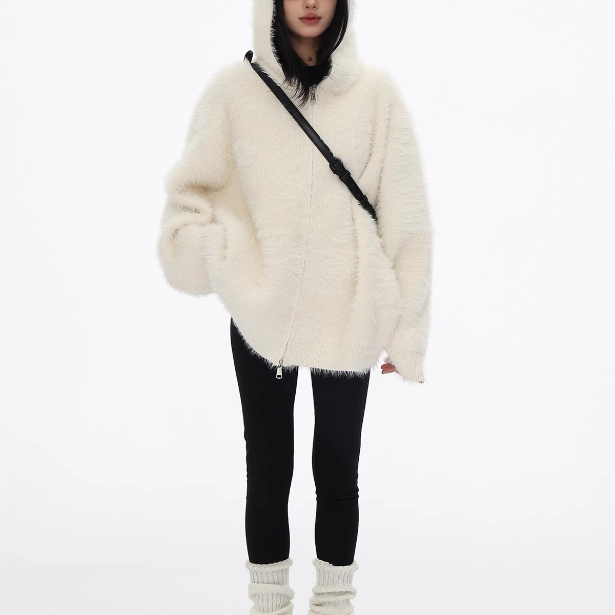 아메리칸 레트로 마오 후드 스웨터 카디건 여자 2024 년 겨울 새로운 캐주얼 올 매치 루즈 재킷 트렌디