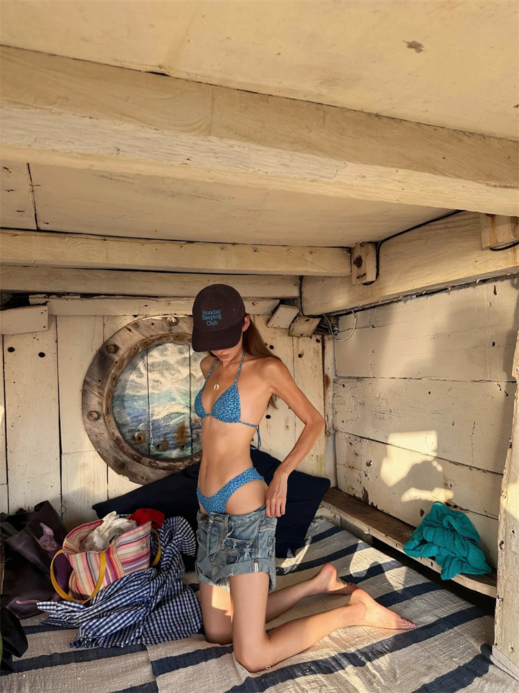 유명 인사 같은 스타일 교수형 목 스트랩 블루 레오파드 무늬 비키니 세트 고급 섹시 노 스틸 링 작은 가슴 수집 수영복스토어 가기